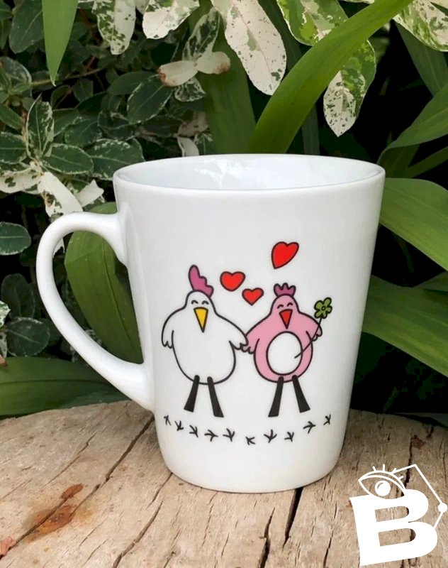 Cup with chicken and heart patterns in excellent condition. Height 10.2 cm, Diameter 9 cm.