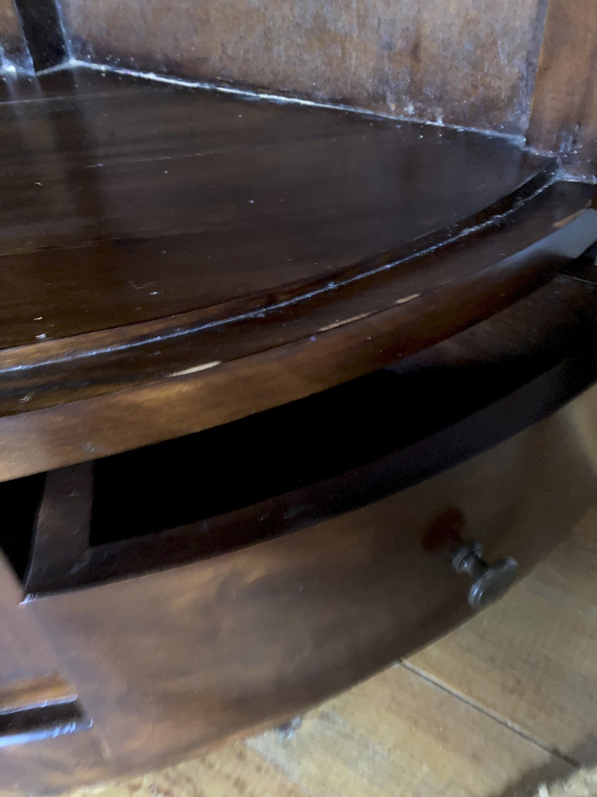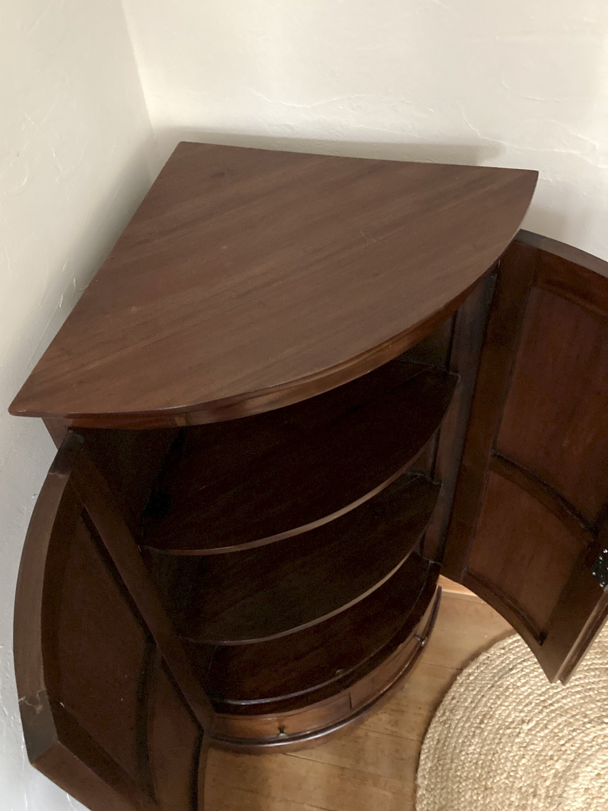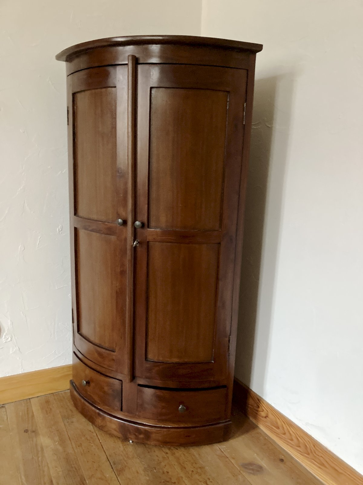Small curved corner cabinet in varnished wood, with two doors, two drawers, and three shelves.