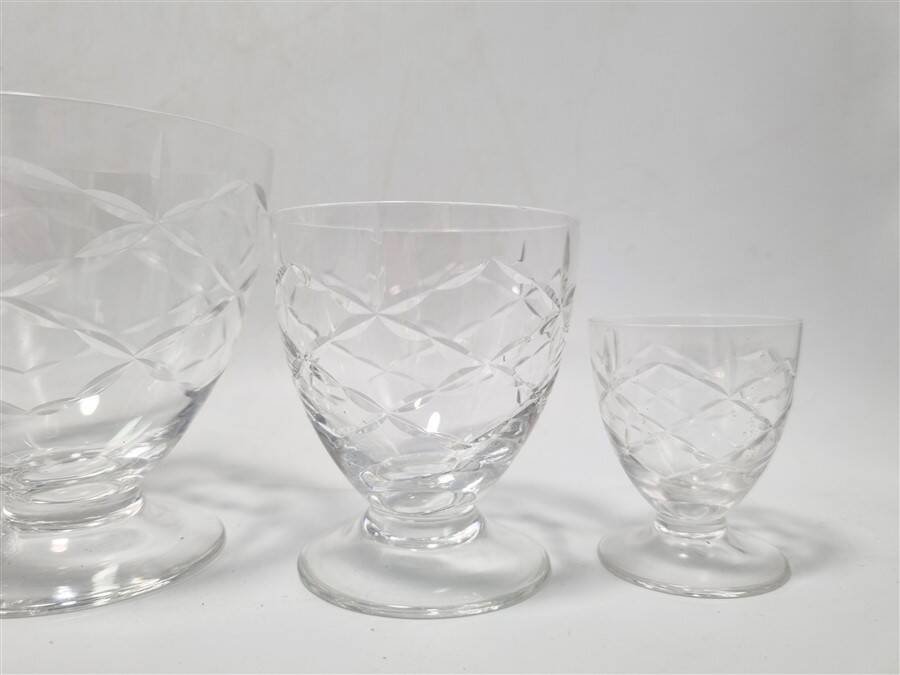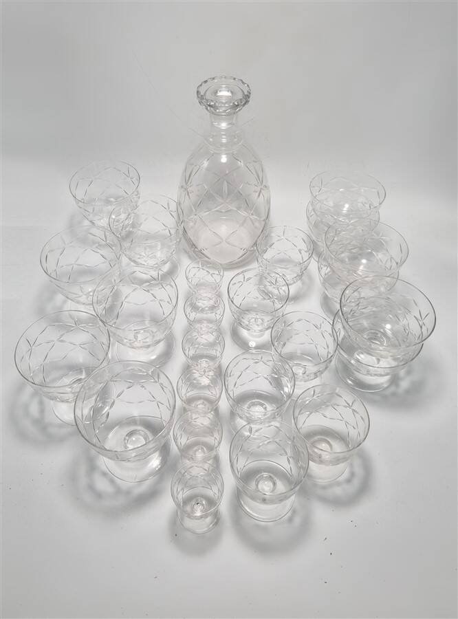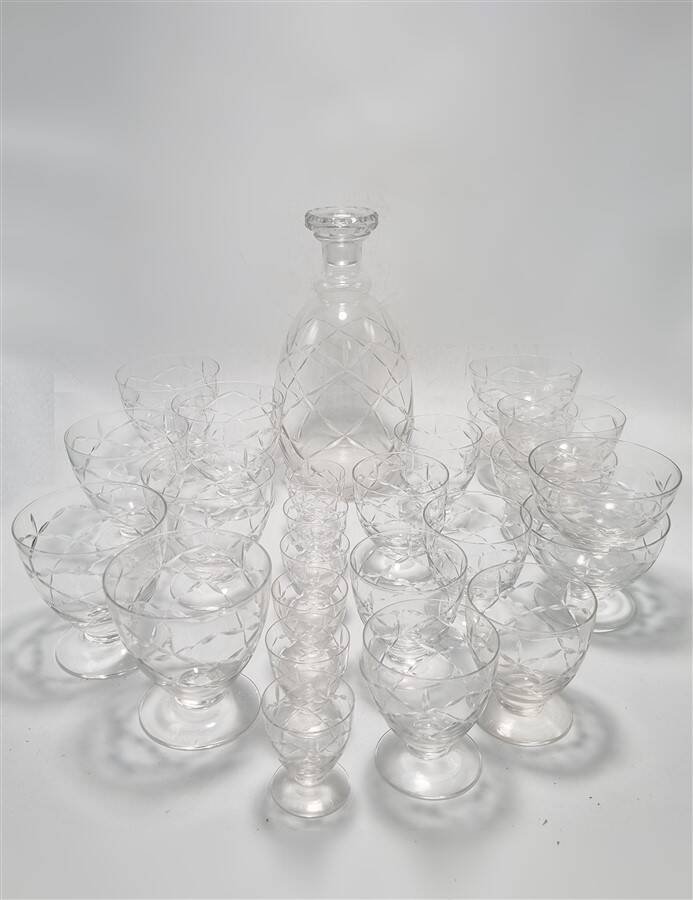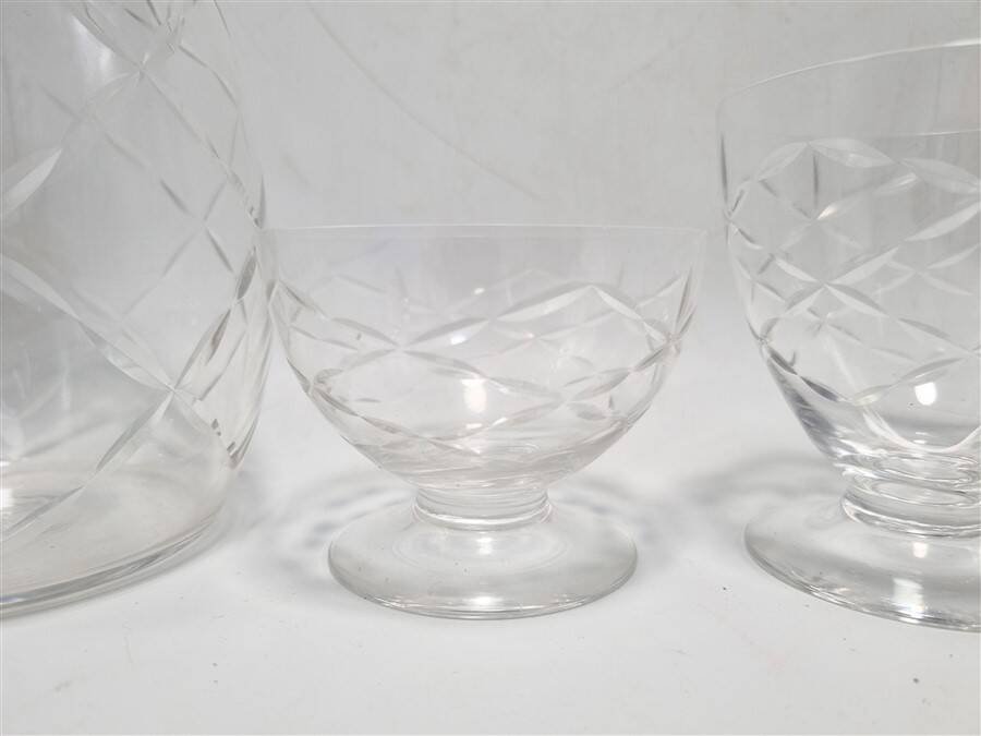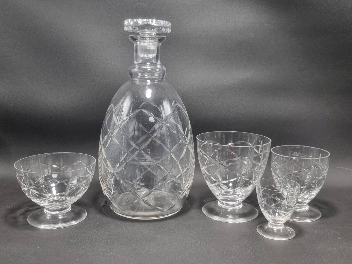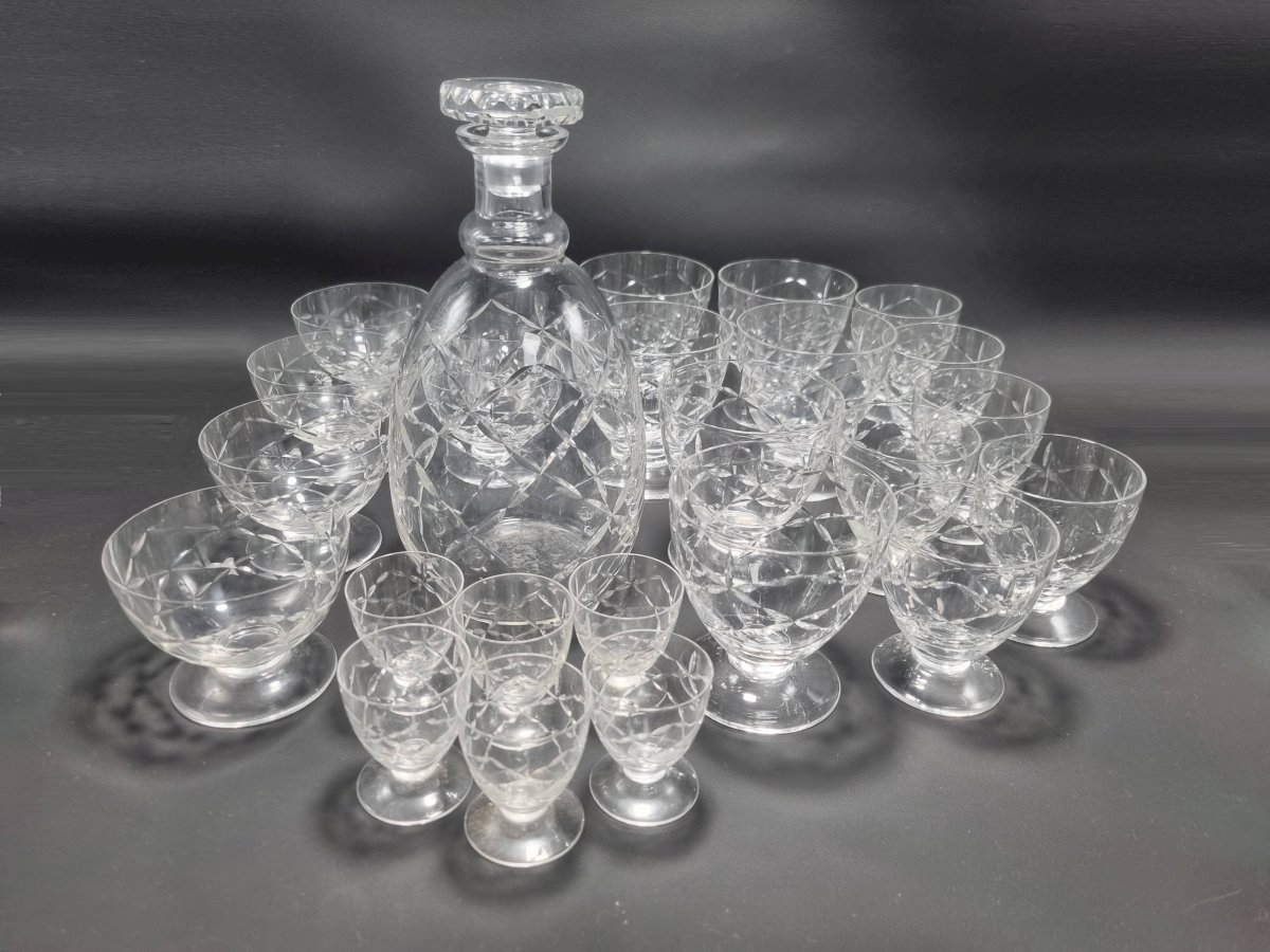 Daum Nancy France service consisting of: 6 champagne cups (6.6 X ø 8.7 cm) 6 water glasses (9.1 X ø 8.7 cm) 6 wine glasses (7.5 X ø 6.5 cm) 6 liqueur or white wine glasses (5.4 X ø 4.5 cm) One carafe (22 cm) The carafe is signed, the glasses are not. Total weight approximately 3 kg. L: 6 l: 6 H: 8