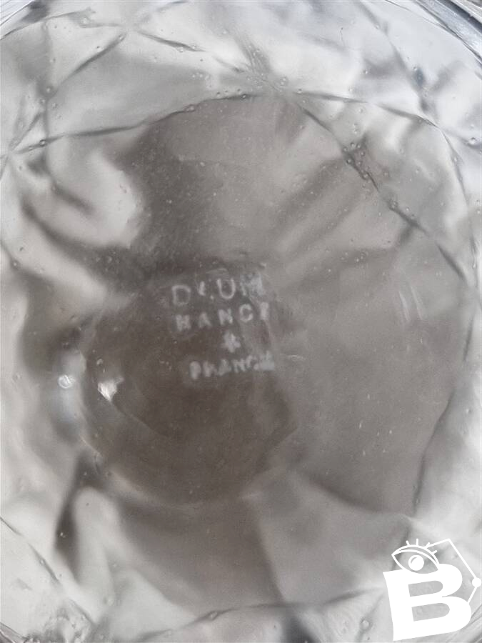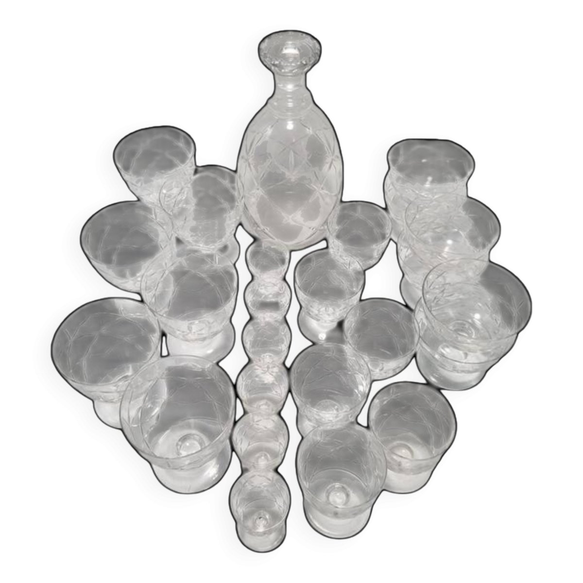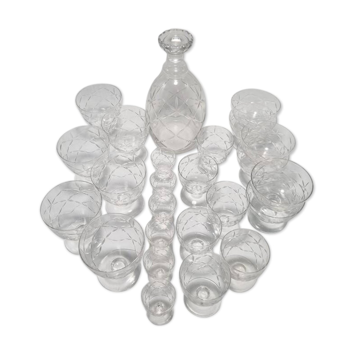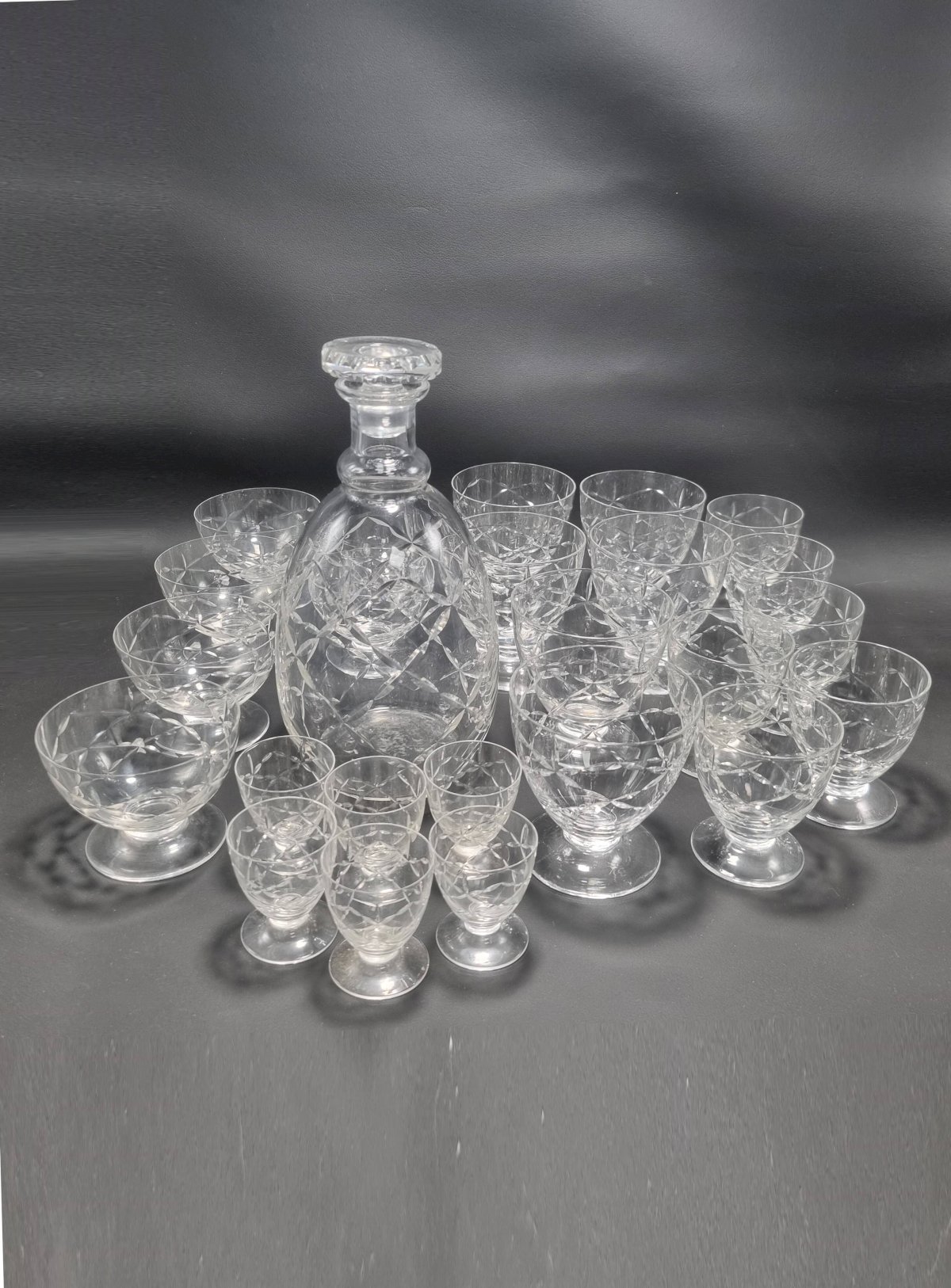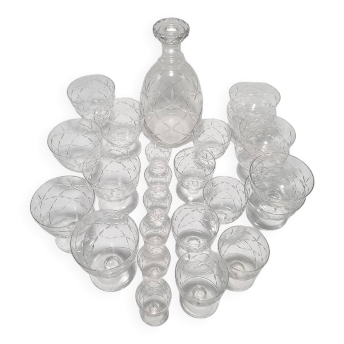 Daum Nancy France service consisting of: 6 champagne cups (6.6 X ø 8.7 cm) 6 water glasses (9.1 X ø 8.7 cm) 6 wine glasses (7.5 X ø 6.5 cm) 6 liqueur or white wine glasses (5.4 X ø 4.5 cm) One carafe (22 cm) The carafe is signed, the glasses are not. Total weight approximately 3 kg. L: 6 l: 6 H: 8