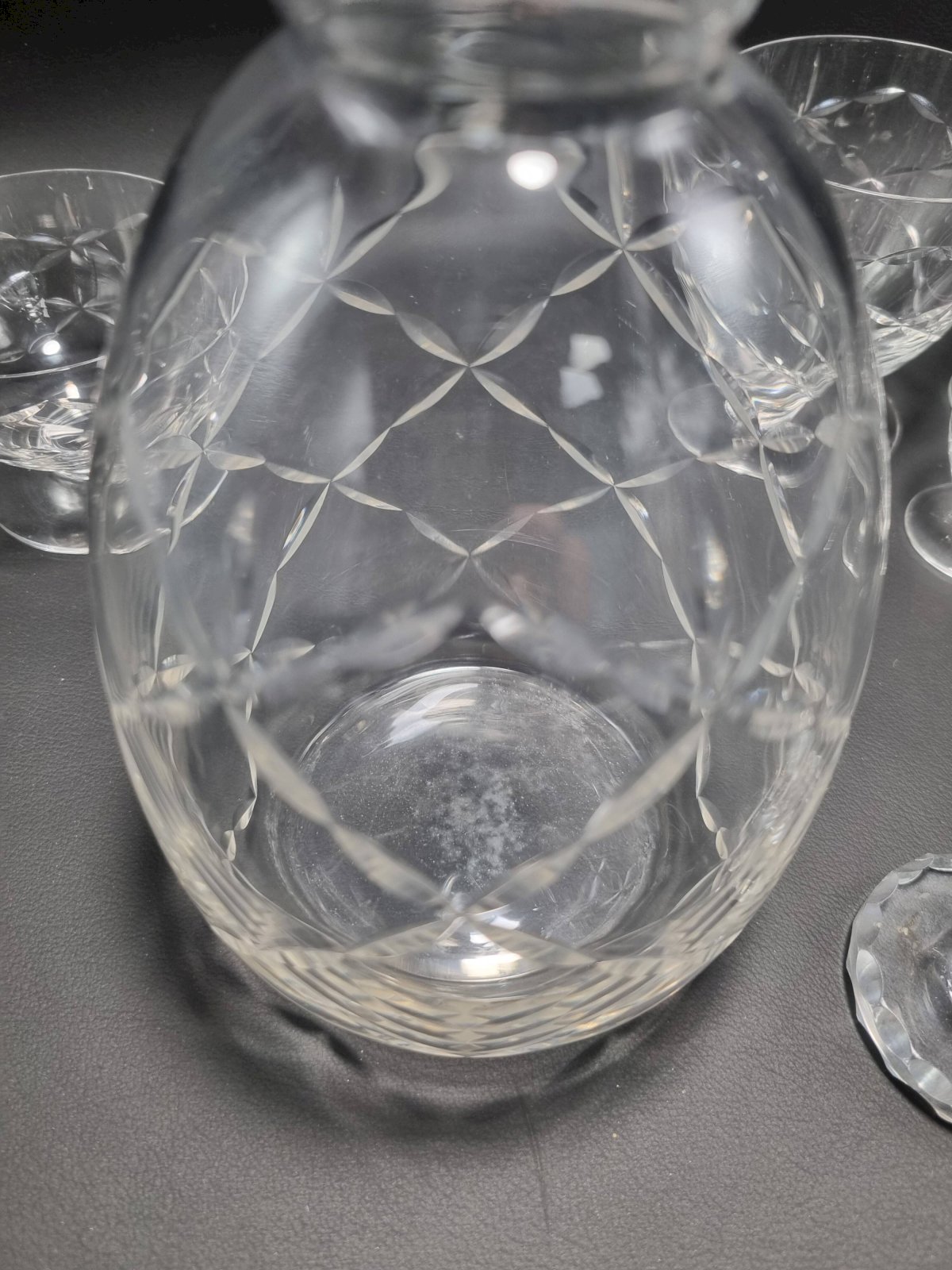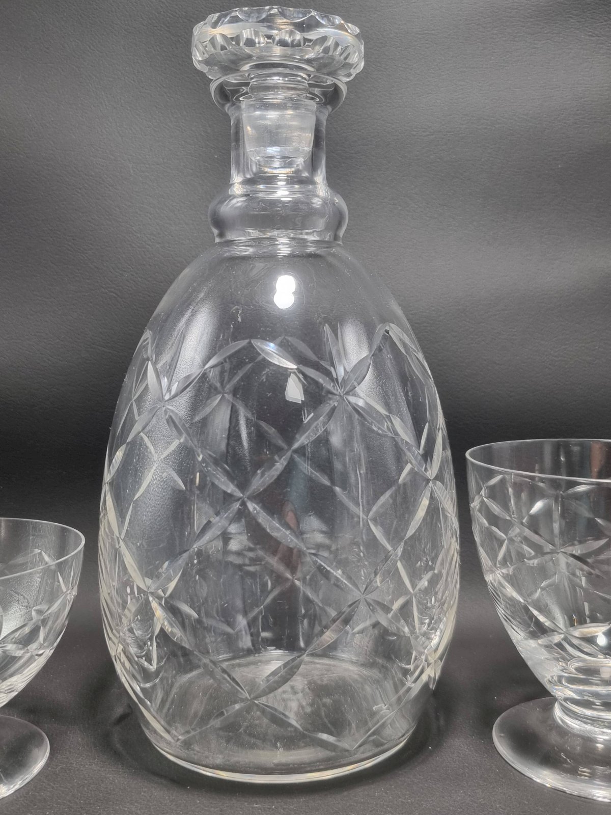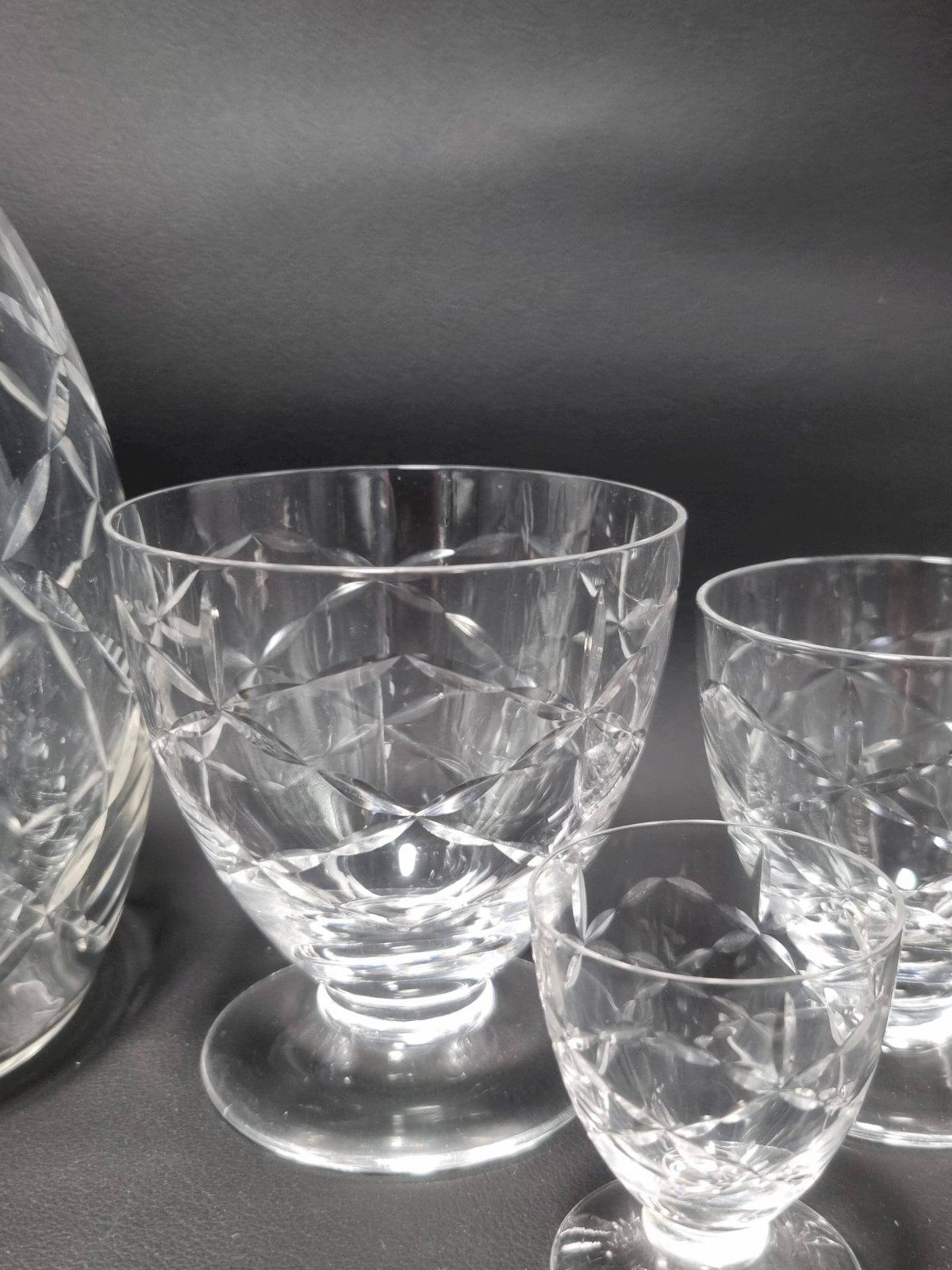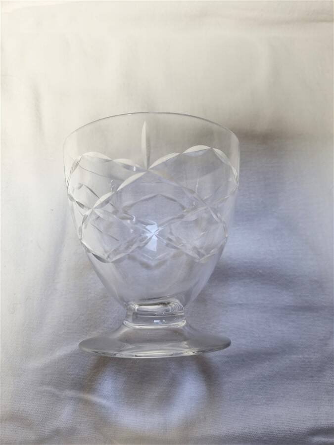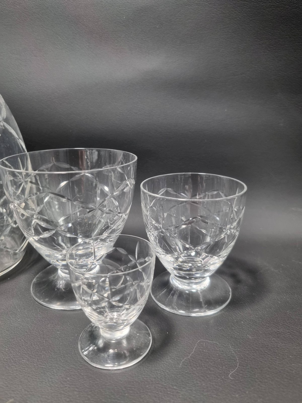 Daum Nancy France service consisting of: 6 champagne cups (6.6 X ø 8.7 cm) 6 water glasses (9.1 X ø 8.7 cm) 6 wine glasses (7.5 X ø 6.5 cm) 6 liqueur or white wine glasses (5.4 X ø 4.5 cm) One carafe (22 cm) The carafe is signed, the glasses are not. Total weight approximately 3 kg. L: 6 l: 6 H: 8