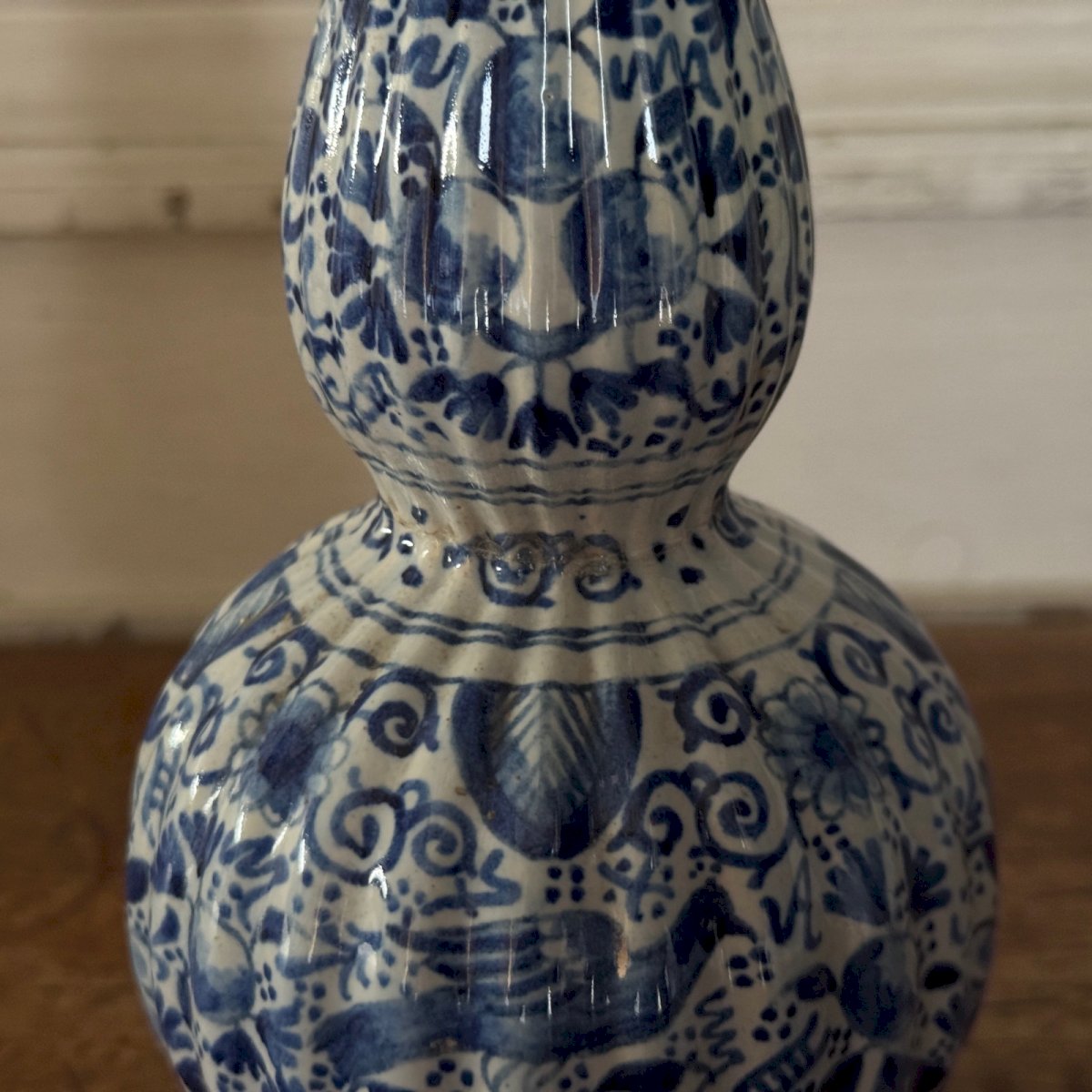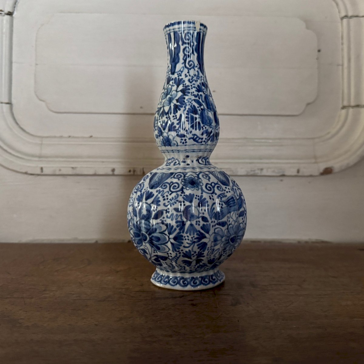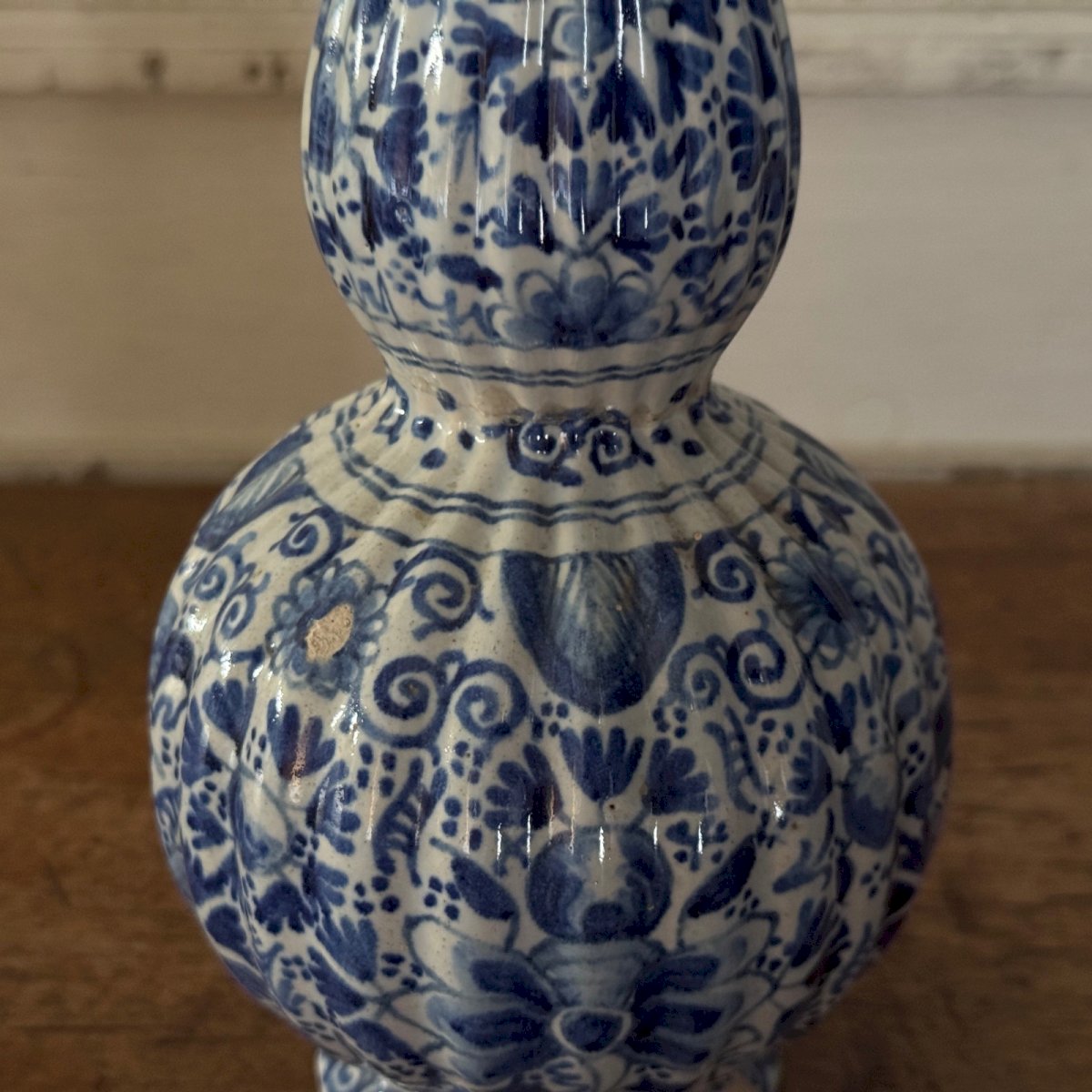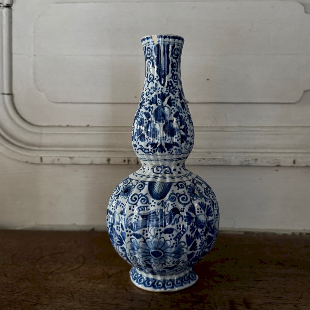 Delft earthenware gourd with 18th-century signature M3640 This 18th-century earthenware gourd is signed "JV" and is of beautiful craftsmanship. Unfortunately, we note damages in several places, two chips at the neck, a chip on the belly, a missing part at the base, and some scratches. Our photos allow you to appreciate the quality of the item. For the condition, please refer to the detailed photos. Do not hesitate to zoom in. The photos are an integral part of the description. Dimensions: Height: 20.5 cm Neck diameter: 3.5 cm Belly diameter: there are two Base diameter: 6 cm S: SH25HPY5 I remain at your disposal for any questions. Type: Showcase object, Decorative Subtype: Vase Height: 20.5 cm Material: Earthenware Length: cm Width: cm