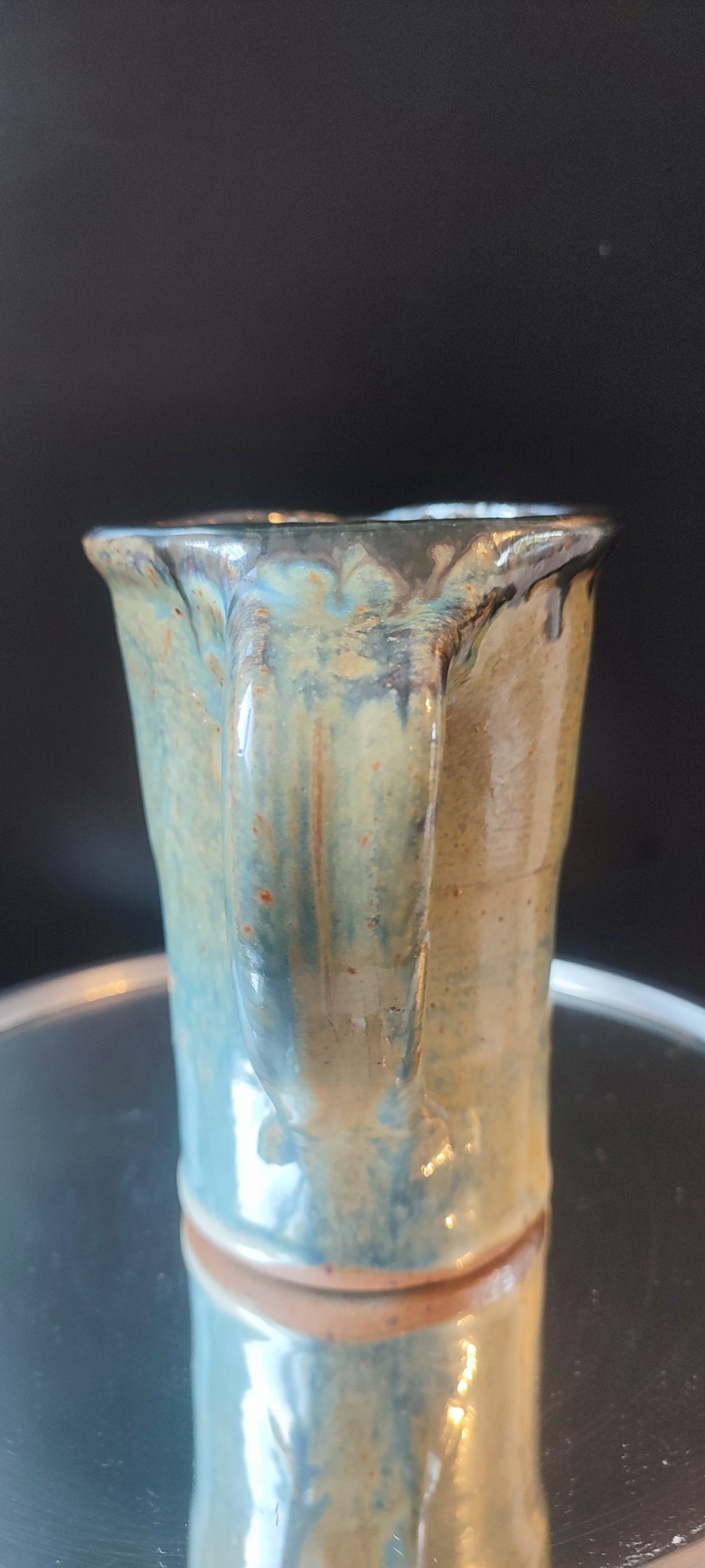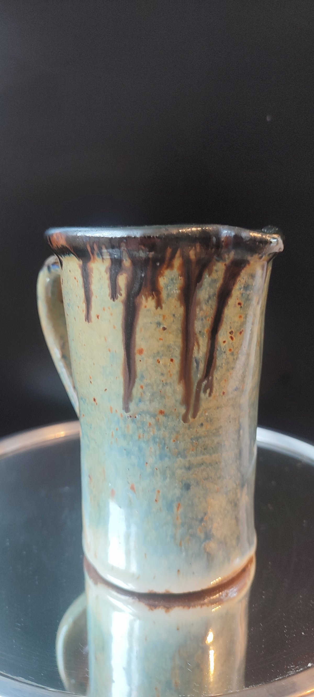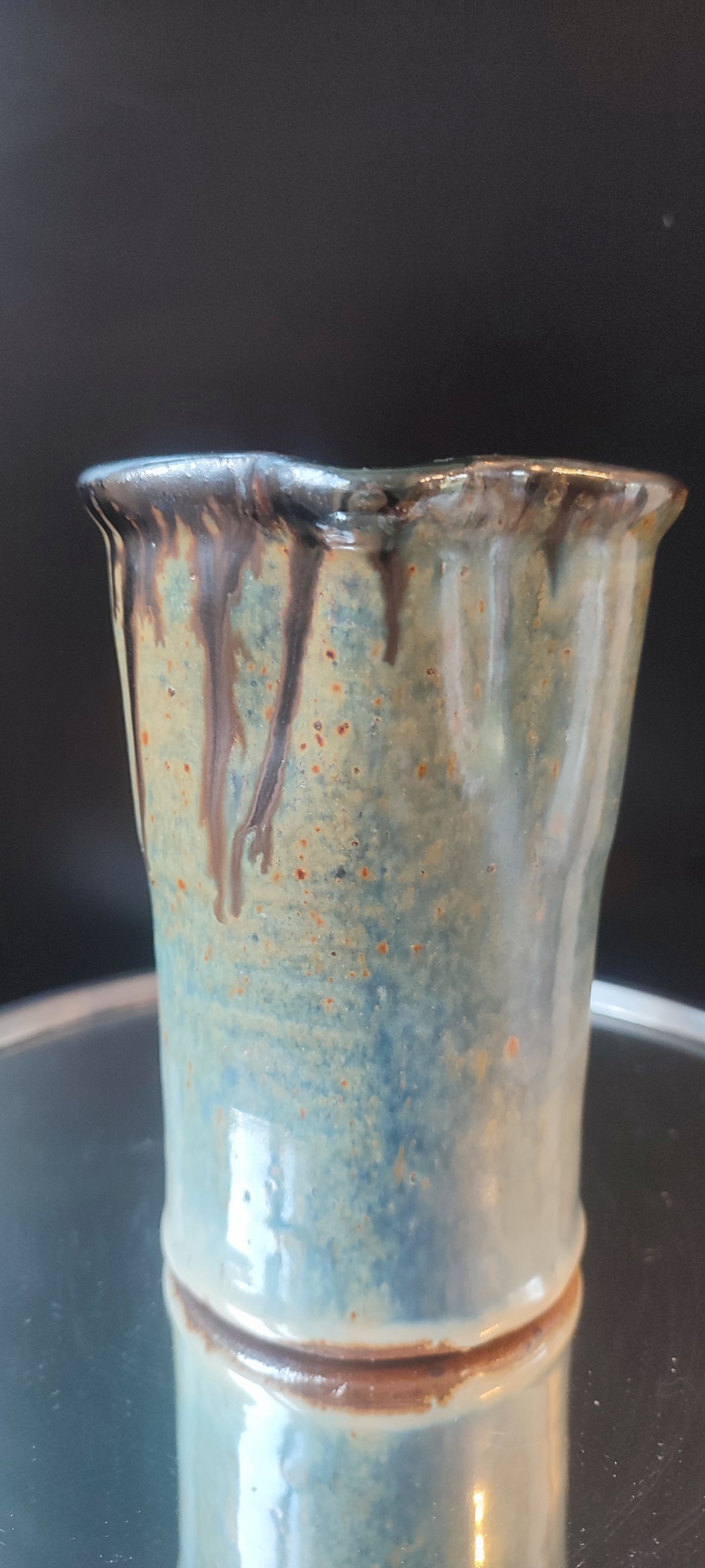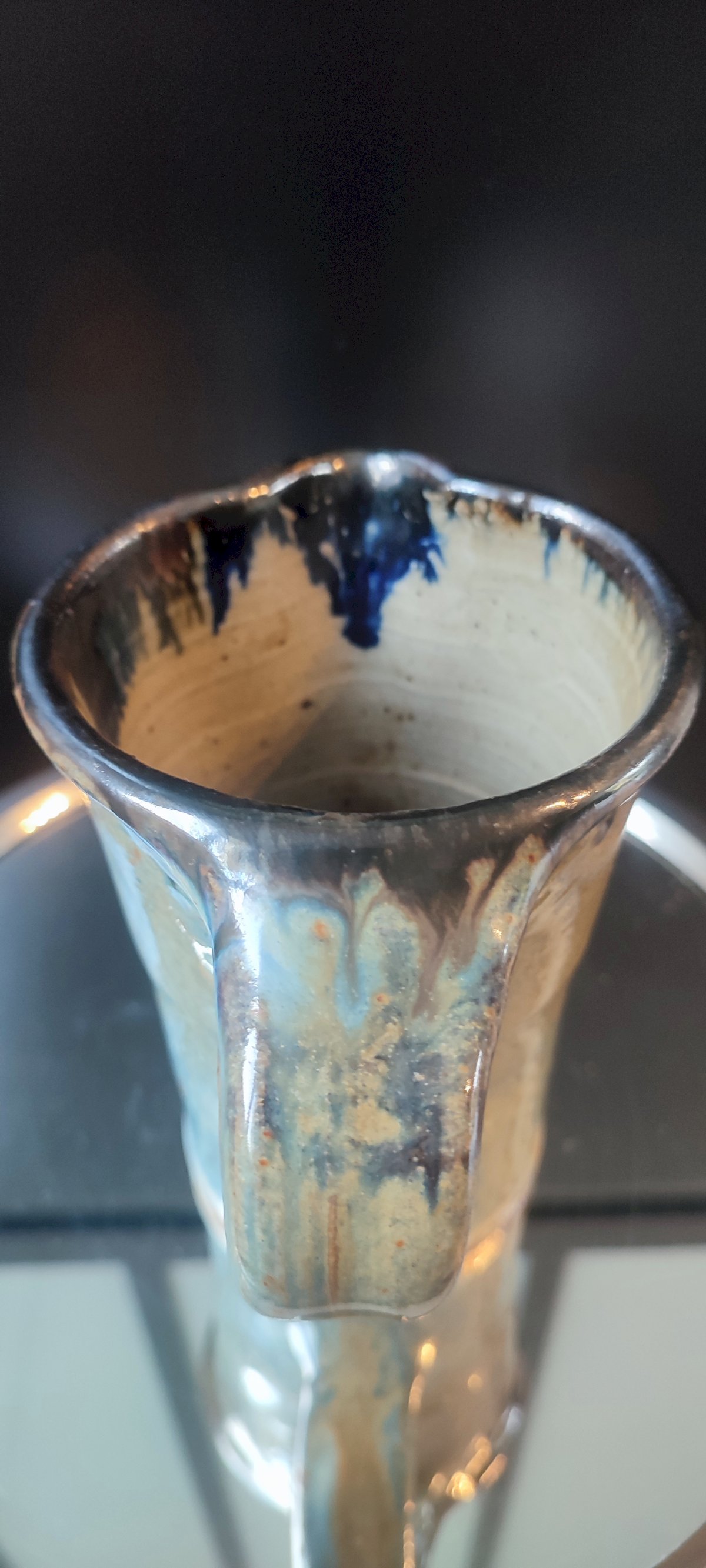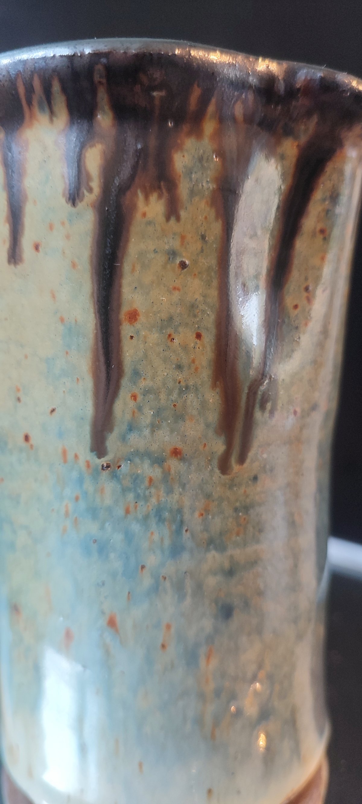 Decoration with brown drips on a blue/yellow/orange/khaki background, with a beautiful metallic appearance typical of pyrite stoneware. A sober, balanced, and very decorative piece.