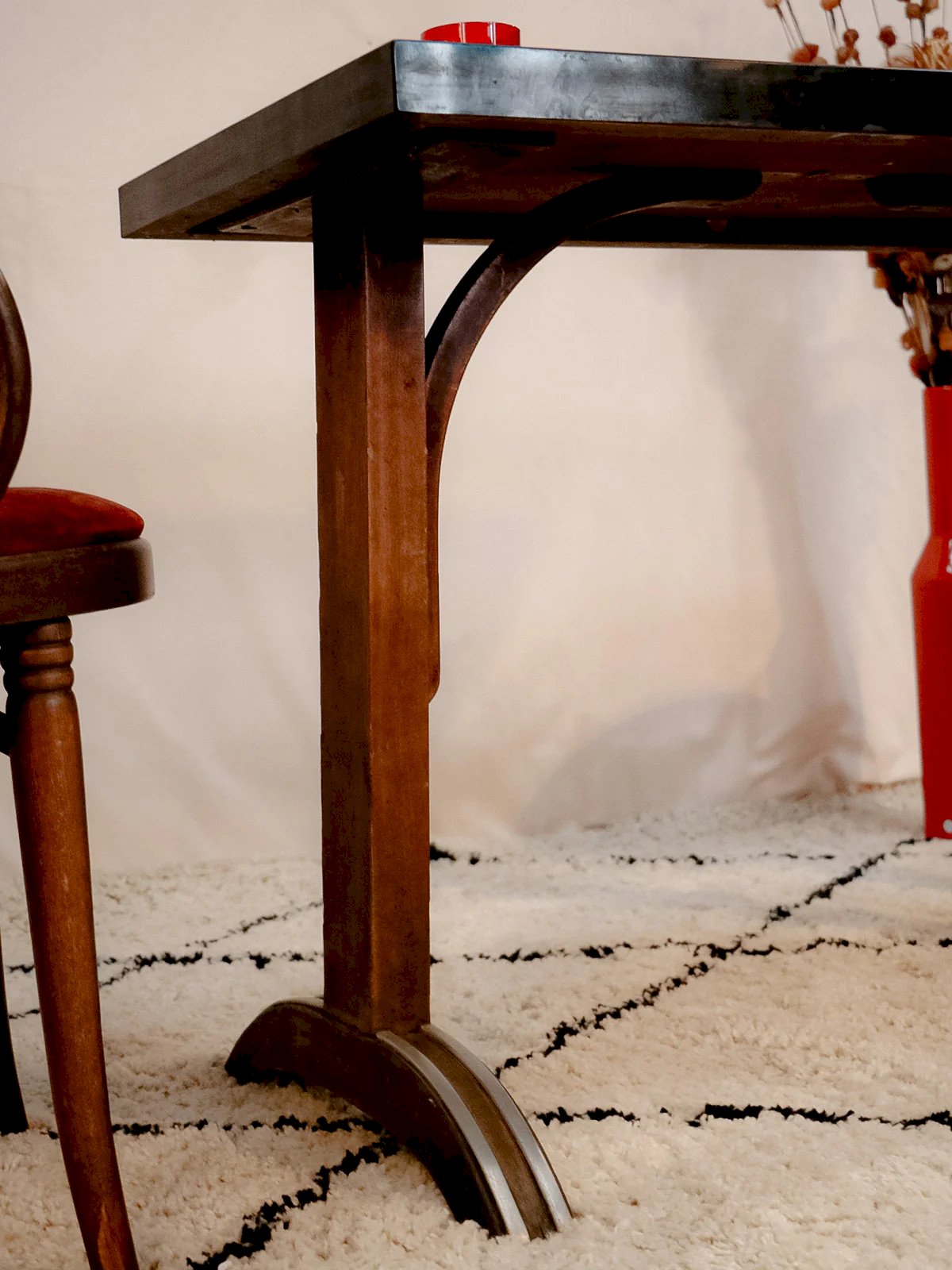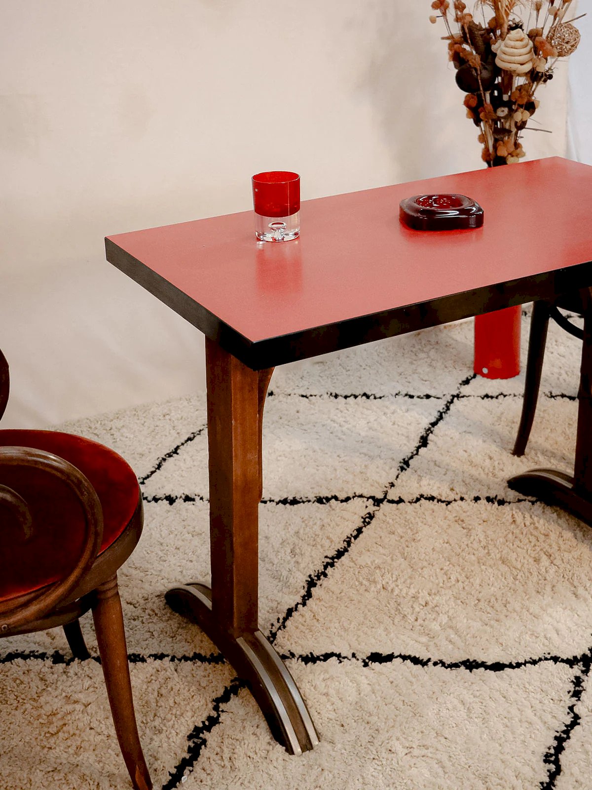 Bring a warm bistro touch with this compact dining table featuring a red Formica top and dark stained beech legs. Its compact size invites meals for two or four, while the contrasting materials blend practicality and retro charm. Ideal for a kitchen or dining nook seeking a graphic and authentic note, it offers stability and easy maintenance for a lively everyday life. Length: 100 cm Width: 55 cm Height: 75 cm Height under the top: 70 cm Thickness of the top: 5 cm Condition: Used: Item that has been used. Item showing some superficial signs of wear... Used: Item that has been used. Item showing some superficial signs of wear, fully operational and functioning correctly. It may be a demonstration model or an item returned to the store after a short period of use. any possible imperfections. Brand: Debongout Type: Vintage product Material: Wood, Formica, Zinc Style: Country Customized: Dining tables