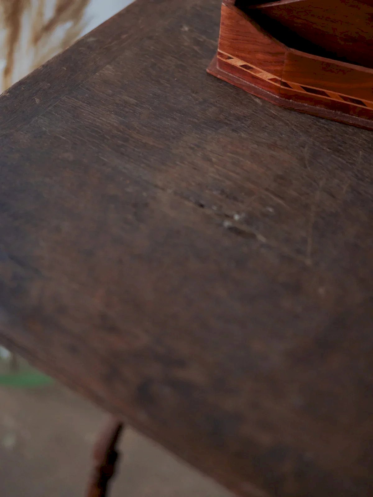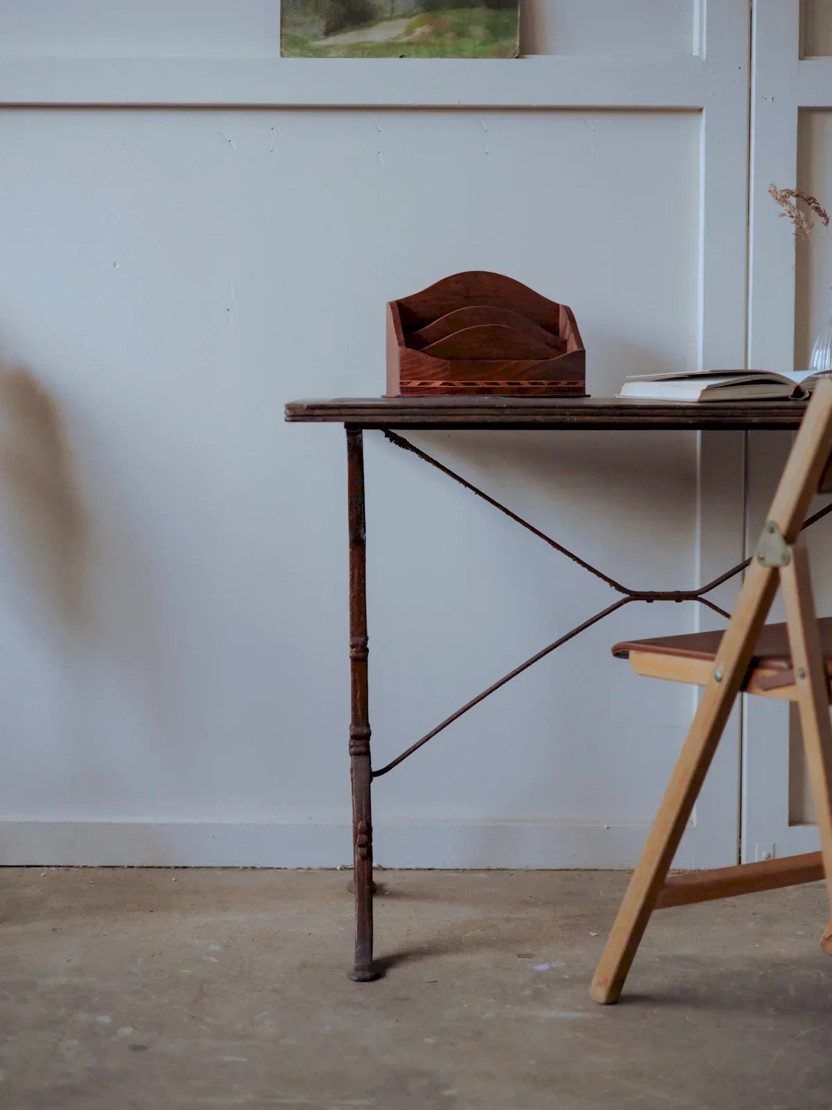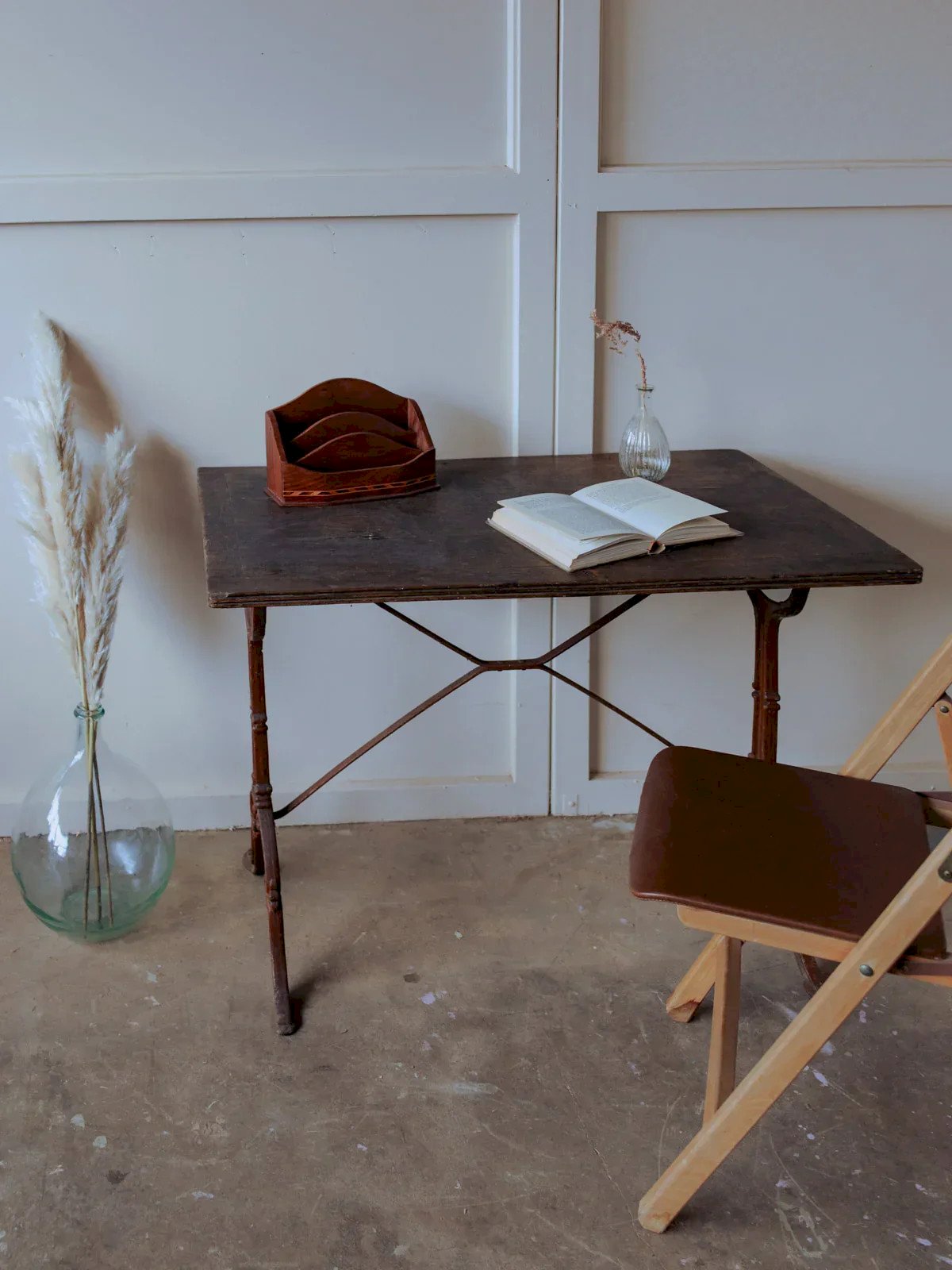 Add a warm bistro touch with this table featuring a veneered wood top and a caramel-colored painted metal base. Its friendly size comfortably accommodates two to four people for a coffee, a meal in the kitchen, or a reading nook, while the combination of wood and metal creates an atmosphere that is both industrial and soft. The veneer has a slight curve and the paint on the base has chipped a bit. Some signs of use add to its authenticity. Length: 98 cm Width: 55 cm Height: 71 cm Condition: Used item. Item shows some superficial signs of wear, fully operational and functioning correctly. It may be a display model or an item returned to the store after a short period of use. Any imperfections. Brand: Debongout Type: Vintage product Material: Wood, Iron, Metal Style: Country Custom: Dining tables
