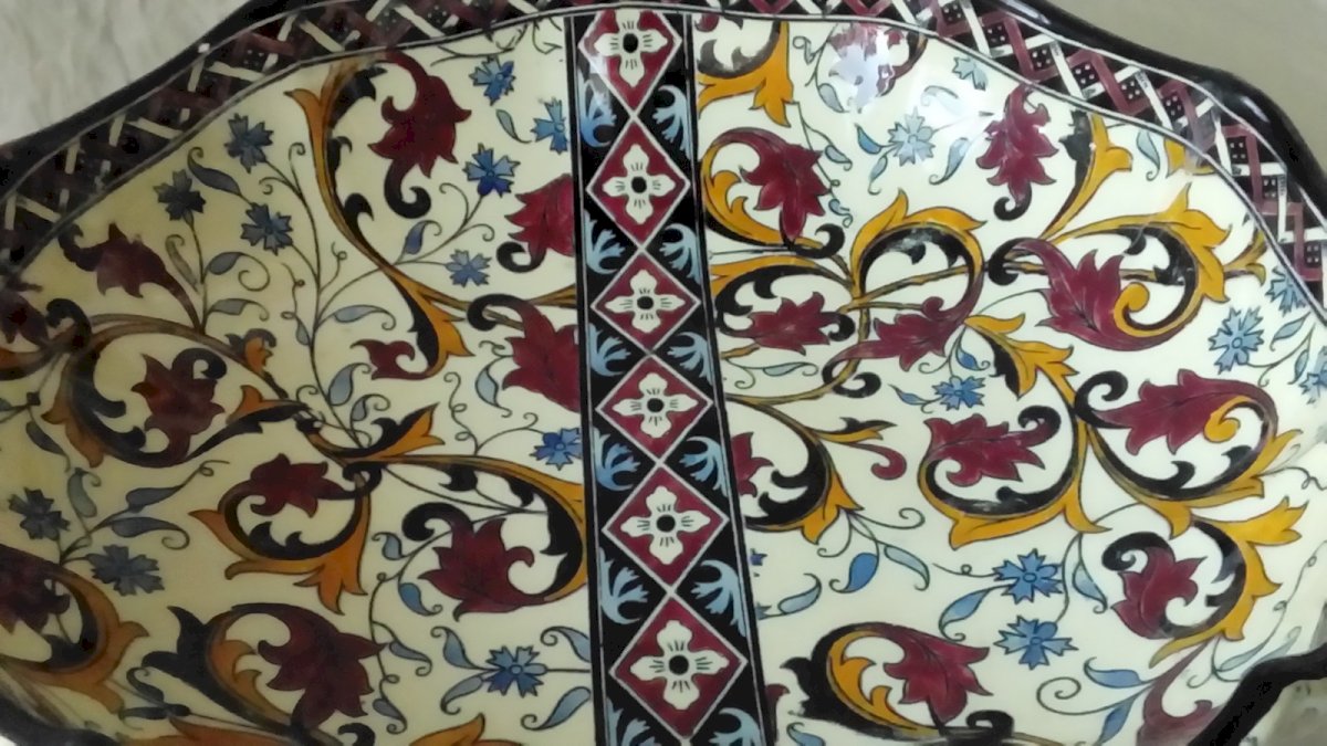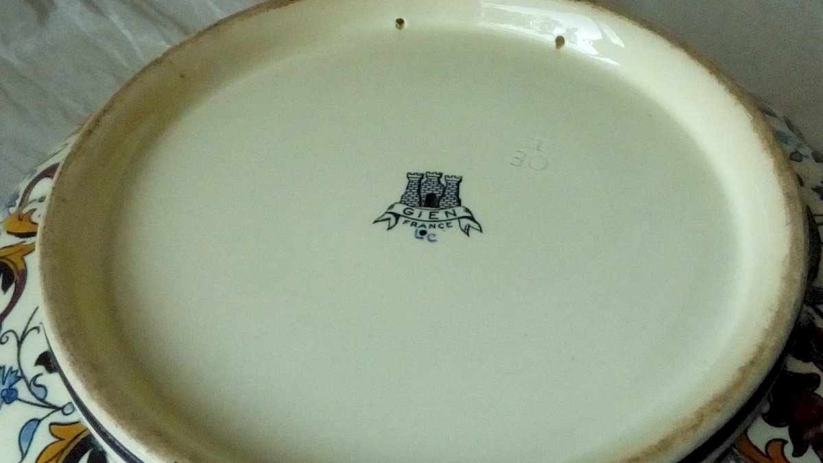 ANCIENT DEEP PLATE IN GIEN EARTHENWARE FROM 1938-1960, MODEL DECOR FRANÇOIS 1ER, DIAMETER 27 cm, HEIGHT 8 cm, IN GOOD CONDITION WITH A SLIGHT CHIP VISIBLE IN THE PHOTOS. Country of origin: France.