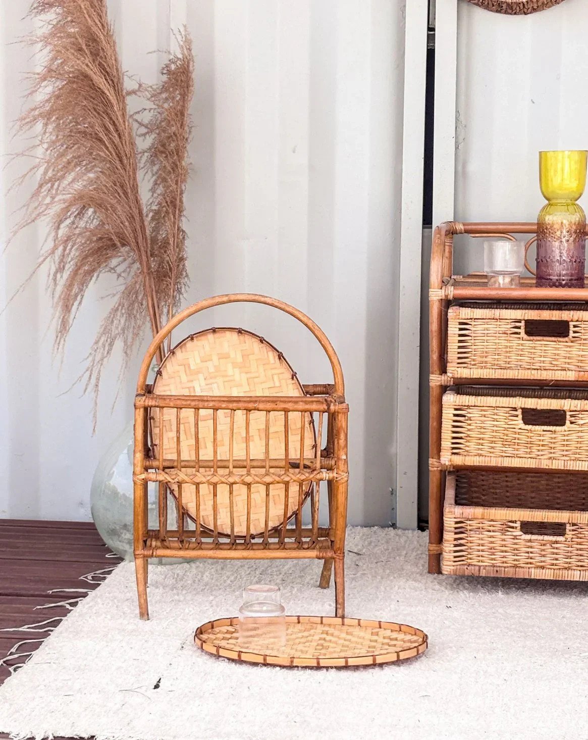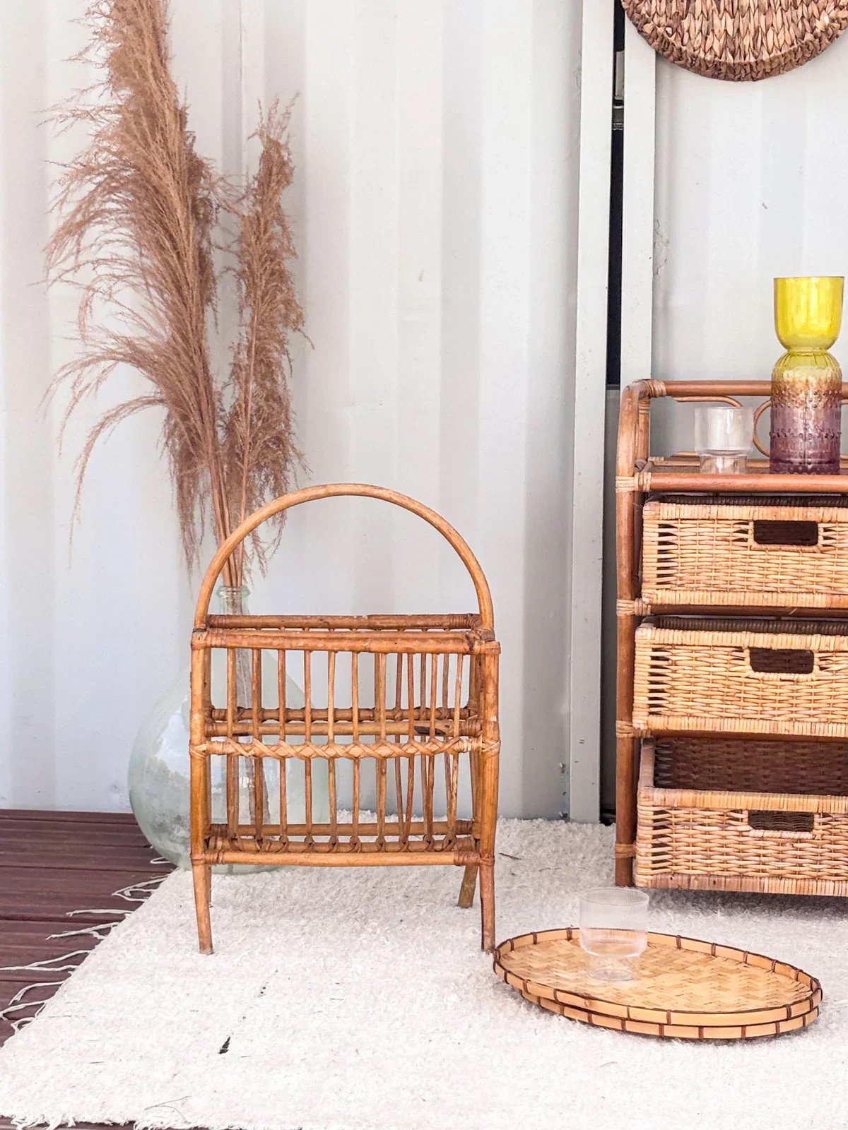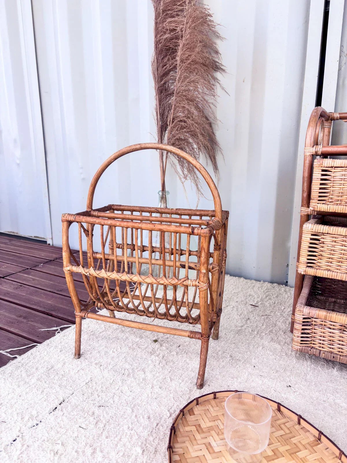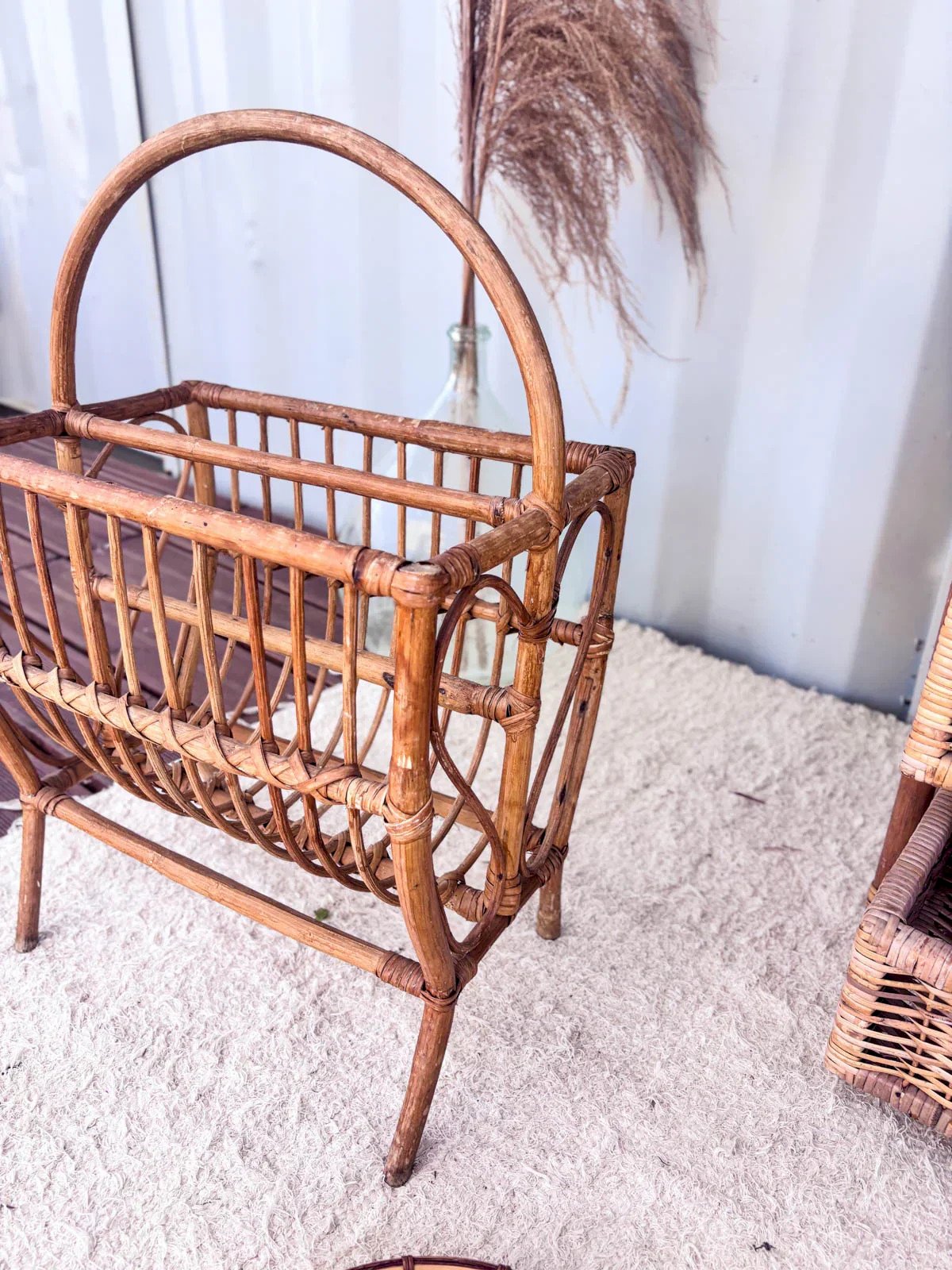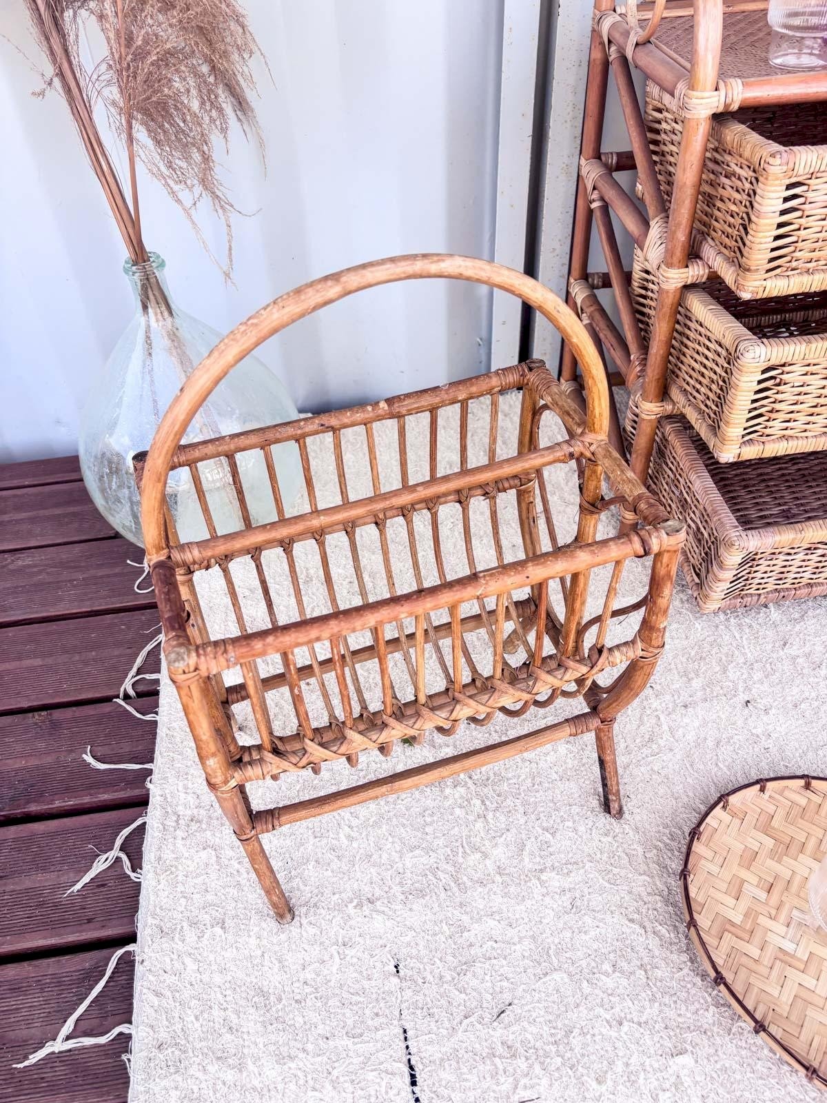 Add a retro touch to your interior with this vintage rattan magazine rack. Carefully crafted, it combines elegance and functionality, providing practical storage for your favorite magazines and books. Its woven rattan design adds warmth and authenticity to your decor while being lightweight and easy to move. Perfect for a living room or bedroom, this magazine rack is a must-have for vintage style enthusiasts. Length: 40 cm Width: 27 cm Height: 60 cm A brief history of the magazine rack The term "magazine rack" appeared in the early 20th century when newspapers and magazines became common in households. This piece of furniture, often made of wood or metal, is designed to organize and display printed publications. Initially found in living rooms and waiting areas, it embodies order and access to culture. Today, the magazine rack adapts to all interior styles, providing a practical decorative touch. Condition: Used: Item has been used. Item shows some superficial signs of wear,... Used: Item has been used. Item shows some superficial signs of wear, fully operational and functioning correctly. It may be a demonstration model or an item returned to the store after a short period of use. the possible imperfections. Brand: Debongout Type: Thrifted product Material: Rattan Style: Country