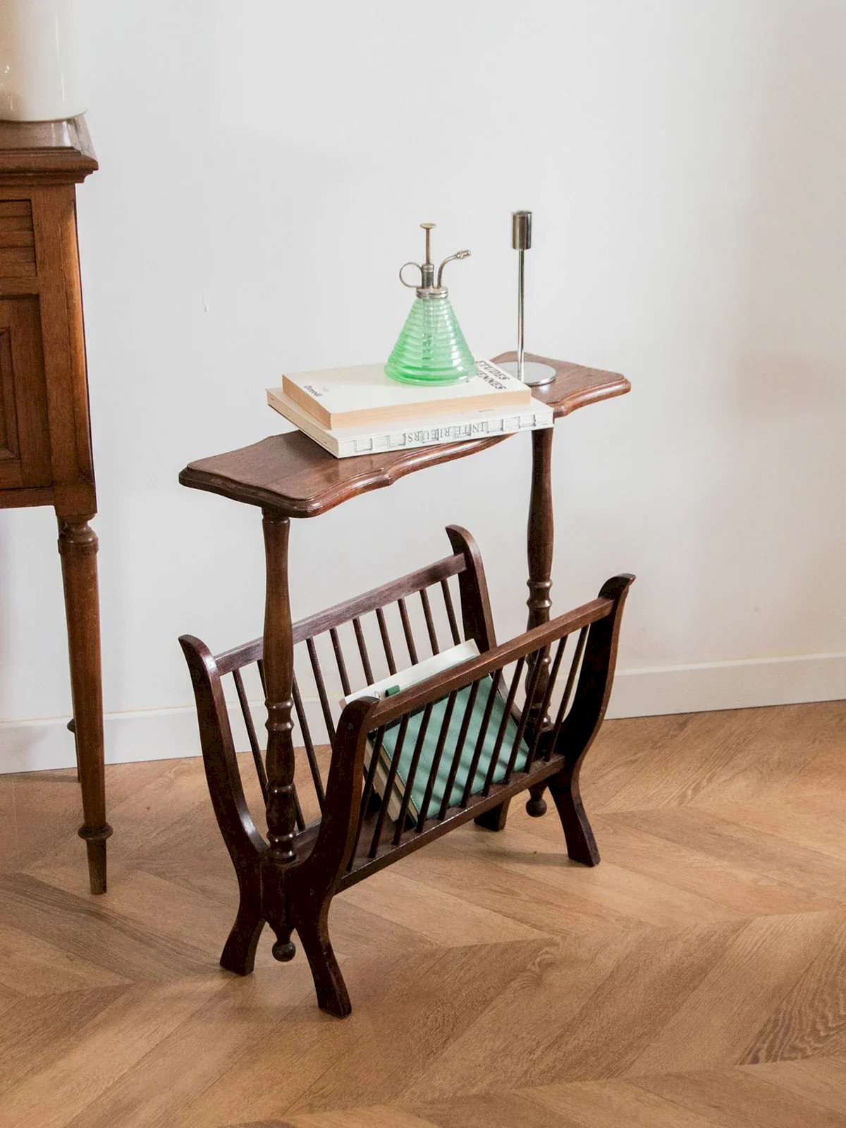 Add a touch of elegance to your interior with this intricately crafted magazine rack/side table made of wood. Its practical shelf provides the perfect storage space for your magazines, books, or decorative items, while harmoniously blending into any room. Each piece is unique due to its distinct wood grain, bringing a natural and authentic charm to your decor. A perfect choice to combine aesthetics and functionality! Length: 56 cm Height: 61.5 cm Depth: 28 cm Shelf depth: 18.5 cm A brief history of the magazine rack The term "magazine rack" emerged in the early 20th century when newspapers and magazines became commonplace in households. This piece of furniture, often made of wood or metal, is designed to organize and display printed publications. Originally found in living rooms and waiting areas, it embodies order and access to culture. Today, the magazine rack adapts to all interior styles, offering a decorative yet practical touch. Condition: Used: Item has been used. Item shows some signs of superficial wear... Used: Item has been used. Item shows some signs of superficial wear, fully operational and functioning properly. It may be a demonstration model or an item returned to the store after a short period of use. Any imperfections. Brand: Debongout Type: Vintage product Material: Wood Style: Countryside