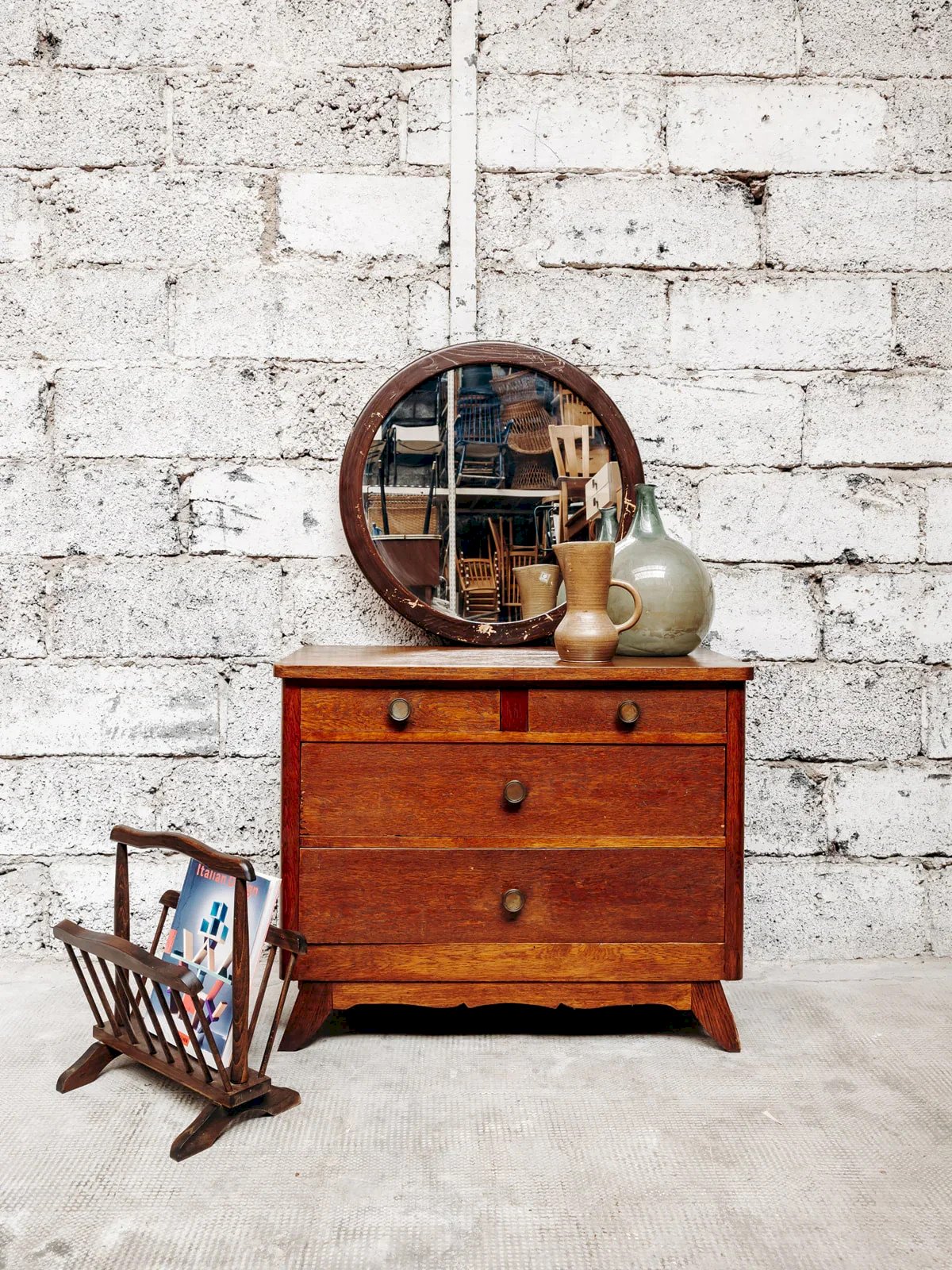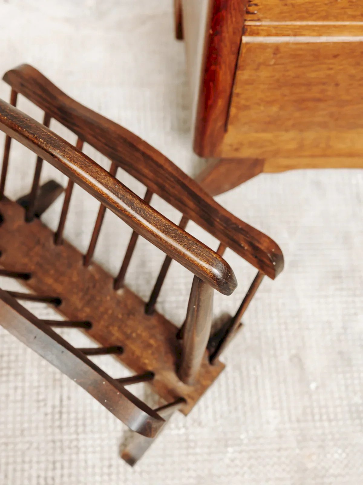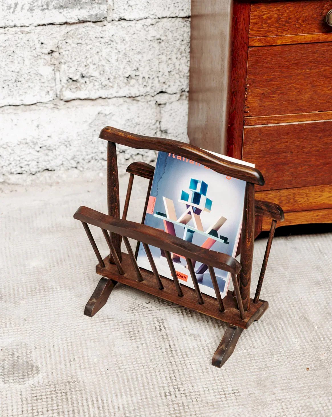 Bring a rustic touch to your interior with this lovely wooden magazine rack in a country style. Its simple and rustic lines make it a warm accessory, perfect for an authentic decor. It is ideal for storing magazines, books, or mail while beautifully decorating a corner of the room. The natural wood gives it a nice presence while remaining discreet. A practical and decorative little piece of furniture, easy to integrate into a soft and cozy atmosphere. Length: 40 cm Width: 25 cm Height: 43 cm A brief history of the magazine rack The term "magazine rack" appeared in the early 20th century when newspapers and magazines became common in households. This piece of furniture, often made of wood or metal, is designed to organize and display printed publications. Initially found in living rooms and waiting areas, it embodies order and access to culture. Today, the magazine rack adapts to all interior styles, providing a decorative yet practical touch. Condition: Used: Item has been used. Item shows some superficial signs of wear, ... Used: Item has been used. Item shows some superficial signs of wear, fully operational and functioning correctly. It may be a demonstration model or an item returned to the store after a short period of use. any imperfections. Brand: Debongout Type: Vintage product Material: Wood Style: Country