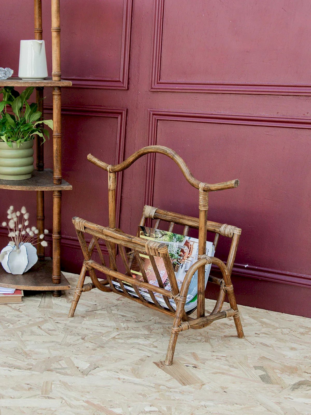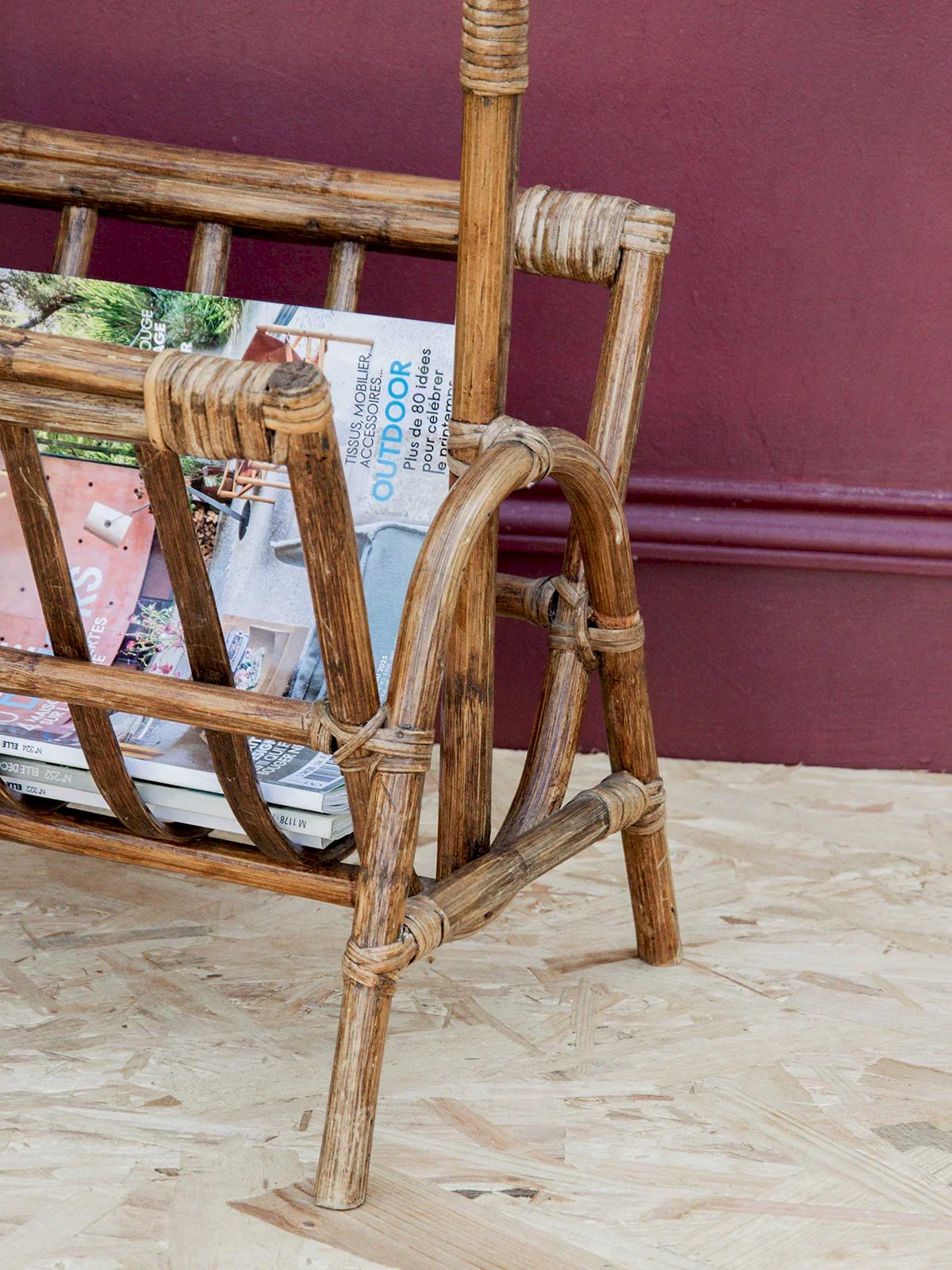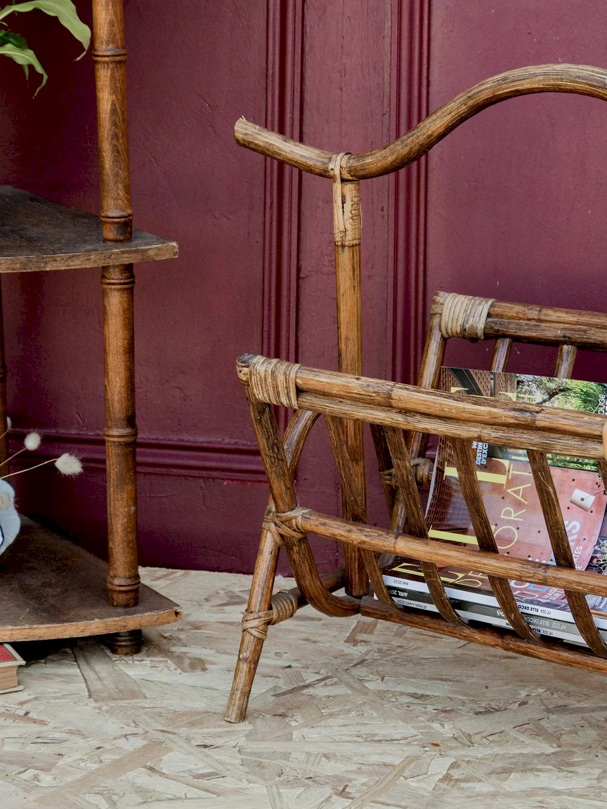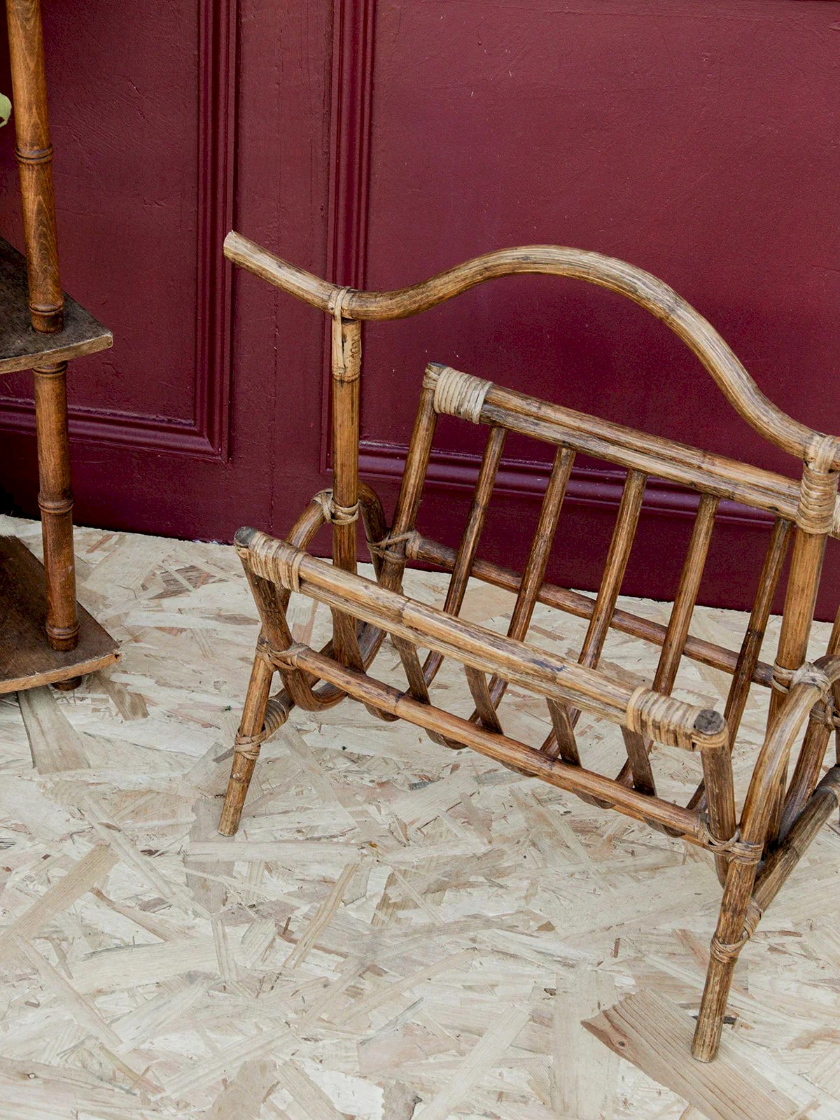 Bring a touch of elegance to your interior with this original design rattan magazine rack. Its lovely curves and large handle make it easy to access your favorite magazines while adding a charming note to your decor. It harmoniously fits into any room, combining practicality and aesthetics for style enthusiasts. Length: 42 cm Height: 52 cm Depth: 29.5 cm A brief history of the magazine rack The term "magazine rack" appeared in the early 20th century when newspapers and magazines became common in households. This piece of furniture, often made of wood or metal, is designed to organize and display printed publications. Initially found in living rooms and waiting areas, it embodies order and access to culture. Today, the magazine rack adapts to all interior styles, providing a practical decorative touch. Condition: Used: Item has been used. Item shows some superficial wear marks, ...Used: Item has been used. Item shows some superficial wear marks, fully operational and working correctly. It may be a demonstration model or an item returned to the store after a short period of use, with possible imperfections. Brand: Debongout Type: Vintage product Material: Rattan Style: Country