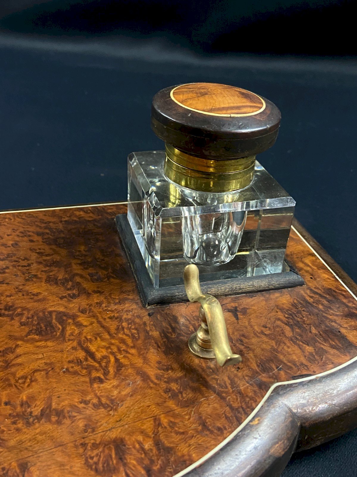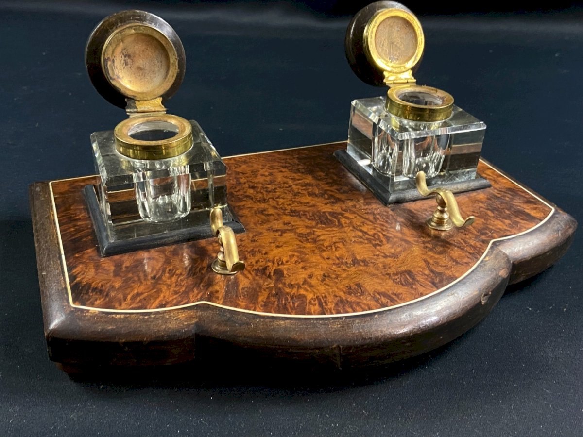 Very elegant desk inkwell with a walnut burl nib holder from the late 19th century, Napoleon III style. Two square-section crystal reservoirs with brass mounts. Maximum dimensions: 30 x 20 x Height 11.3 cm. Weight: 1641 grams. I would only point out a small discreet chip at the lower left rear corner of one of them (invisible due to the inset rebate). Ultra-secure shipping worldwide - Pickup of orders possible by appointment, 7 rue Notre-Dame 18000 Bourges. - Possibility of consolidation within the same package: please contact me in advance so I can calculate your optimized shipping costs. Authenticity: Original. Type: Showcase object, Decorative. Origin: France. Country of origin: France. Subtype: Inkwell, Pen case. Style: Napoleon III. Material: Wood.
