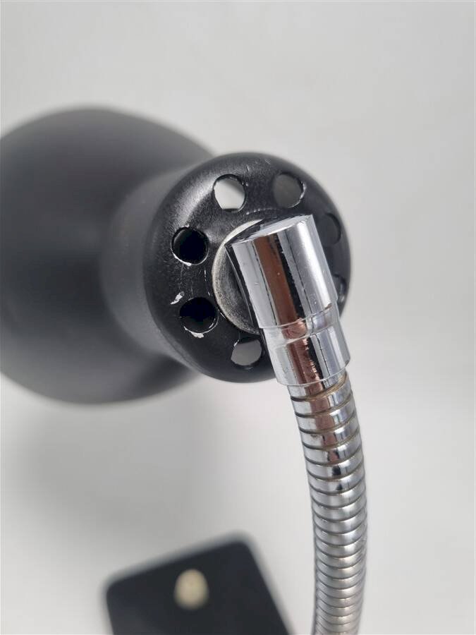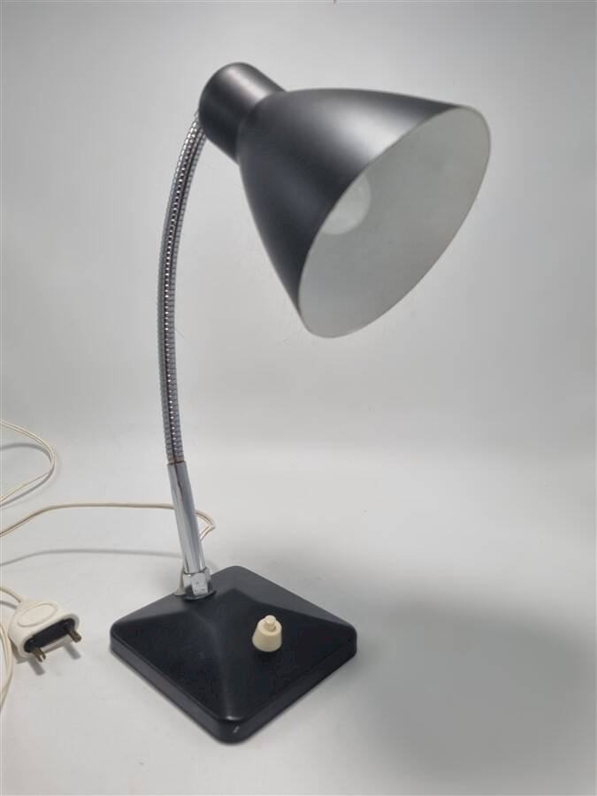 Vintage black metal desk lamp. It shows some minor signs of wear and usage, see photo. E14 socket. Average height: 31 cm. Weight: 480 g. L: 11 W: 19 H: 31