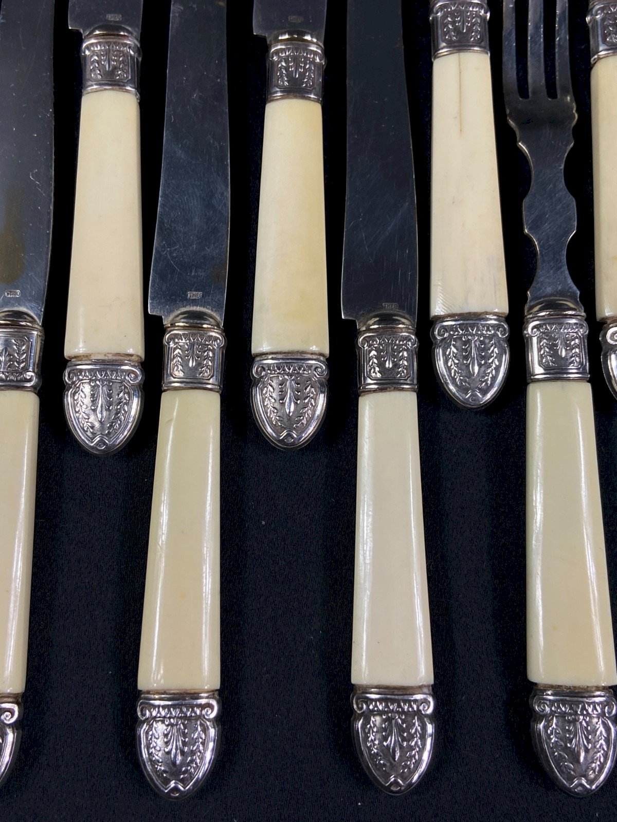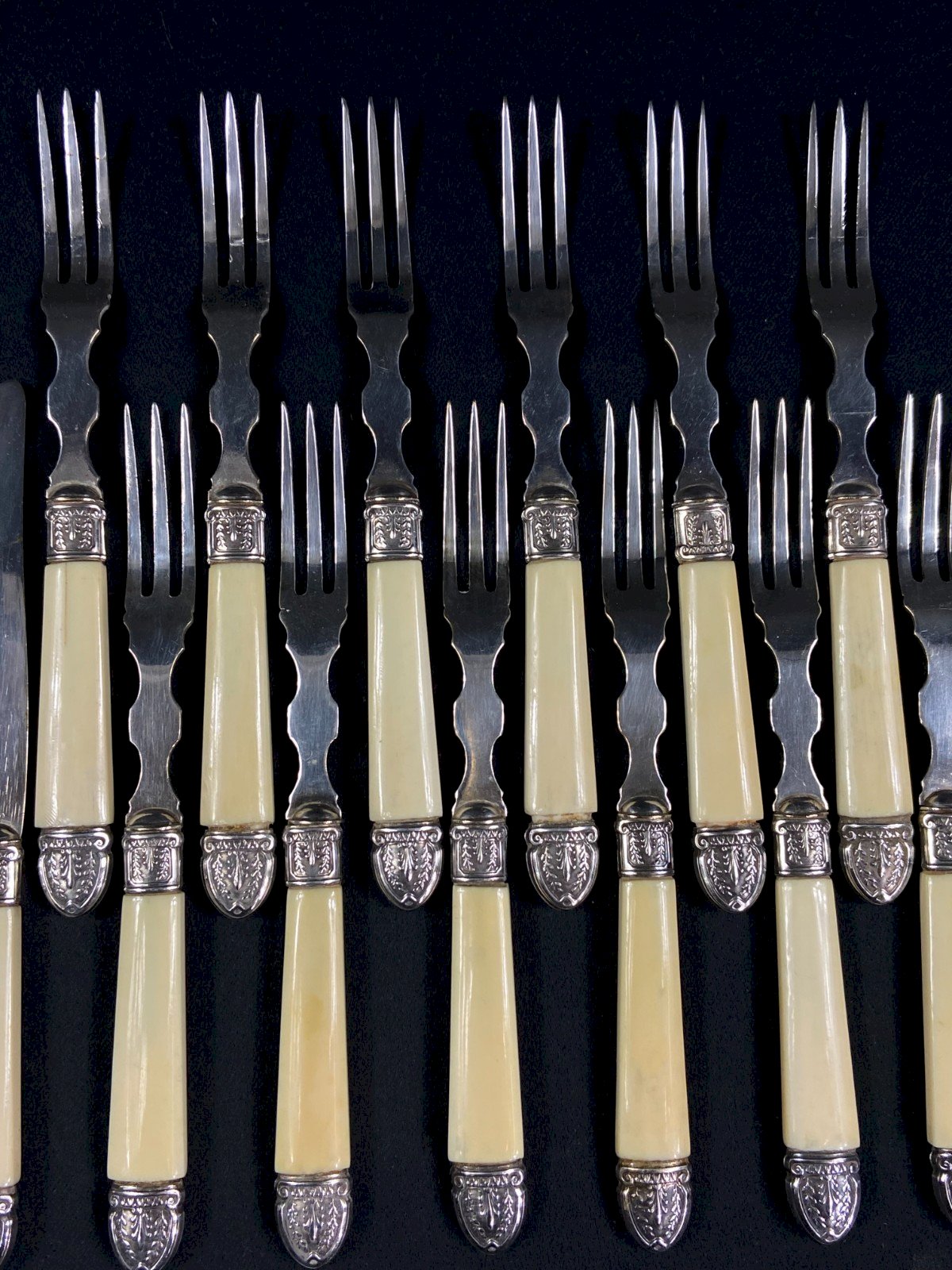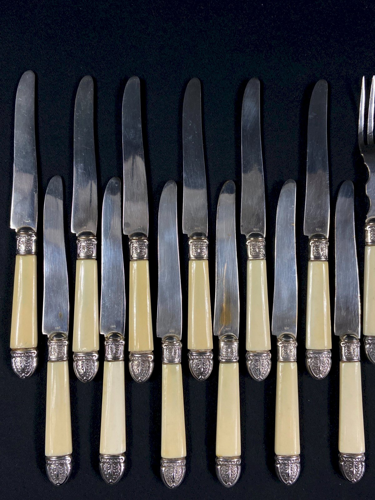 Dessert service in Restoration style consisting of 12 knives and 12 forks Era: current first half of the 20th century - Blades and forks in silver-plated metal - Handles in ivorine - Ferrules in solid silver Maximum dimensions: Knives: 16.6 x 1.3 cm / Forks: 16 x 1.3 cm Undeniable elegance I note the presence of signs of wear on the silver plating on the surface of 3 blades, very slight small deformations on a few forks, as well as a slight crack on the surface of 3 handles Presence of the original box (signs of exterior wear) - Ultra-secure shipping worldwide - Order pickup possible by appointment, rue Notre-Dame in Bourges. - Possibility of grouping within the same package: please contact me in advance so that I can calculate your optimized shipping costs. Authenticity: Original Type: Tableware, Kitchen Origin: France Subtype: Knife Country of origin: France Style: Restoration Material: Silver-plated metal