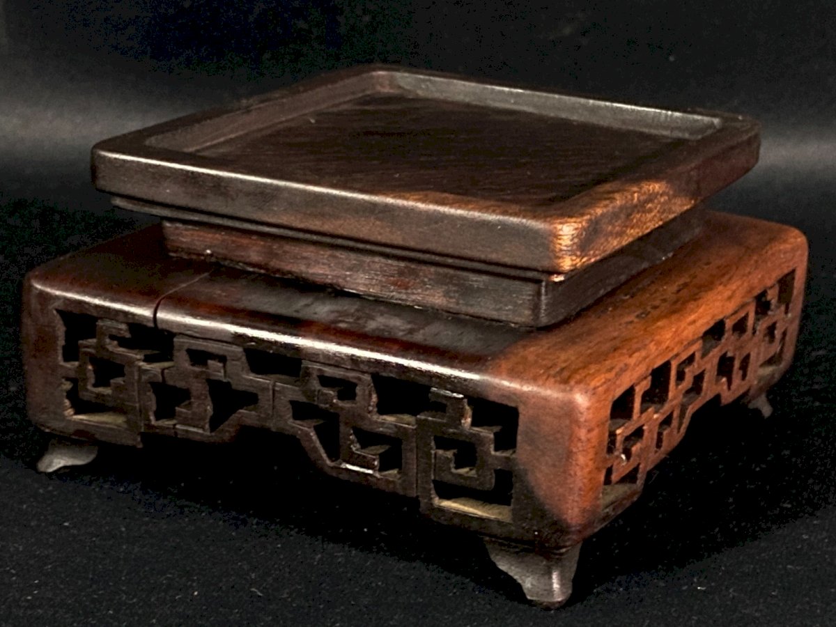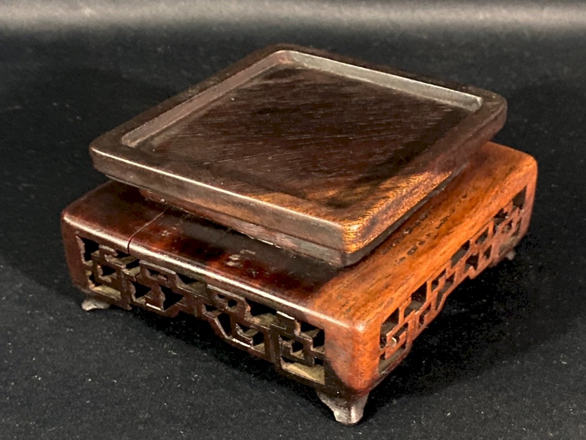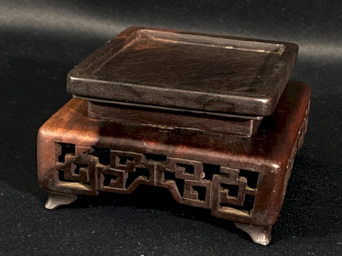Diamond-shaped base from the Far East made of solid Hongmu wood, China, early 20th century. Diamond-shaped double tray: an upper tray set into a slightly raised rim resting on a molded body. Asian hardwood of the Hongmu type, darker top. Belt with geometric cutouts. Small slightly flared hoof feet. Beautiful patina, slight crack in the belt and minor signs of use. Perfect stability. Max dimensions: 15.4 x 14 x Height 6.3 cm / Inset 11.3 x 9.5 cm. Weight: 238 grams. Shipping worldwide. Authenticity: Original. Type: Vase. Origin: China. Period: 1900-1949. Materials from: China. Material: Wood.