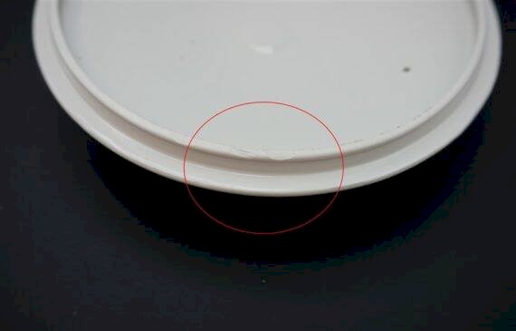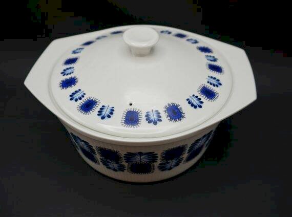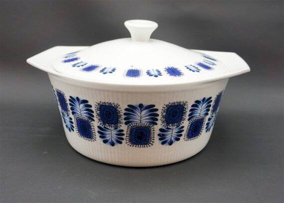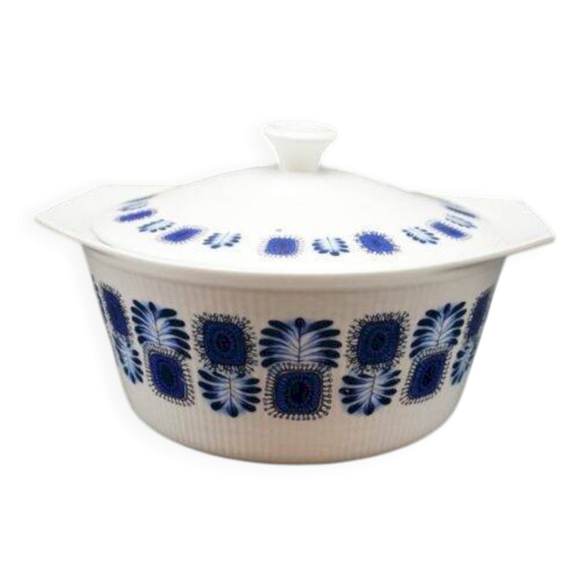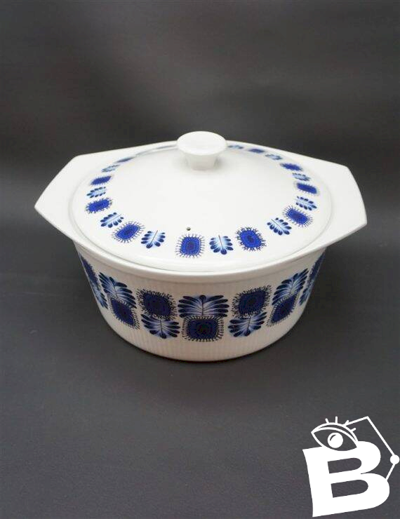 Blue palm decoration. Good condition, with some small chips on the inside of the lid, visible in the photo. Dimensions without lid and handles: approximately 22 X 10 cm. With handles and lid: approximately 25 X 13 cm. Weight: 1.450 kg. L: 22 W: 9 H: 10
