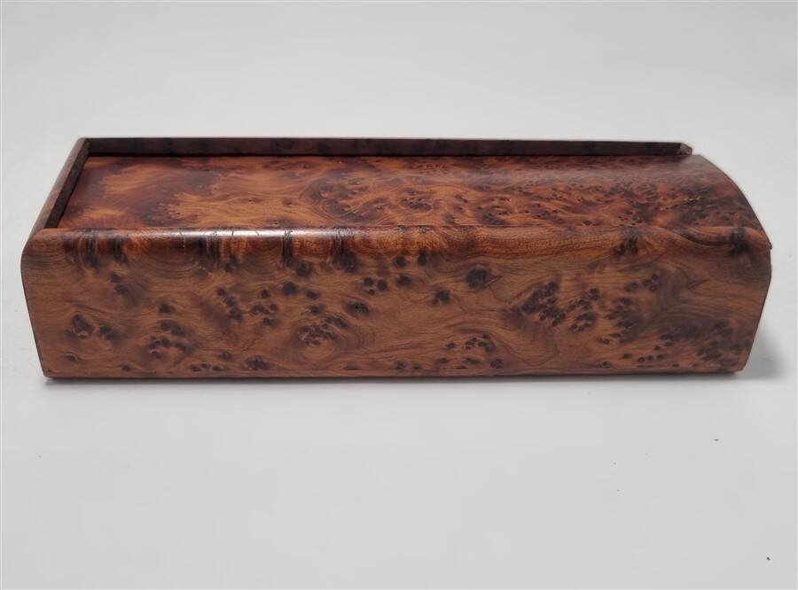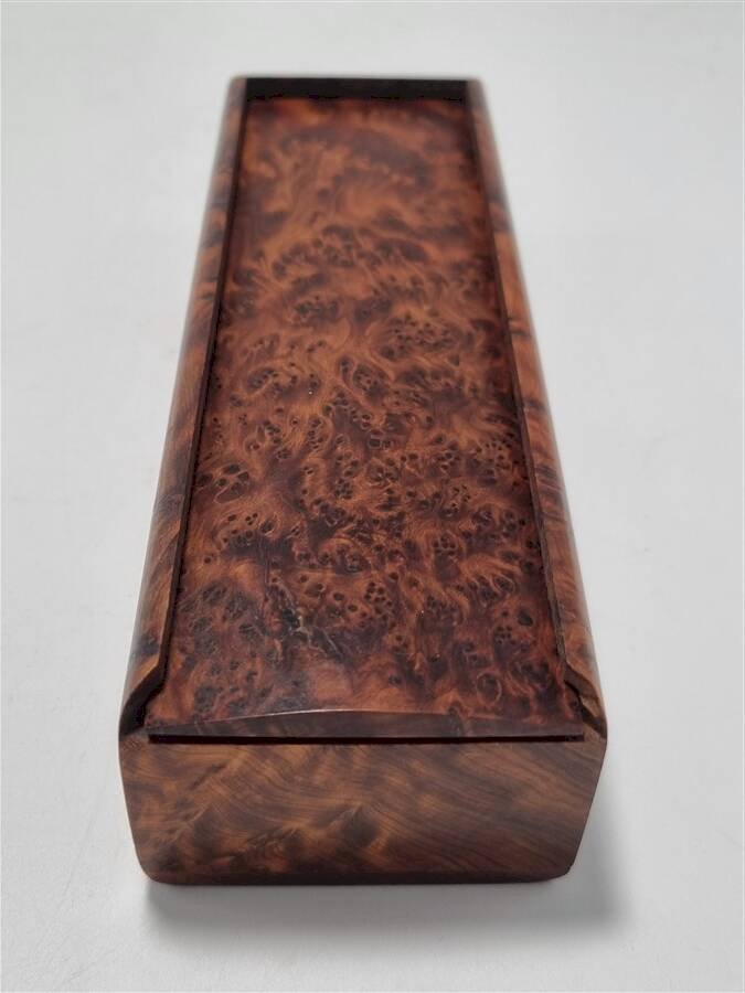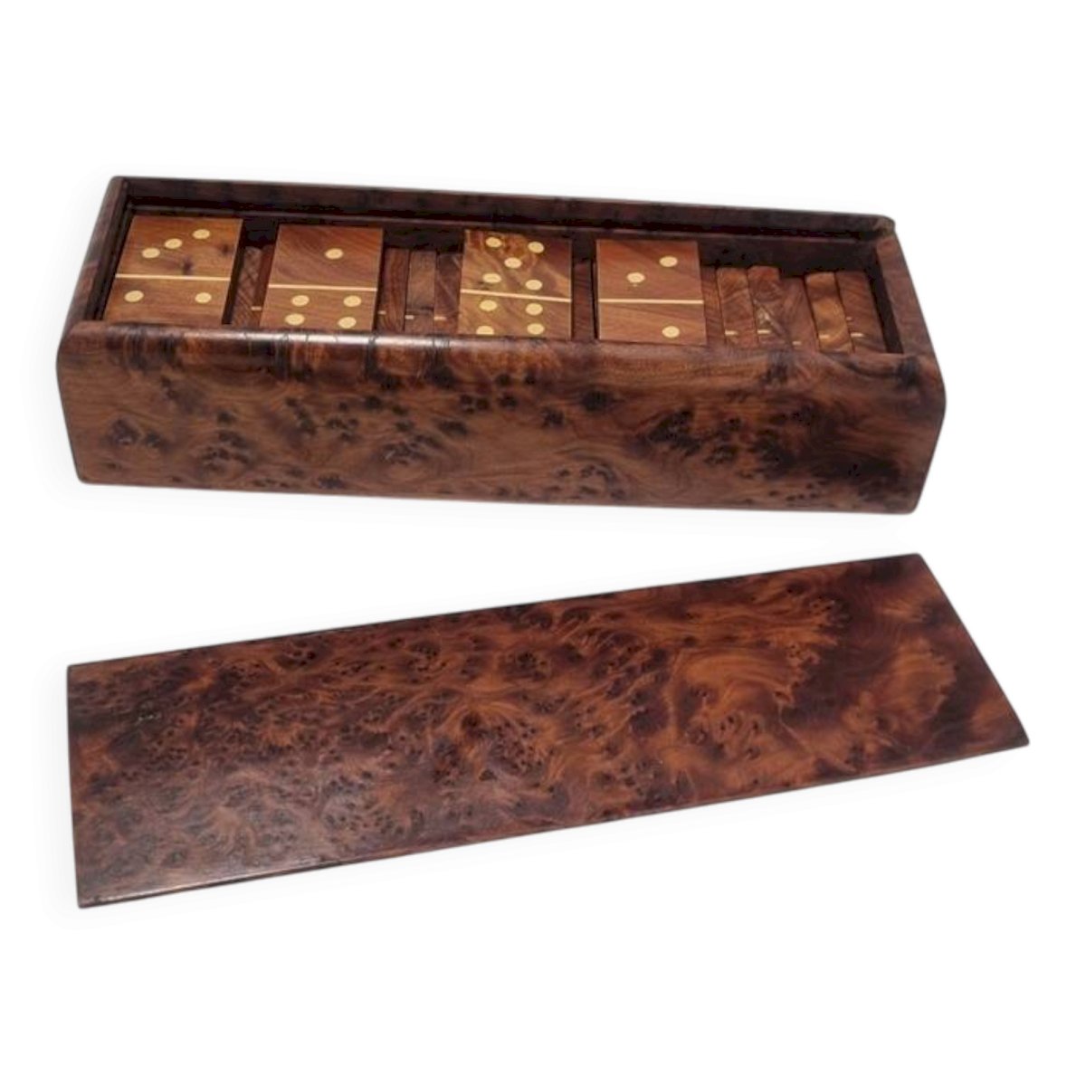 Wooden domino game, complete. The dominoes are made of walnut, and the box is made of walnut burl. Box dimensions: 19 x 6.5 x 4.5 cm Weight: 400 g L: 19 W: 6.5 H: 4.5