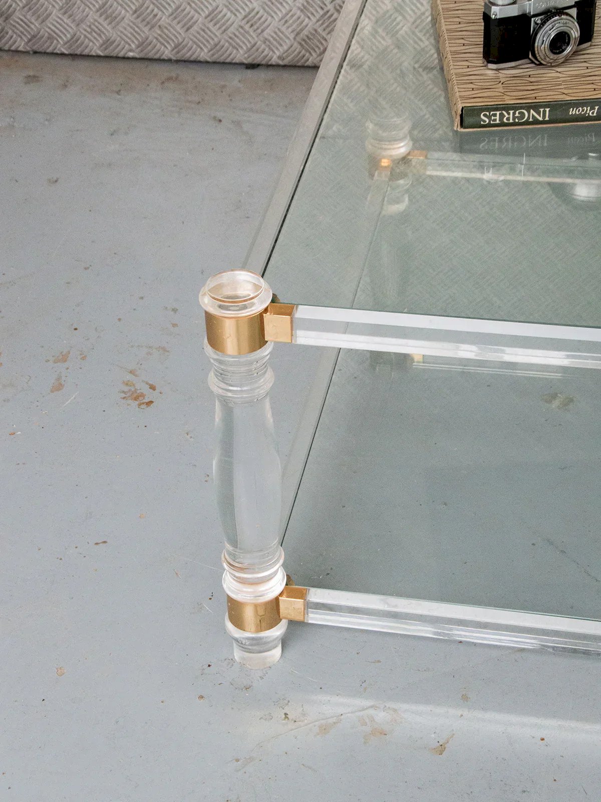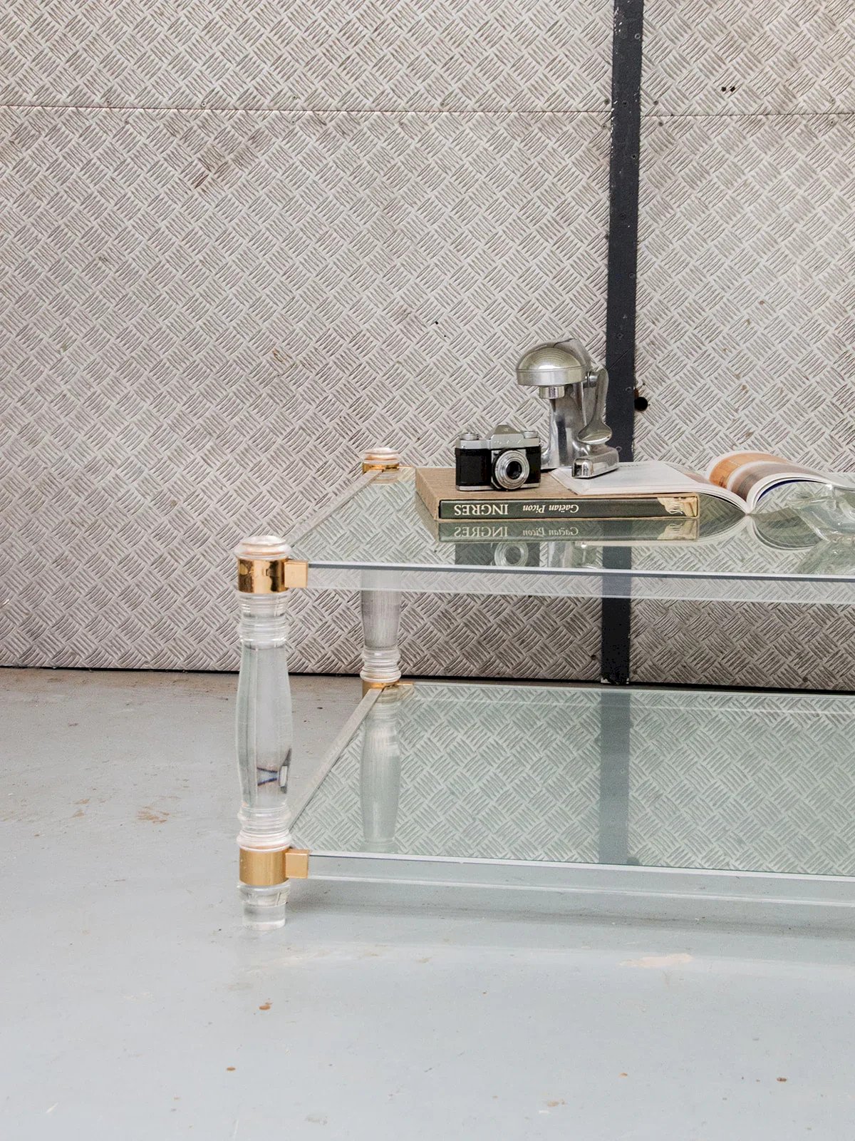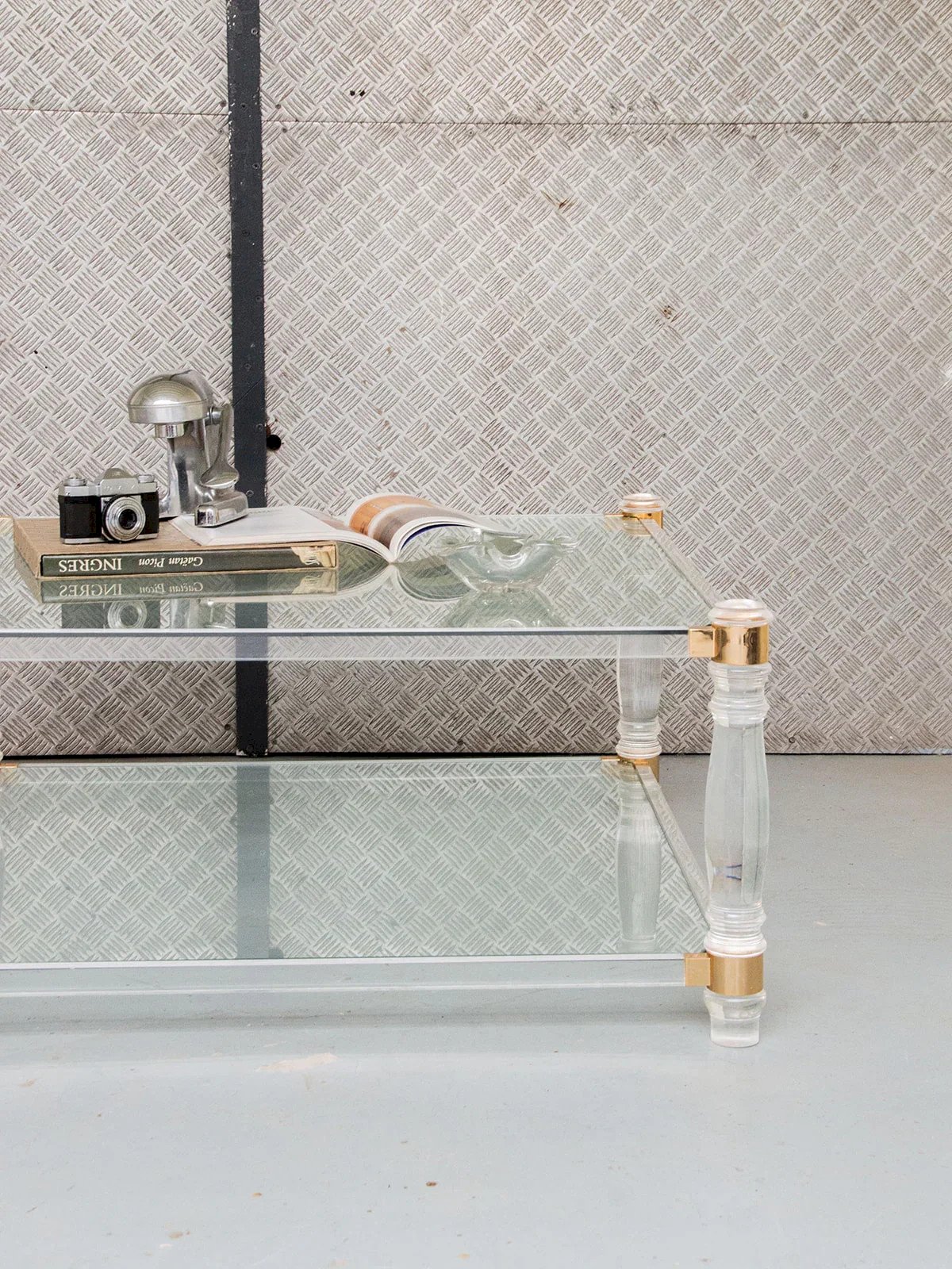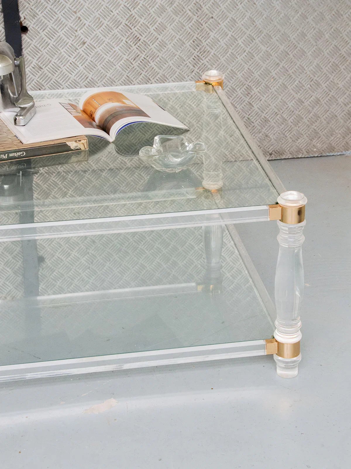 Discover this square glass coffee table, a chic and modern model with two stacked trays for functional storage space. Its transparent plastic structure creates a light effect, while the gold details on the legs add a touch of elegance. In overall good condition, it shows some signs of wear without compromising its appeal. A refined piece that will blend perfectly into a contemporary living room. A subtle mix of transparency and charm for your interior. Length: 101 cm Height: 47 cm Depth: 101 cm Condition: Used: Item that has been used. Item with some signs of superficial wear, fully operational and functioning properly. It may be a demonstration model or an item returned to the store after a short period of use. Possible imperfections. Brand: Debongout Type: Vintage product Material: Glass, Plastic Style: Contemporary Custom: Coffee tables