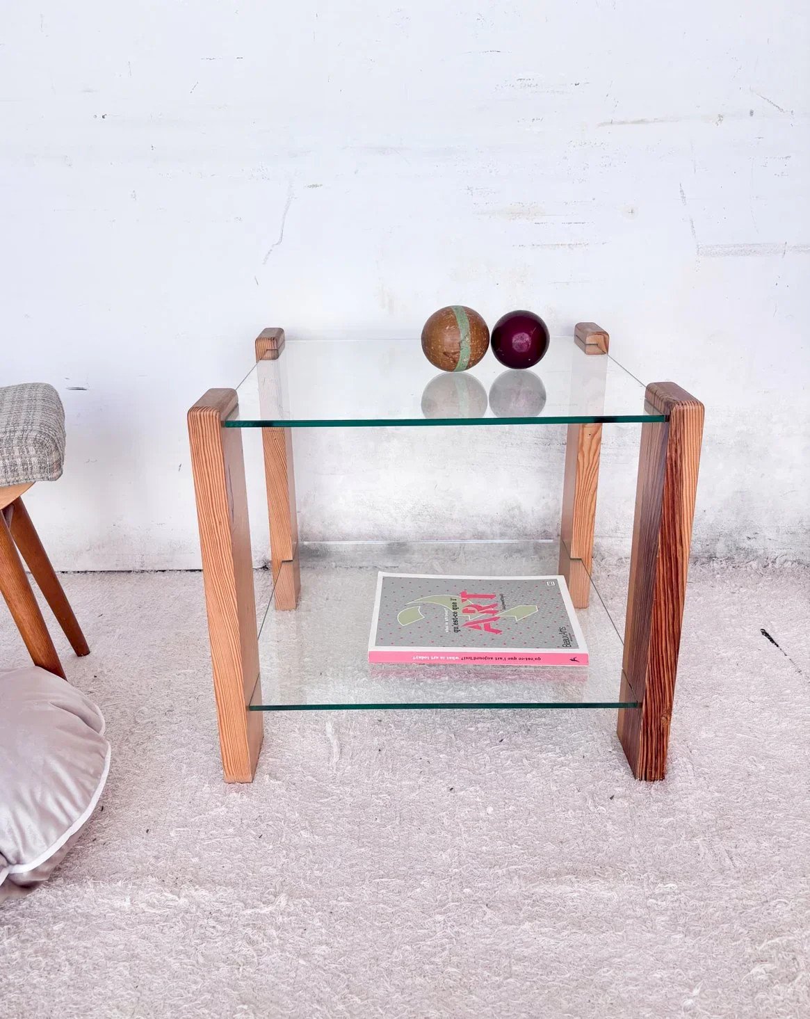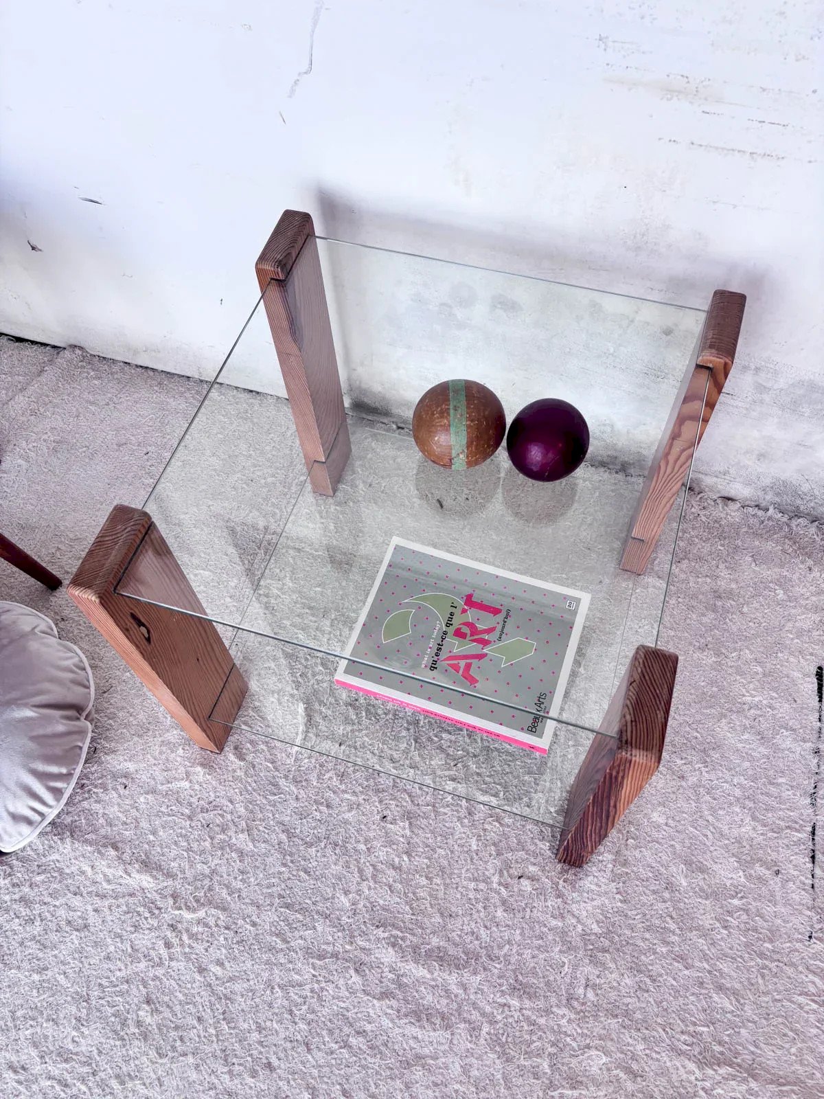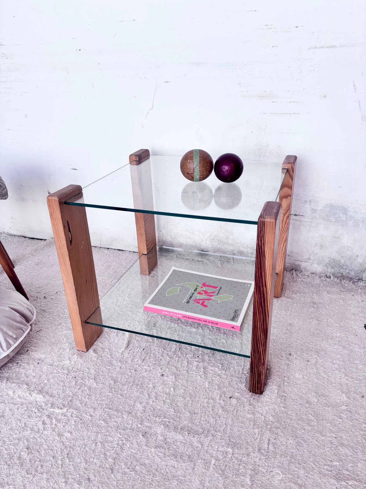 Discover this coffee table with an iconic 80s style, exuding undeniable charm. Its sturdy wooden structure perfectly harmonizes with its two glass tops, offering both elegance and practicality. Ideal for enhancing your living room, it will stylishly accommodate your refreshments or magazines. Bring a touch of retro into your interior with this piece featuring refined lines. Length: 54 cm Width: 54 cm Height: 48 cm Condition: Used: Item has been utilized. Item shows some superficial signs of wear... Used: Item has been utilized. Item shows some superficial signs of wear, fully operational and functioning correctly. It may be a display model or an item returned to the store after a short period of use, with possible imperfections. Brand: Debongout Type: Thrifted Product Material: Glass, Wood Style: Contemporary Customizable: Coffee tables