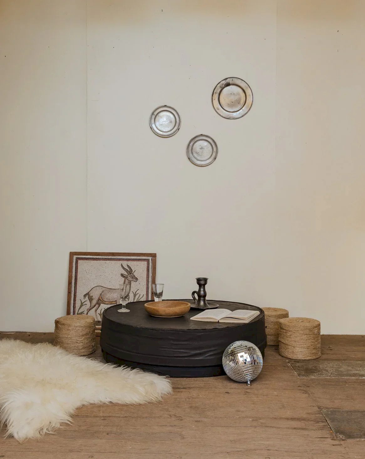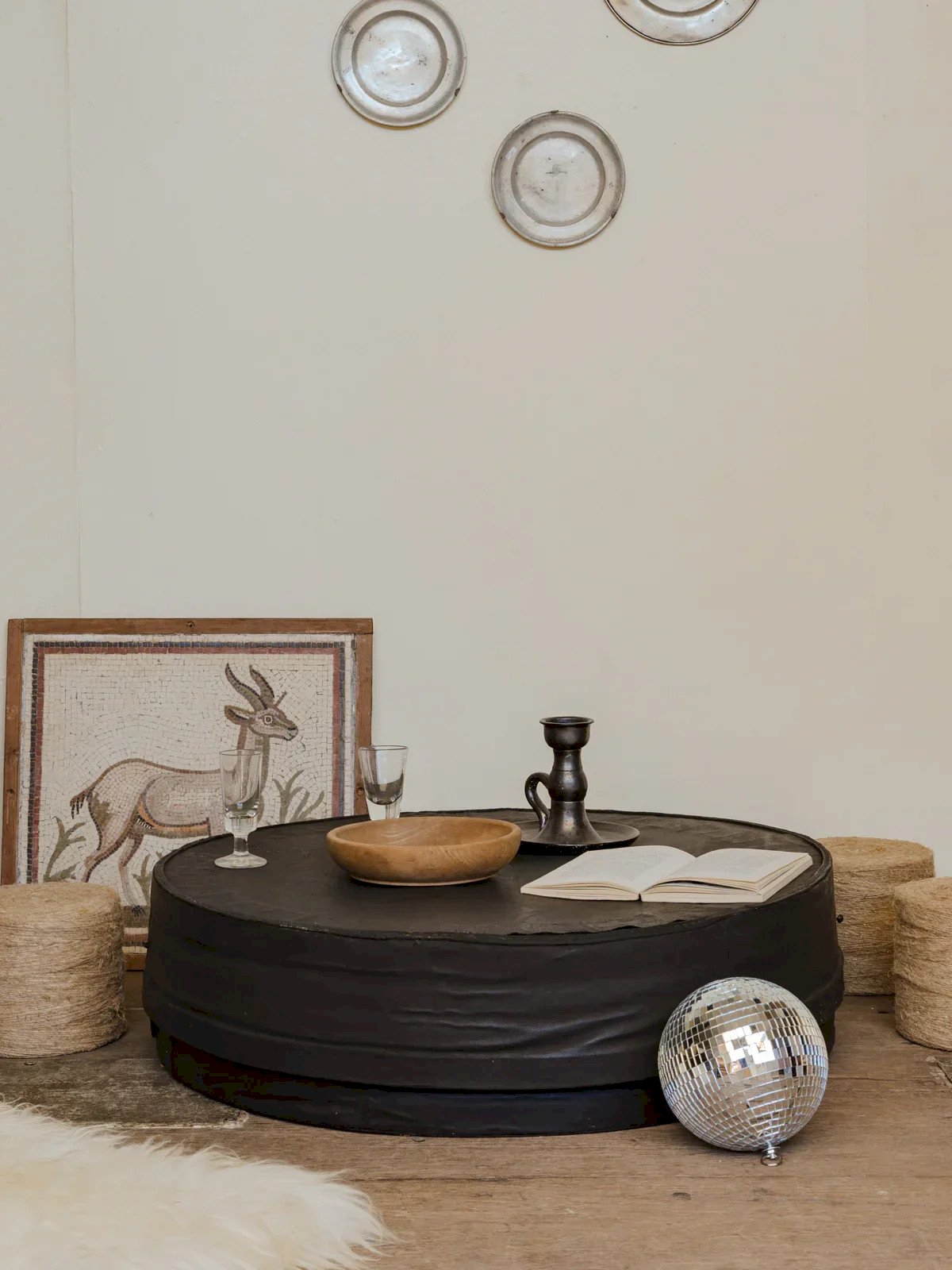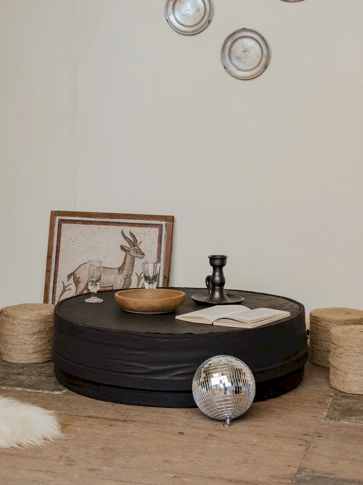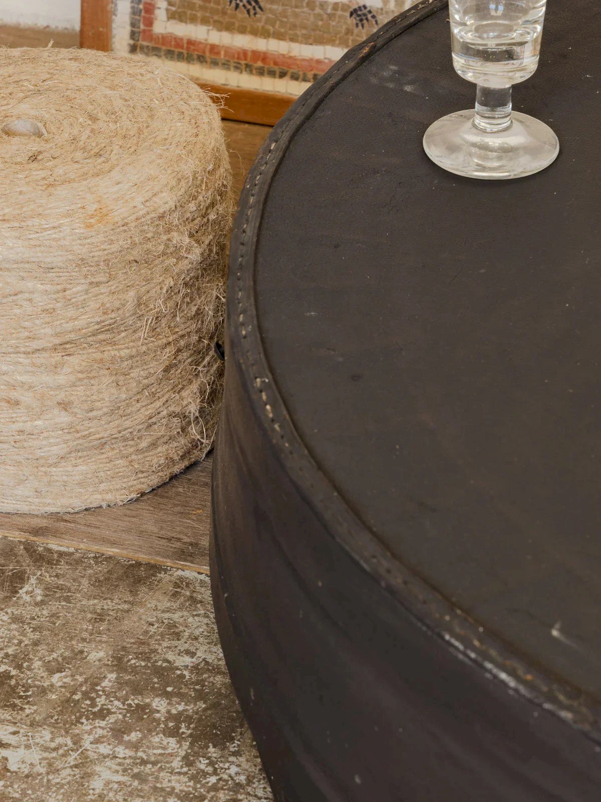 Elevate your living room with this original coffee table crafted from an antique carriage wheel case, dressed in original black leather set on a wooden structure. Its vintage and artisanal spirit brings a narrative presence and contrasting materials, offering a low surface ideal for holding cups, books, and decorative items. The natural patina of the leather tells its story and adds a subtle elegance. Height: 25 cm Diameter: 92 cm Condition: Used: Item that has been used. Item shows some superficial signs of wear... Used: Item that has been used. Item shows some superficial signs of wear, fully operational and functioning correctly. It may be a demonstration model or an item returned to the store after a short period of use. the potential imperfections. Brand: Debongout Type: Vintage product Material: Leather Style: Contemporary Custom: Coffee tables