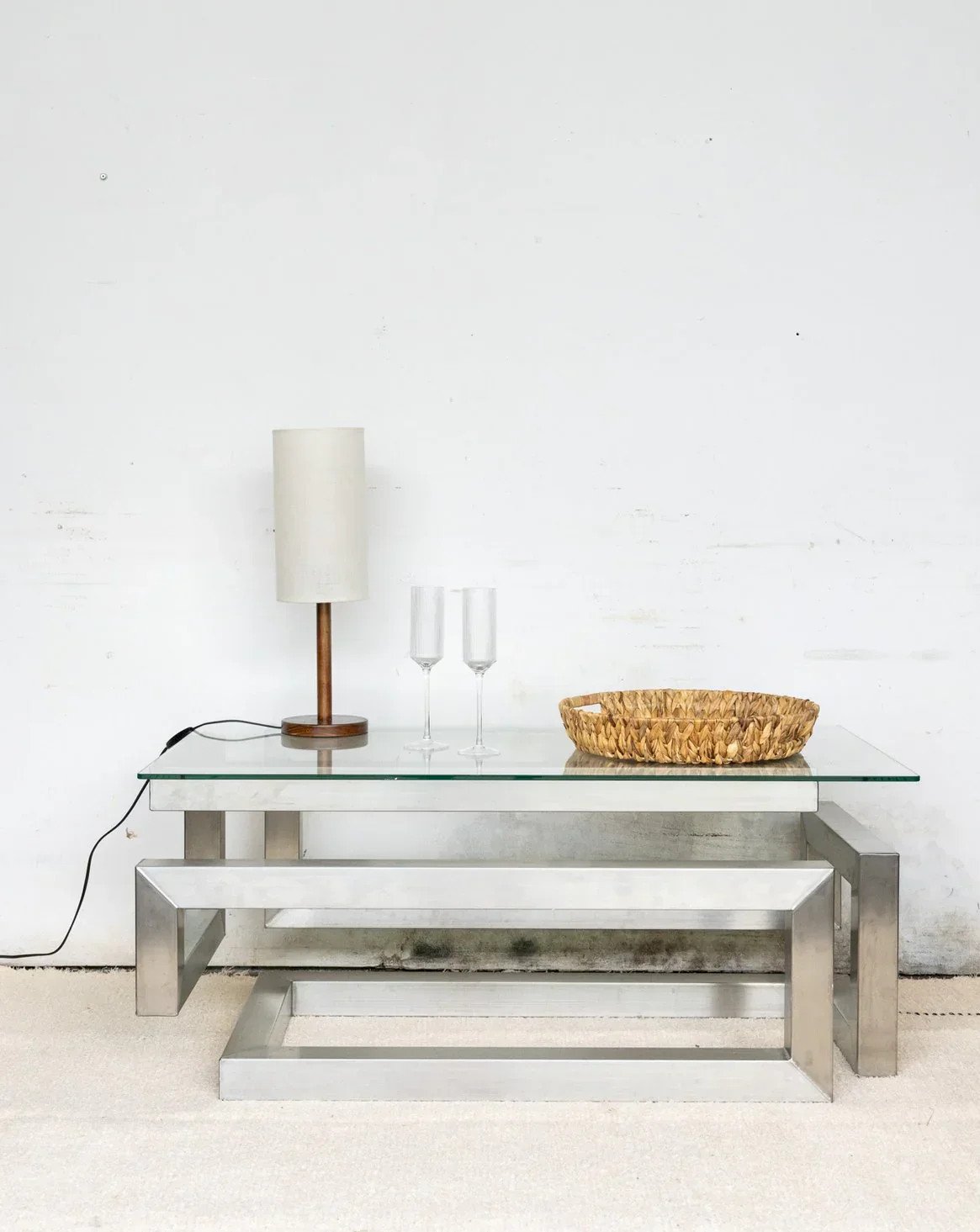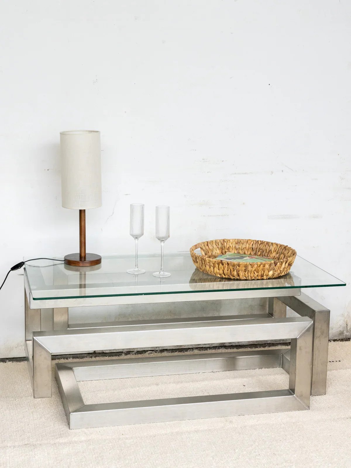 Heartthrob alert! Discover our elegant stainless steel coffee table, with a modern and sleek design. Its transparent glass top brings a touch of lightness and refinement to your living space. Crafted with attention to detail and high-quality materials, this unique piece combines sturdiness and aesthetics, perfect for a contemporary interior. Ideal for showcasing your living room, it becomes the centerpiece of your decor. Online exclusive, the meeting will take place at your home! Length: 110 cm Width: 60 cm Height: 46 cm Condition: Used: Item that has been used. Item showing some superficial wear and tear, fully operational and functioning properly. It may be a display model or an item returned to the store after a short period of use. Possible imperfections. Brand: Debongout Type: Curated product Material: Stainless steel, Glass Style: Contemporary Customizable: Coffee tables