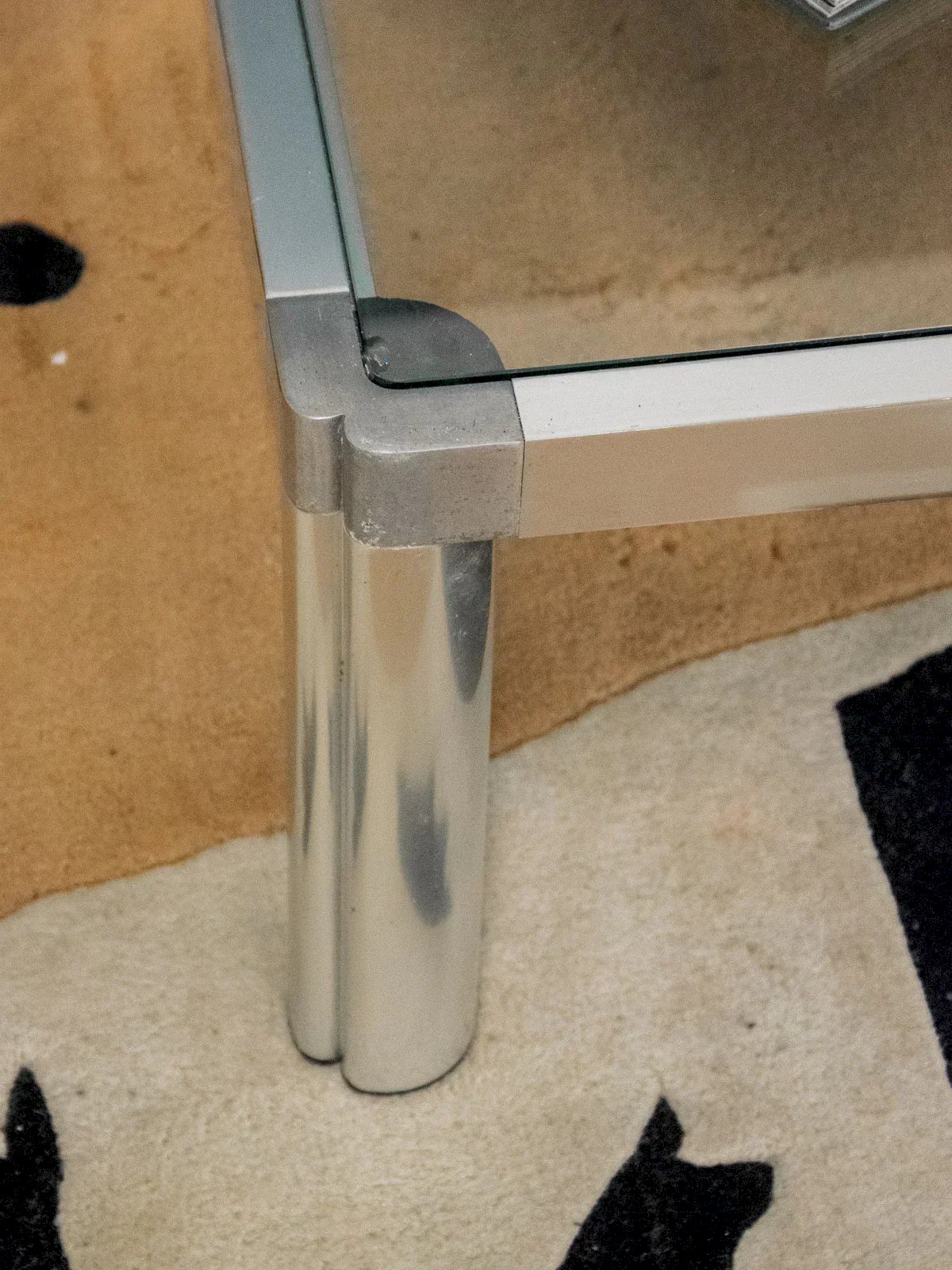 Elevate your living room with this square coffee table designed by Dutch designer Kho Liang Le (model 100 for Artifort, dating from the 1970s), whose modern elegance transcends time. Its brushed metal tubular structure creates a graphic and lightweight silhouette, while the transparent glass top allows the space to breathe and highlights the objects placed on it. Ideal as a central piece for a contemporary living space or as a discreet support for books and decorations, it brings a refined and functional atmosphere. Small chips on the glass and signs of use. The fame of designer Kho Liang Le far exceeds the borders of the Netherlands, where he spent most of his career. He is particularly known for his work for Artifort, but also for designing the interiors of Amsterdam's Schiphol Airport (1967). Length: 80 cm Width: 80 cm Height: 40 cm Condition: Used item. Item shows some superficial signs of wear, fully operational and functioning correctly. It may be a display model or an item returned to the store after a short period of use. Any imperfections. Brand: Debongout Type: Curated product Material: Metal, Glass Style: Contemporary Custom: Coffee tables