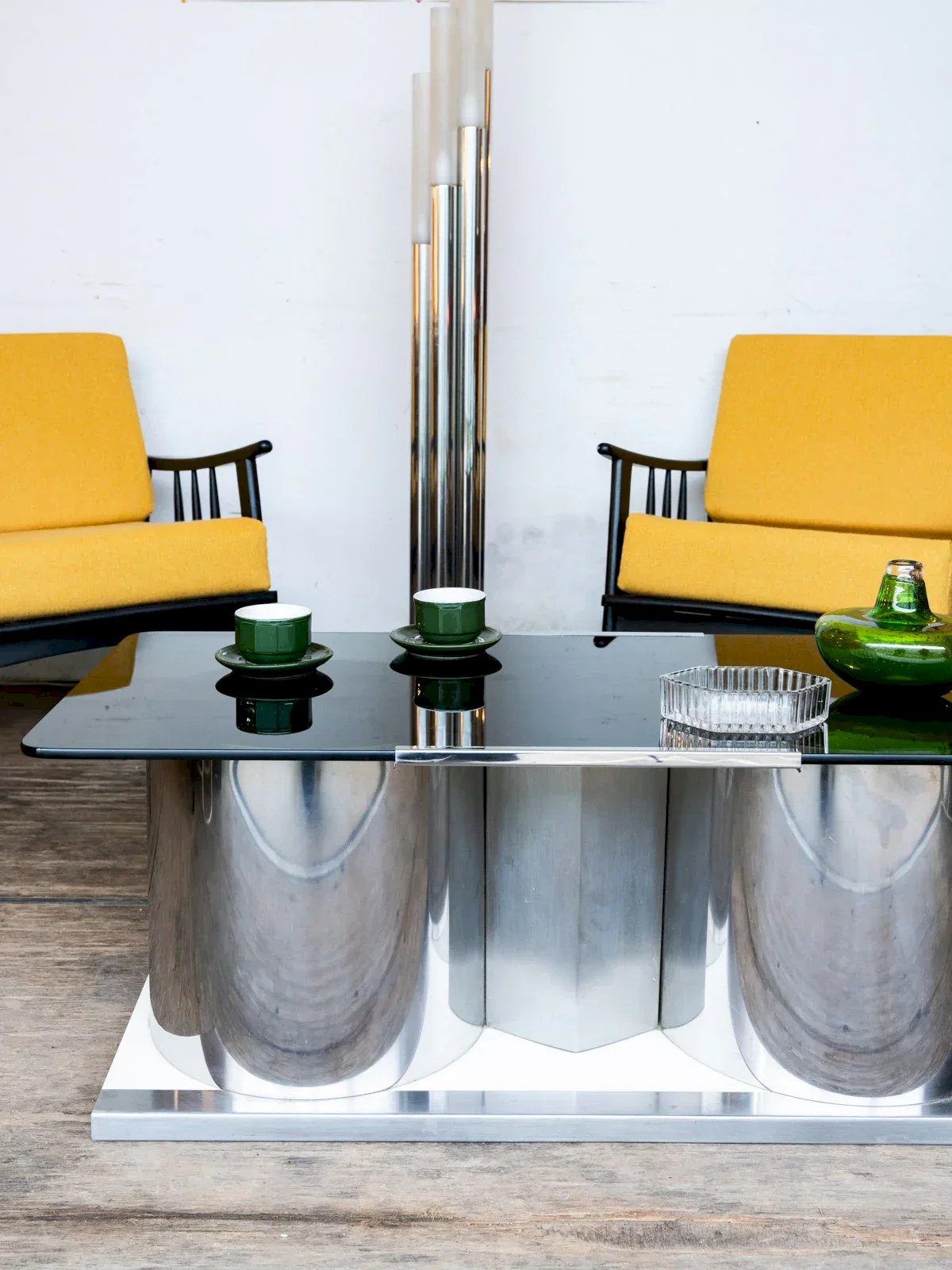 Transform your living room with this uniquely designed and functional coffee table. Its swiveling smoked glass top adds a touch of modernity while providing a modular space. The two elegant and practical chrome metal barrels serve as discreet storage for your magazines, remote controls, or other everyday items. The wooden base adds warmth and stability, perfectly balancing the whole piece. Ideal for a contemporary or industrial interior, this coffee table combines aesthetics and practicality. Make your living space both chic and organized. Online exclusive, the meeting will take place at your home! Length: 100 cm Width: 50 cm Height: 39.5 cm Depth: 33 cm Condition: Used: Item that has been used. Item showing some superficial signs of wear... Used: Item that has been used. Item showing some superficial signs of wear, fully operational and functioning correctly. It may be a demonstration model or an item returned to the store after a short period of use. potential imperfections. Brand: Debongout Type: Vintage product Material: Glass, Metal Style: Contemporary Customized: Coffee tables.