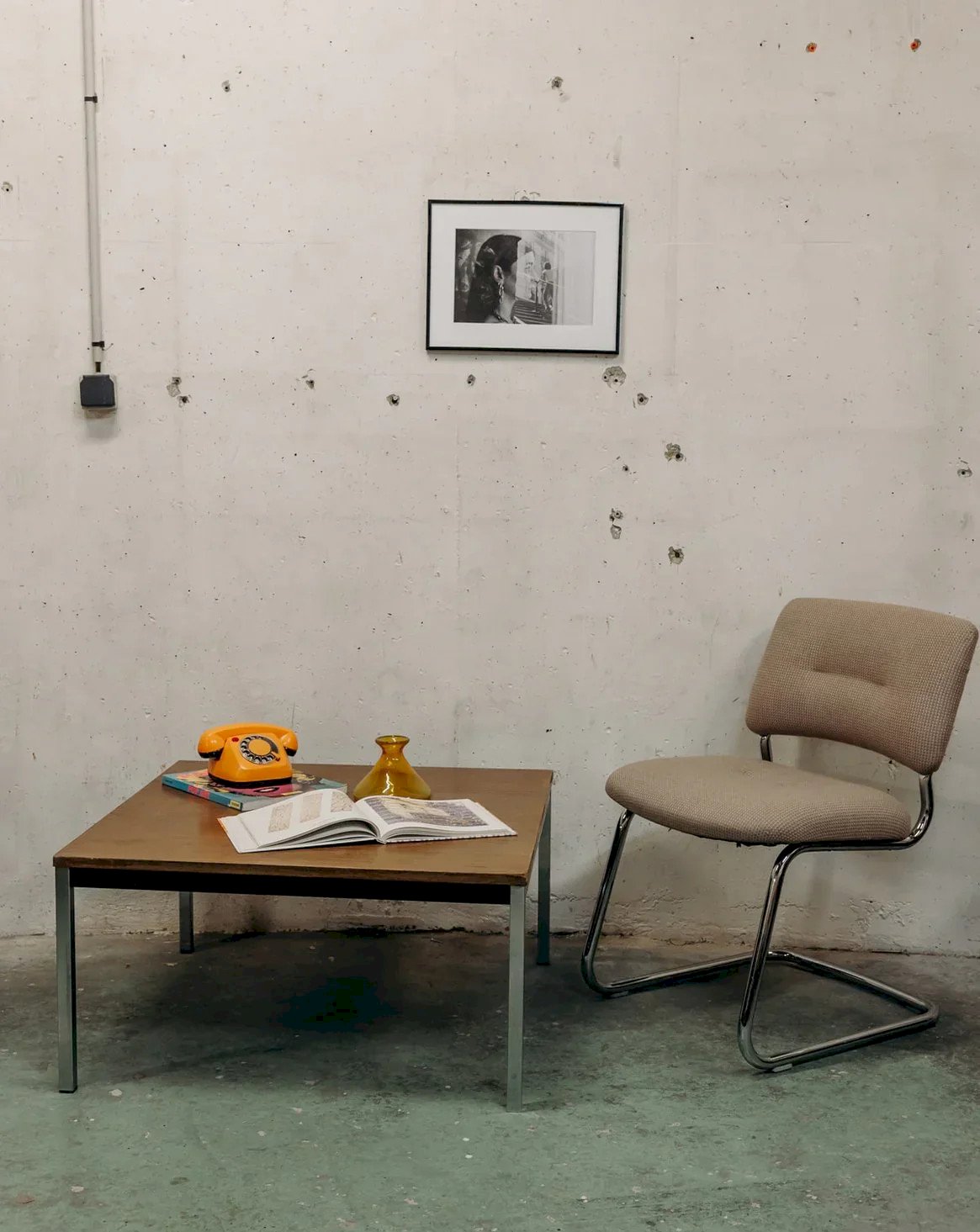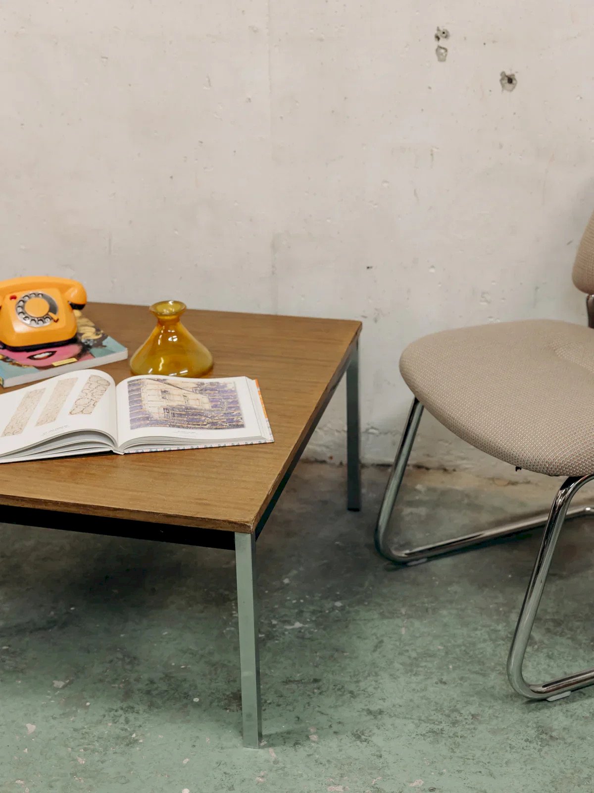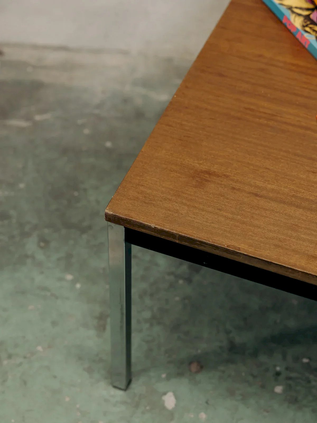 Discover a square coffee table that combines modern design and natural materials, featuring a warm wooden top and a lower black edge that highlights its elegant style. Its metal legs provide stability and visual lightness, creating a refined contrast with the wooden top. Practical and aesthetic, it easily integrates into a contemporary living room or an industrial-style interior. Ideal as a centerpiece, it offers a functional space for placing decorative objects, books, or drinks. This coffee table combines sturdiness, design, and functionality to enhance your living space. Length: 80 cm Width: 80 cm Height: 42 cm Condition: Used: Item has been used. Item shows some superficial wear marks, fully operational and functioning properly. It may be a display model or an item returned to the store after a short period of use, with any potential imperfections. Brand: Debongout Type: Vintage product Material: Wood, Metal Style: Contemporary Custom: Coffee tables.