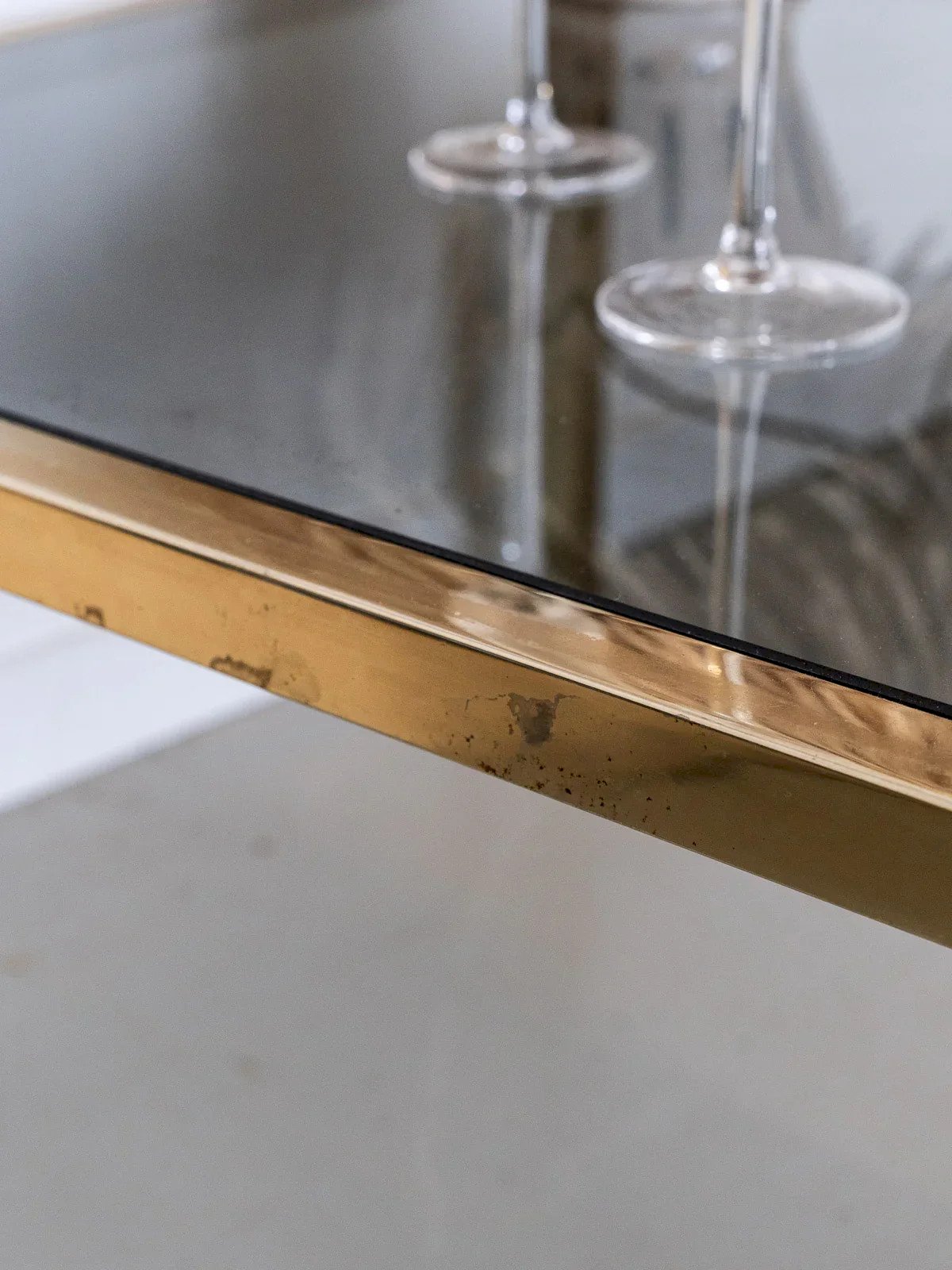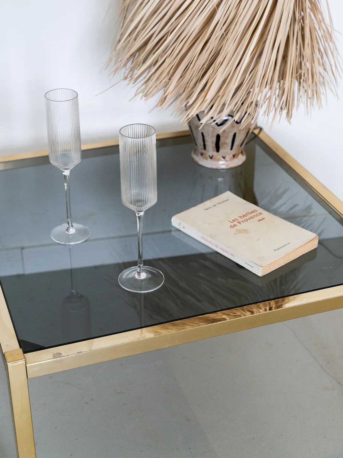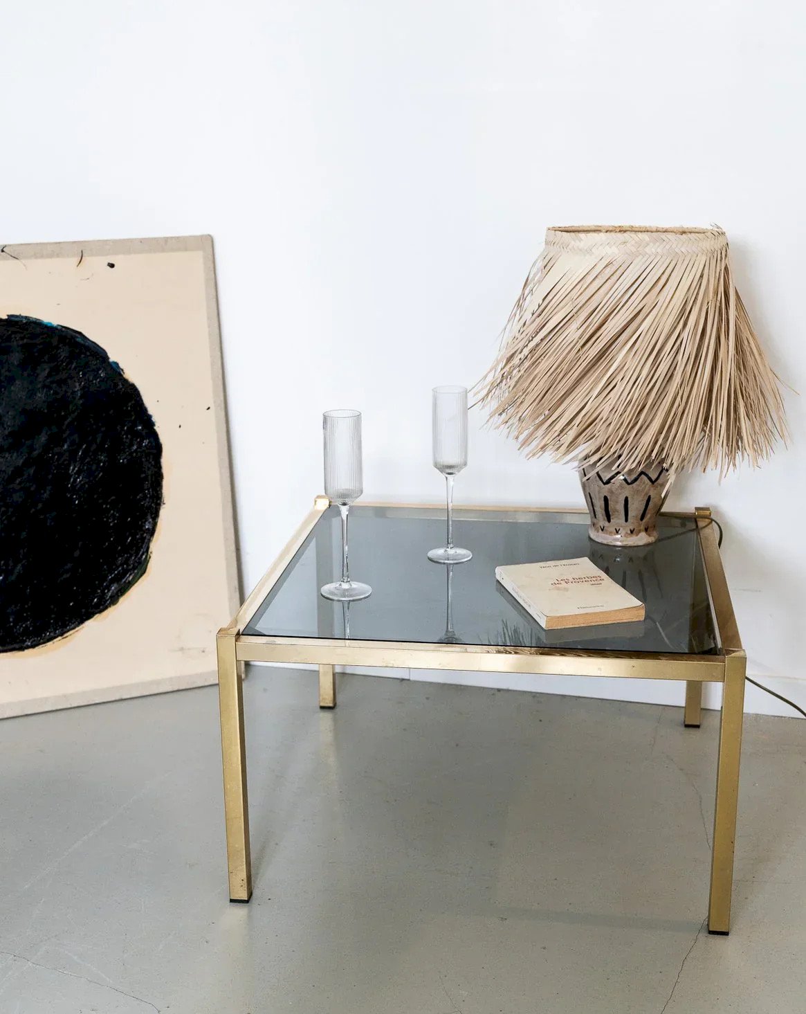 Discover this 70s coffee table, a true gem with timeless design. Its golden metal frame adds a touch of elegance, while the smoked glass top brings a note of modernity. Although there are some signs of age visible, they give it an authentic charm and tell its story. A perfect piece to enhance your interior with style. Length: 65 cm Width: 65 cm Height: 38 cm Condition: Used: Item that has been used. Item with some superficial wear marks, fully operational and functioning correctly. It could be a display model or an item returned to the store after a short period of use. Any imperfections. Brand: Debongout Type: Vintage product Material: Metal Style: Contemporary Custom: Coffee tables