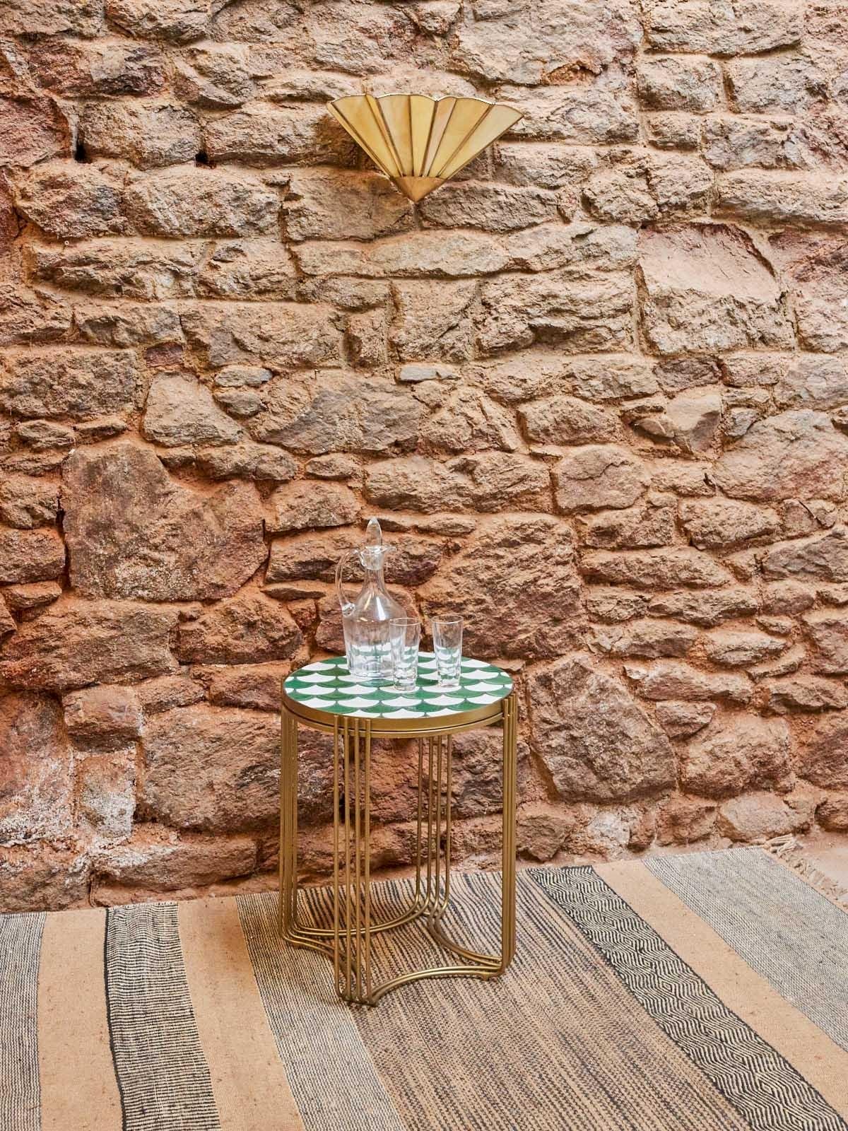 Invite this round coffee table in art deco style, combining the warmth of brass with the delicacy of green and white ceramic. Its contrasted surface holds cups, books, and decorative objects, while the unique structure, with four legs made of converging rods, creates a light and graphic silhouette. Elegant and contemporary, it establishes a refined atmosphere in the living room, perfect for highlighting a careful decor without overdoing it. Length: 40 cm Width: 40 cm Height: 50 cm Condition: Used: Item has been used. Item shows some superficial signs of wear, fully operational and functioning correctly. It may be a demonstration model or an item returned to the store after a short period of use. Any imperfections. Brand: Debongout Type: Thrifted product Material: Ceramic, Brass Style: Contemporary Custom: Coffee tables