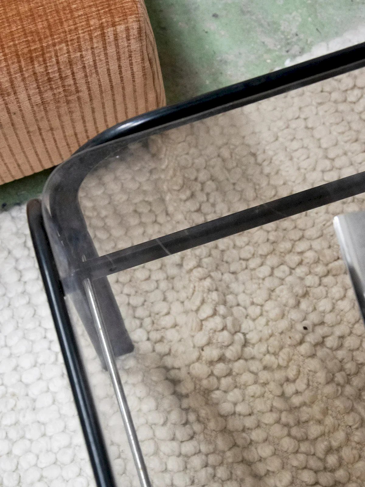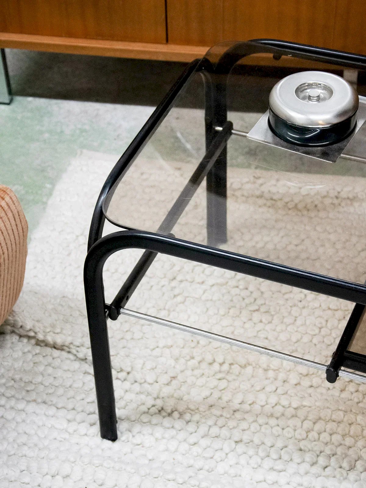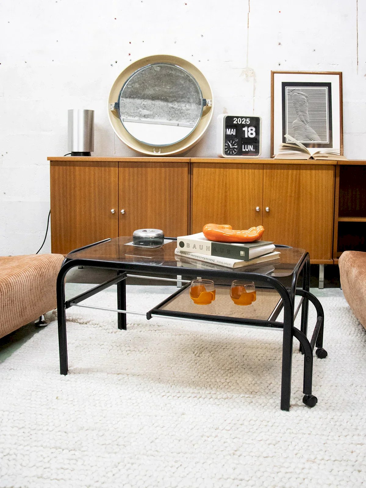 Discover this black metal and glass coffee table, a piece with a contemporary design made to adapt to all situations. Its retractable top mounted on wheels offers great flexibility of use: perfect for entertaining, sharing an appetizer, or simply enjoying a cozy moment. Its elegant and discreet look allows it to fit into all interiors, combining practicality and aesthetics in everyday life. Overall length: 125 cm Length: 75 cm Width: 45 cm Height: 40 cm Condition: Second hand: Item that has been used. Item showing some superficial wear marks, fully operational and functioning correctly. It may be a demonstration model or an item returned to the store after a short period of use. Any potential imperfections. Brand: Debongout Type: Thrifted product Material: Metal, Glass Style: Contemporary Customized: Coffee tables