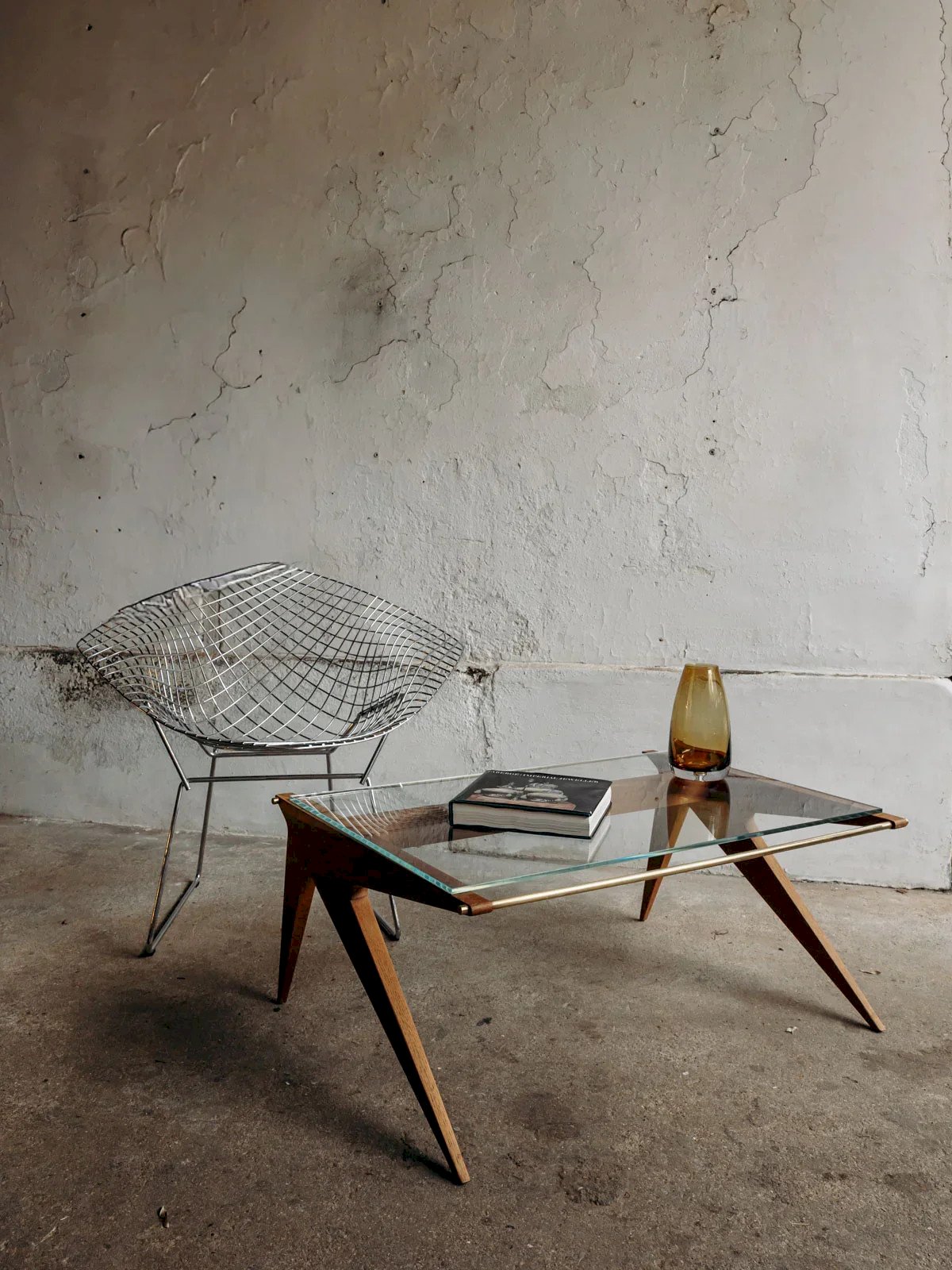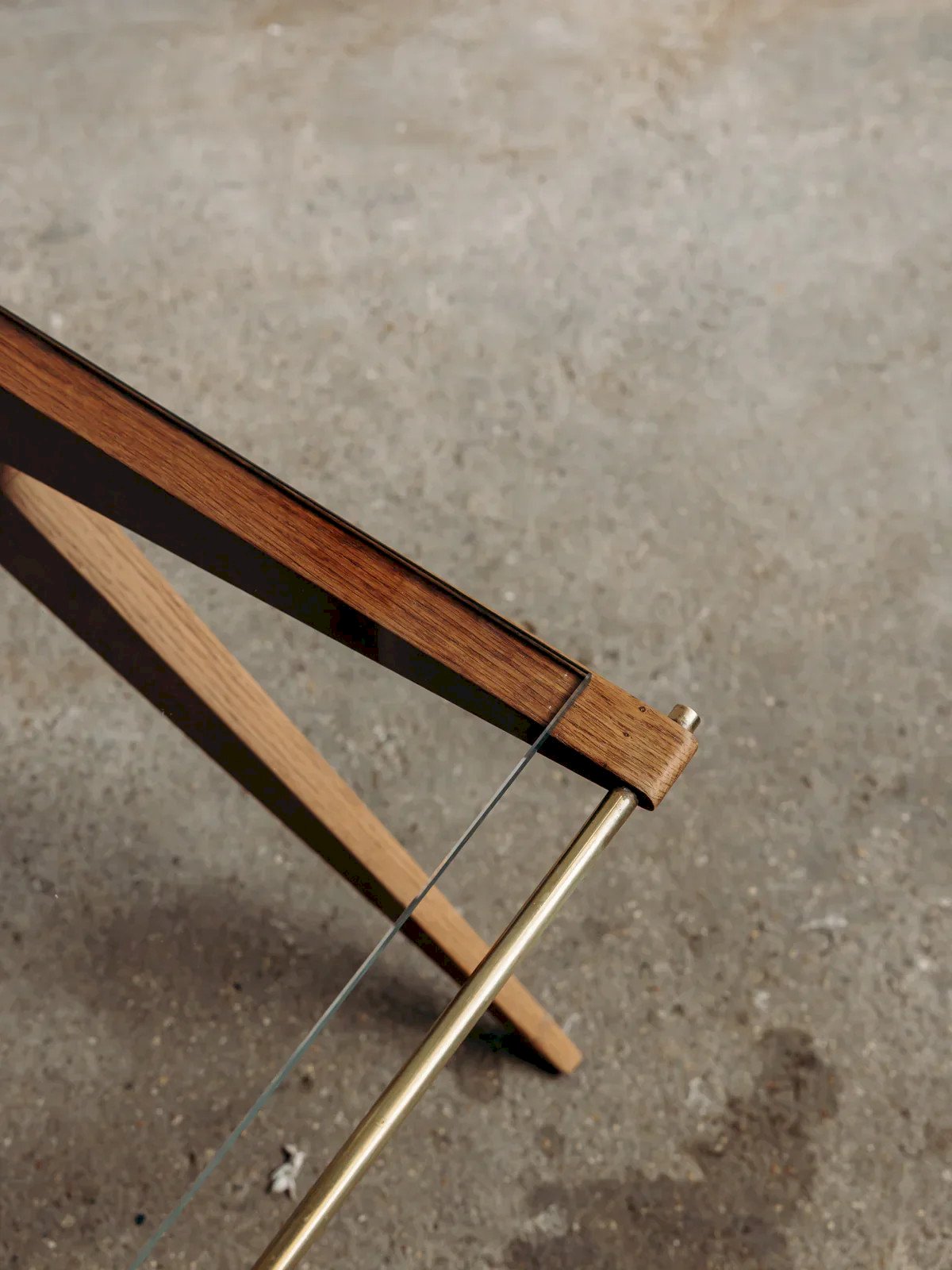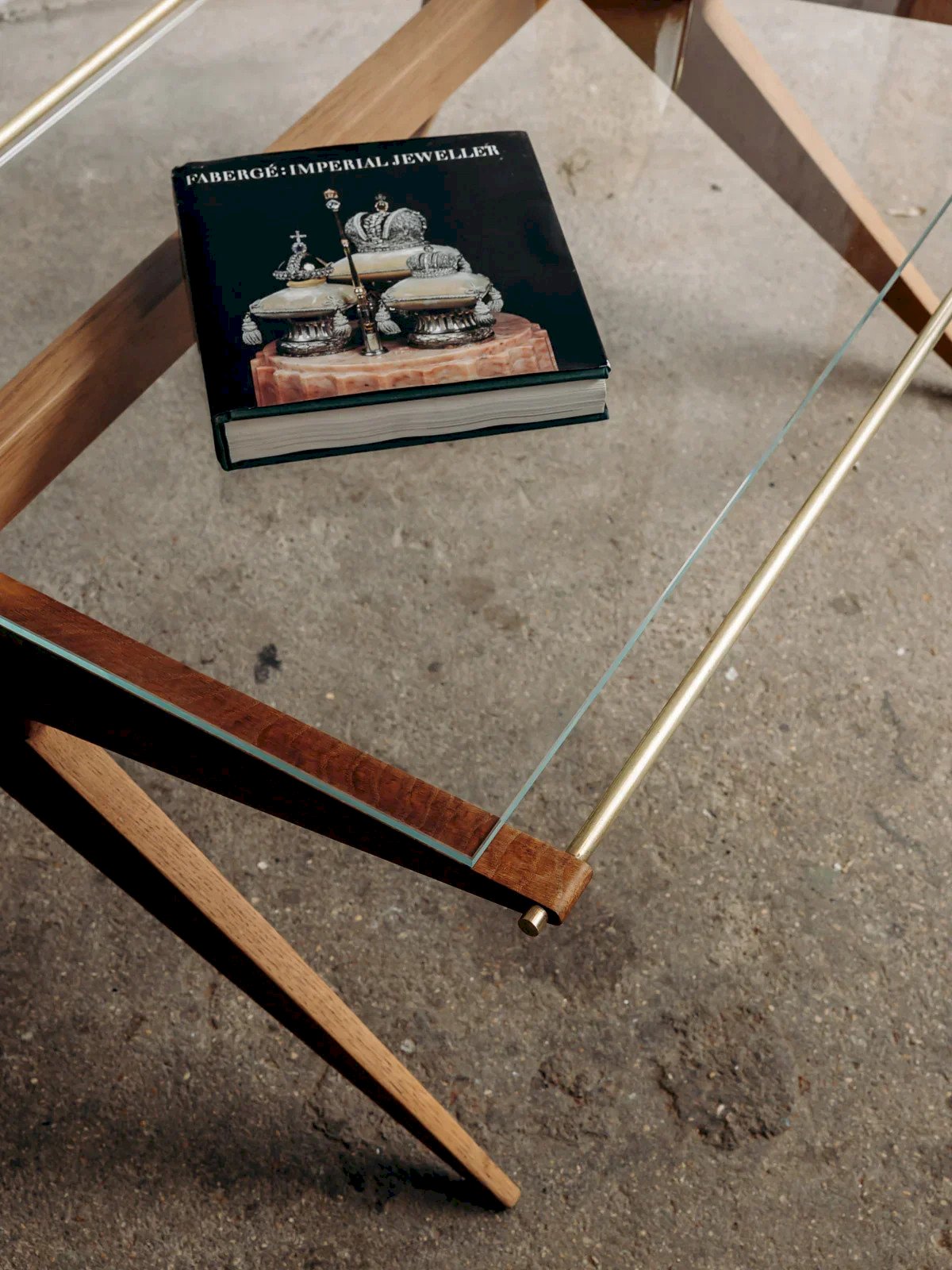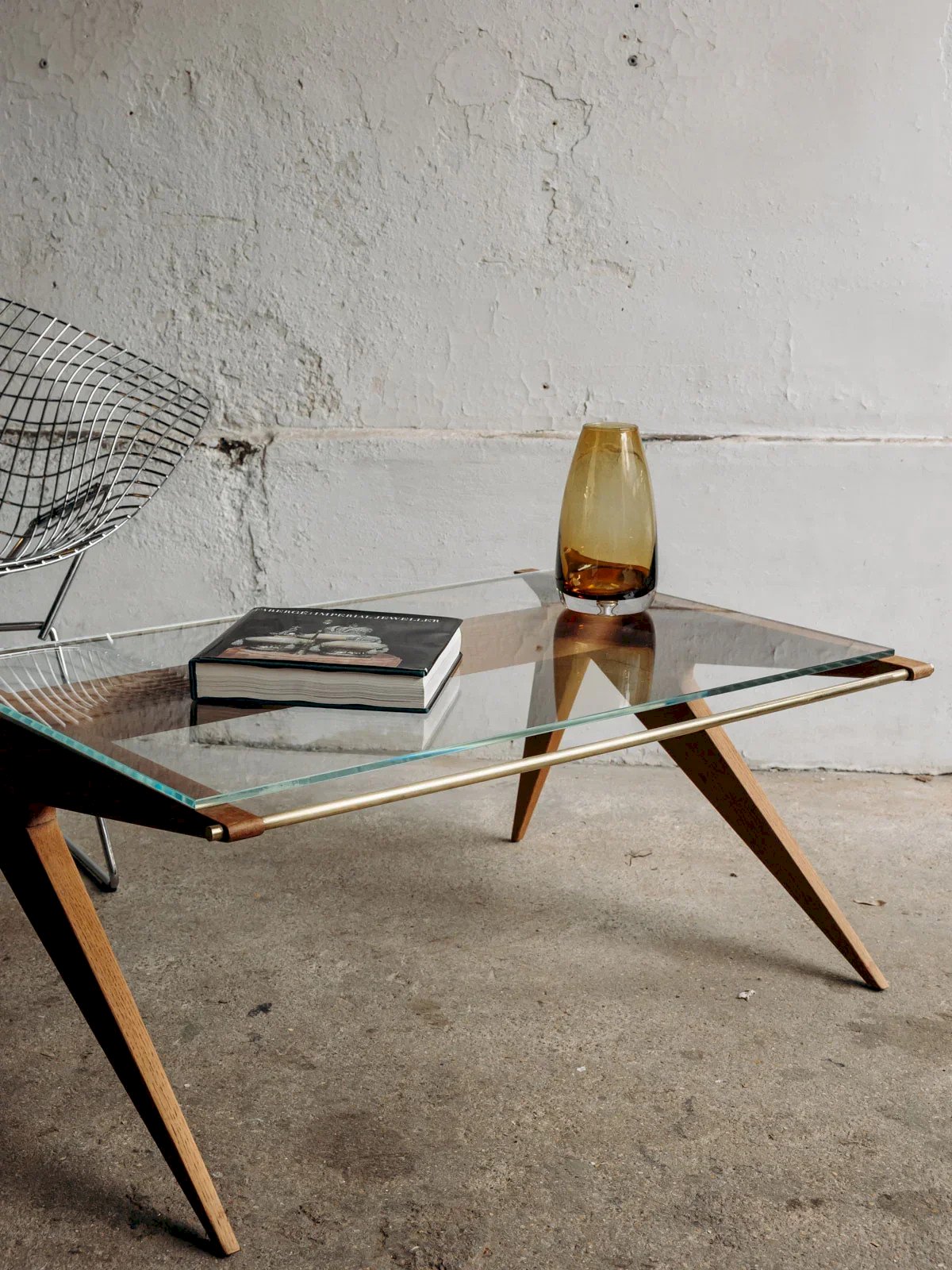Discover this 1960s coffee table by Louis Paolozzi for Guermonprez, made of light oak, glass, and brass. Its generous proportions accommodate magazines and objects, while the combination of light wood and brass adds a subtle elegance to the living room. A new glass top has been installed for daily use, and the original glass can be provided to preserve authenticity; a rare model in good overall condition. There is a small blemish on the original glass. Length: 89 cm Width: 65 cm Height: 38.5 cm Condition: Used: Item has been utilized. Item shows some signs of superficial wear, fully operational and functioning correctly. It may be a display model or an item returned to the store after a short period of use. Potential imperfections may be present. Brand: Debongout Type: Vintage product Material: Wood, Oak, Glass, Brass Style: Contemporary Custom: Coffee tables