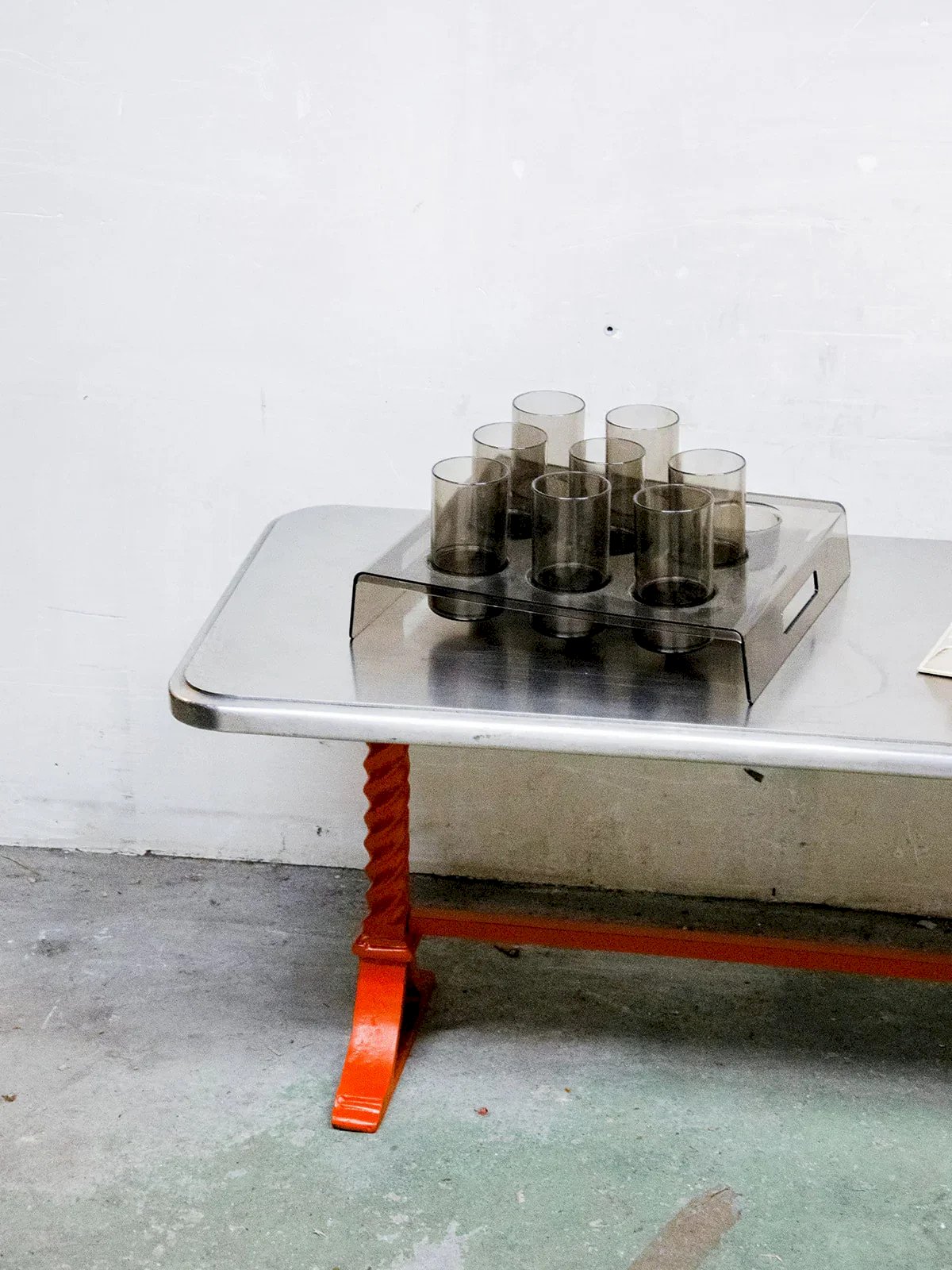 Fall for this unique metal coffee table. Its orange cast iron base brings a lively touch to the room, while its striped stainless steel top adds depth and character. Perfect for accompanying your moments of relaxation, it combines bold style and a warm spirit. A piece full of personality that will naturally find its place in your living room. Length: 131 cm Height: 46 cm Depth: 46 cm Condition: Used: Item has been used. Item shows some signs of superficial wear, fully operational and functioning correctly. It may be a display model or an item returned to the store after a short period of use. Any potential imperfections. Brand: Debongout Type: Curated product Material: Metal, Cast iron, Stainless steel Style: Contemporary Customized: Coffee tables.