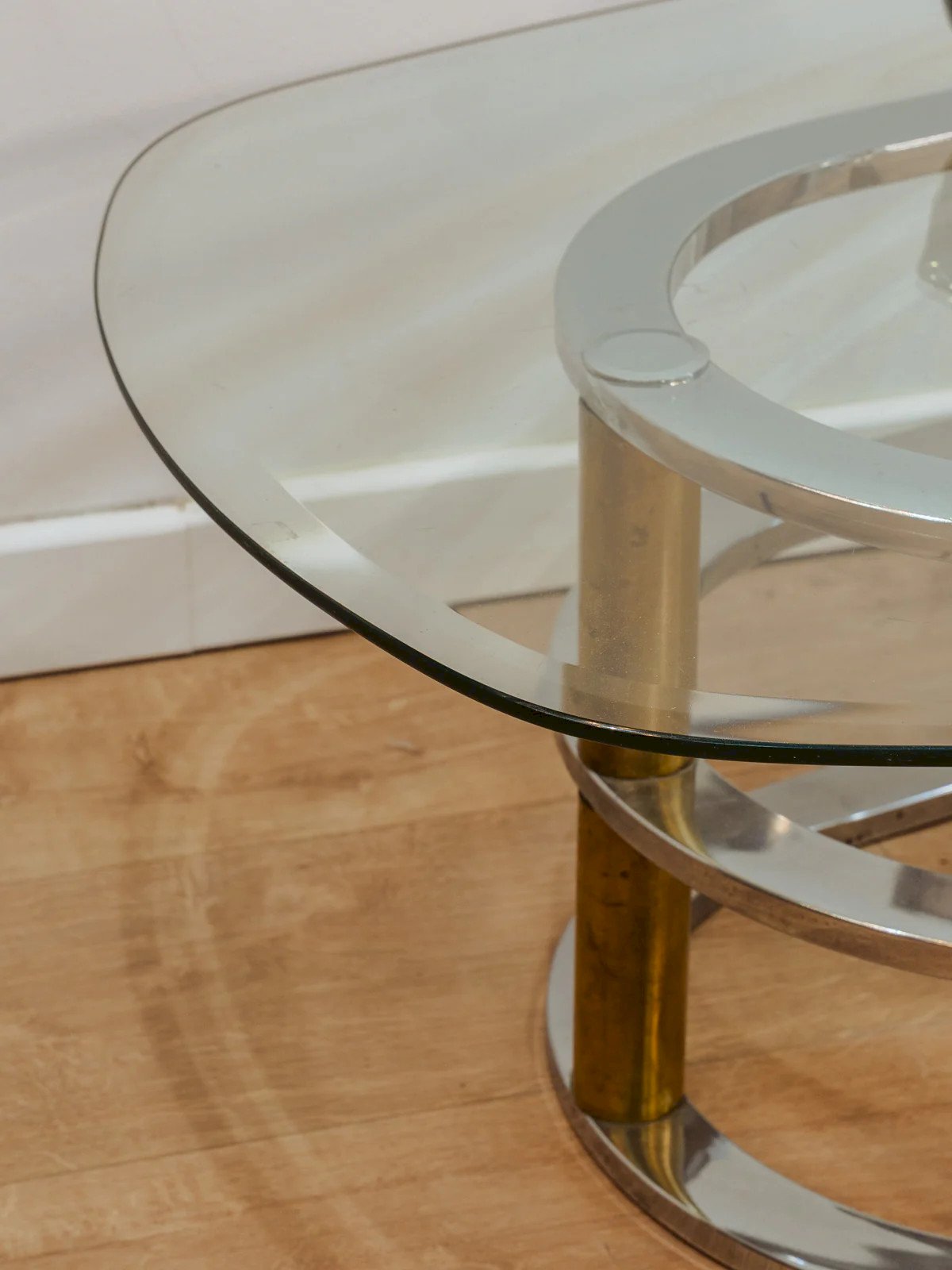 Add a contemporary touch to your living room with this oval coffee table featuring a glass top and chrome legs, whose proportions open up the space without weighing down the room. The transparent top showcases books and decorative objects, while the chrome structure adds a light and graphic look. Ideal for a minimalist living area, it creates a bright and refined atmosphere, perfect for entertaining or relaxing moments. Some signs of wear are present. Length: 130 cm Width: 70 cm Height: 30 cm Condition: Used: Item has been used. Item shows some superficial wear marks, ...Used: Item has been used. Item shows some superficial wear marks, fully operational and functioning properly. It may be a display model or an item returned to the store after a short period of use. any potential imperfections. Brand: Debongout Type: Vintage product Material: Glass, Chrome Style: Contemporary Customizable: Coffee tables