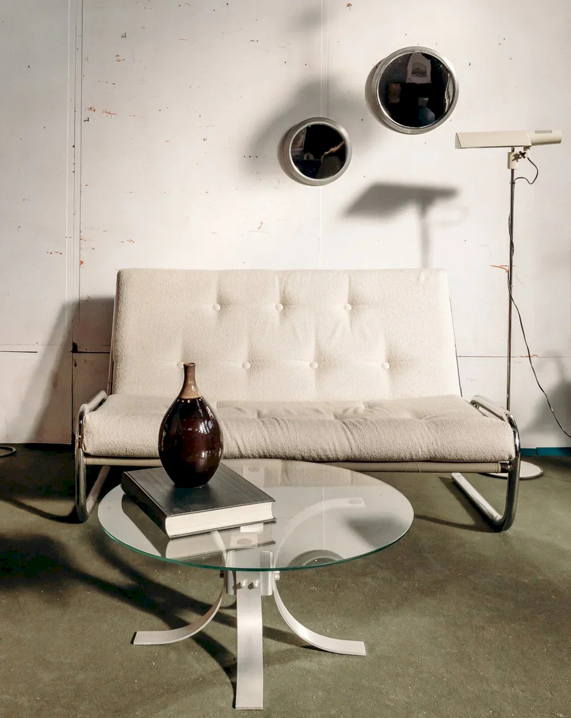 Add a touch of elegance to your interior with this small coffee table featuring a round glass top. Its chrome structure gives a modern and refined look while ensuring great stability. Ideal for a contemporary living room, it fits perfectly into all styles of decor while providing a practical space for your drinks and books. A true aesthetic asset for your living space. Height: 31 cm Diameter of the top: 65 cm Condition: Used: Item that has been used. Item showing some superficial signs of wear... Used: Item that has been used. Item showing some superficial signs of wear, fully operational and functioning properly. It may be a display model or an item returned to the store after a short period of use. Any imperfections. Brand: Debongout Type: Vintage product Material: Metal, Glass Style: Contemporary Custom: Coffee tables