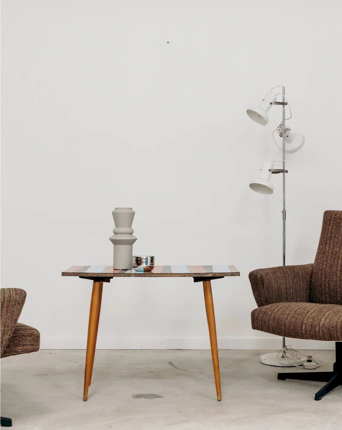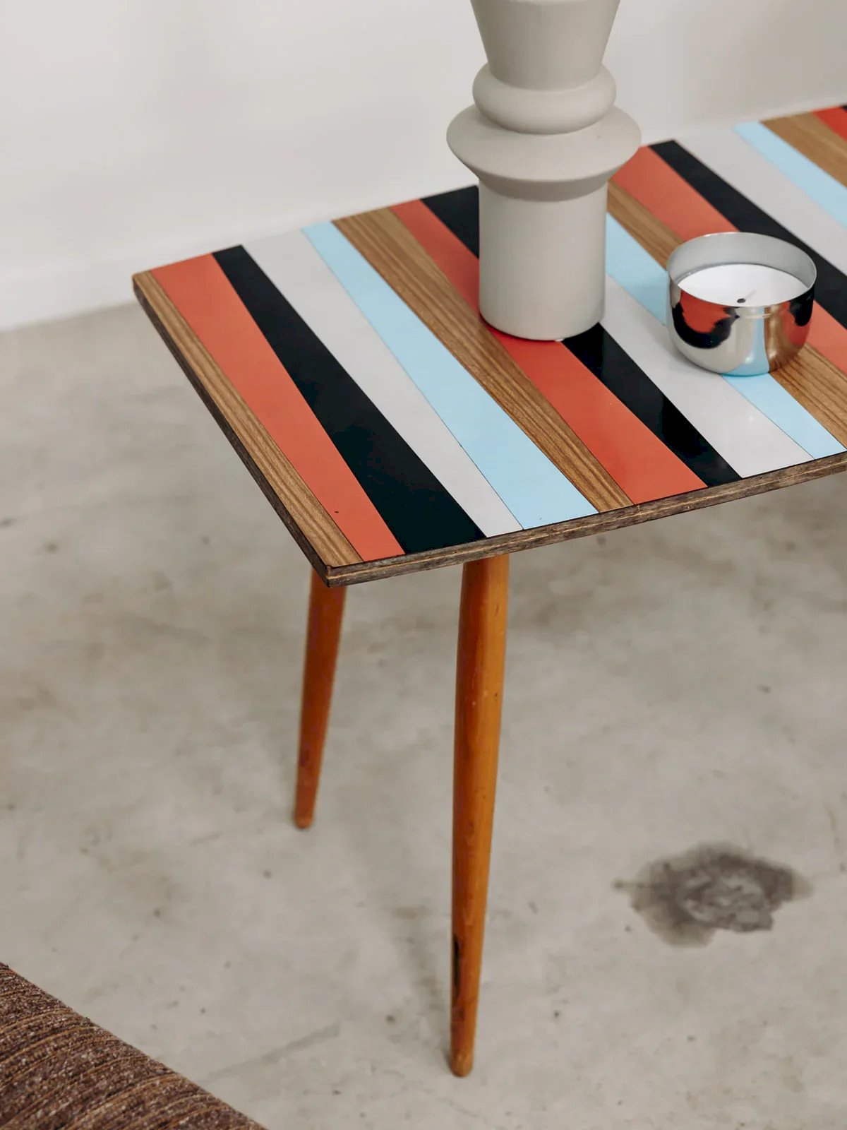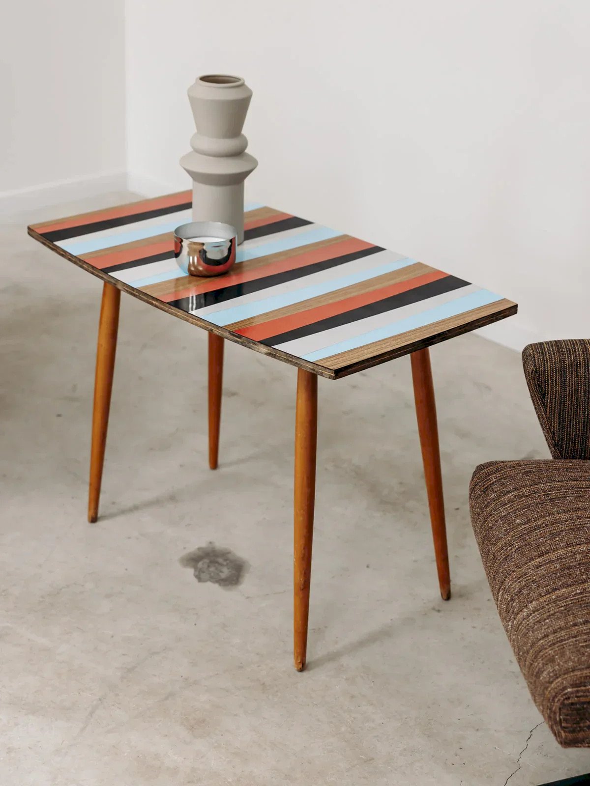 This elegant little table caught our eye for its unique look. We love its bold Scandinavian style with its slender tapered legs, but especially its colorful striped top. The perfect original touch! Its minimalist and modern design makes it a perfect piece for a contemporary or retro interior. It can fit well in a living room or in the corner of a bedroom or office, adding the perfect vintage touch to your space. Length: 78 cm Width: 44 cm Height: 55 cm Condition: Used: Item that has been used. Item showing some superficial signs of wear, ...Used: Item that has been used. Item showing some superficial signs of wear, fully operational and functioning correctly. It may be a display model or an item returned to the store after a short period of use. any potential imperfections. Brand: Debongout Type: Thrifted product Material: Wood Style: Contemporary Customizable: Coffee tables