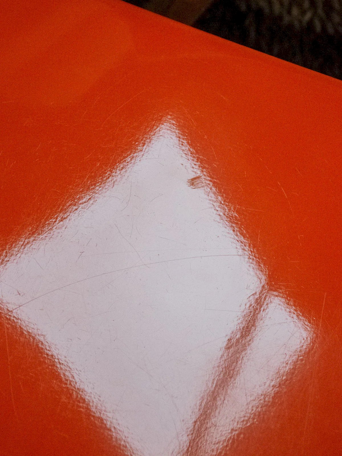 Invite a touch of the 70s with this orange fiberglass accent coffee table featuring a graphic design, whose warm hue energizes the space. Its compact size makes it ideal as an end table or in a reading nook, while the smooth, durable surface combines practicality and visual elegance. Perfect for creating a retro and colorful atmosphere without overwhelming the space. Slightly visible signs of time. Length: 60 cm Width: 44 cm Height: 36.5 cm Height under the top: 31 cm Condition: Used: Item that has been used. Item showing some superficial signs of wear, fully operational and functioning correctly. It may be a display model or an item returned to the store after a short period of use. Any possible imperfections. Brand: Debongout Type: Vintage product Material: Fiberglass Style: Contemporary Custom: Coffee tables