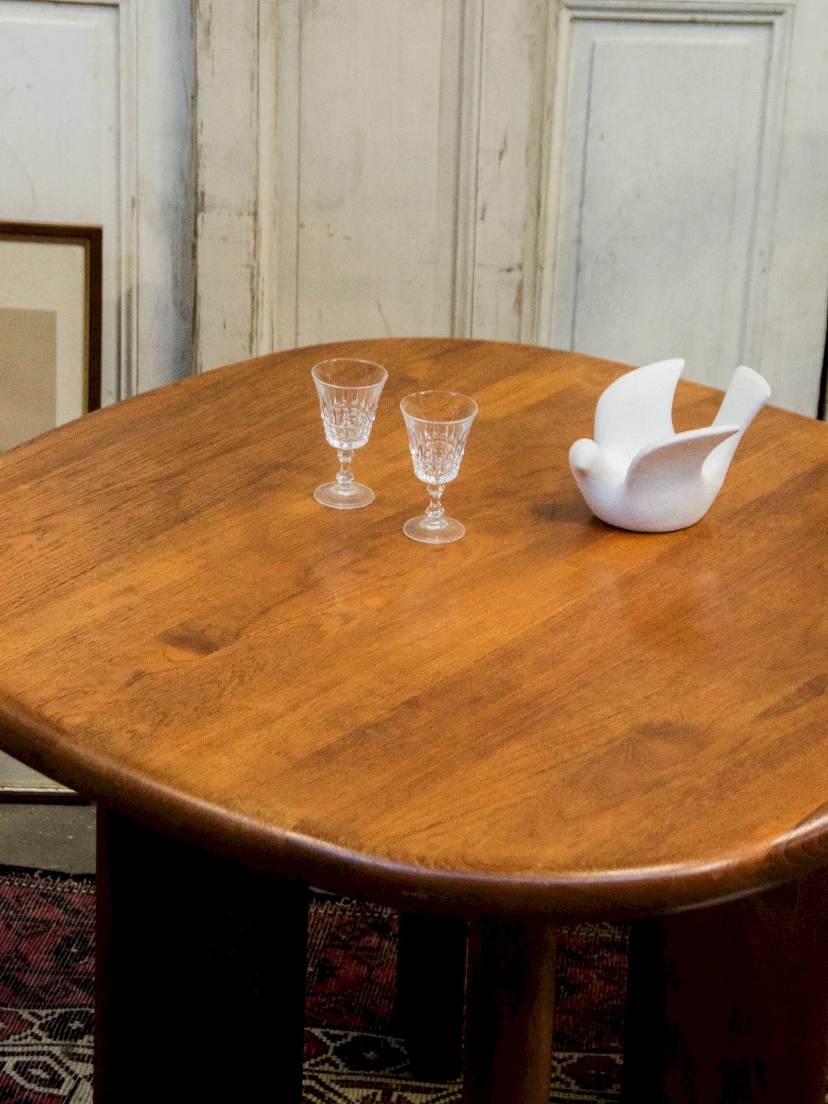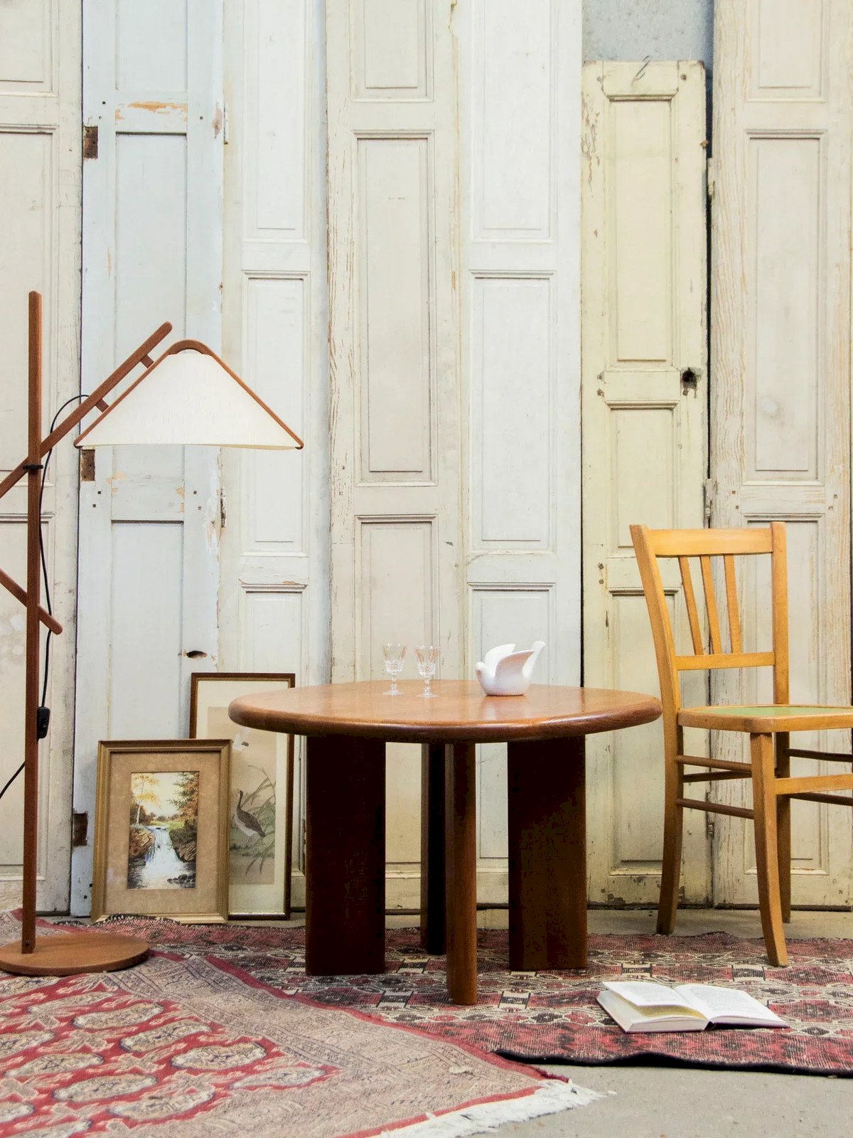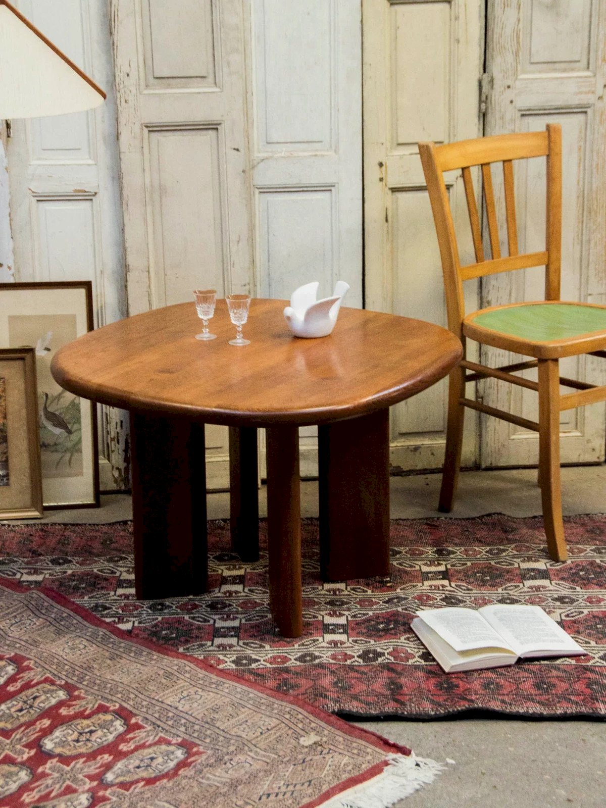 Adopt this 1970s teak coffee table, probably Danish-inspired, which charms with its simplicity and balanced lines. Its rounded top and compact proportions make it a welcoming piece of furniture, perfect for anchoring a living corner and showcasing objects and books. The warm grain of teak brings a natural and elegant ambiance, easy to match with different interior styles. Slight signs of use on the top. Height: 52 cm Diameter of the top: 75 cm Condition: Used: Item has been used. Item shows some superficial wear marks... Used: Item has been used. Item shows some superficial wear marks, fully operational and functioning correctly. It may be a demonstration model or an item returned to the store after a short period of use, with possible imperfections. Brand: Debongout Type: Vintage product Material: Teak, Wood Style: Contemporary Customizable: Coffee tables.