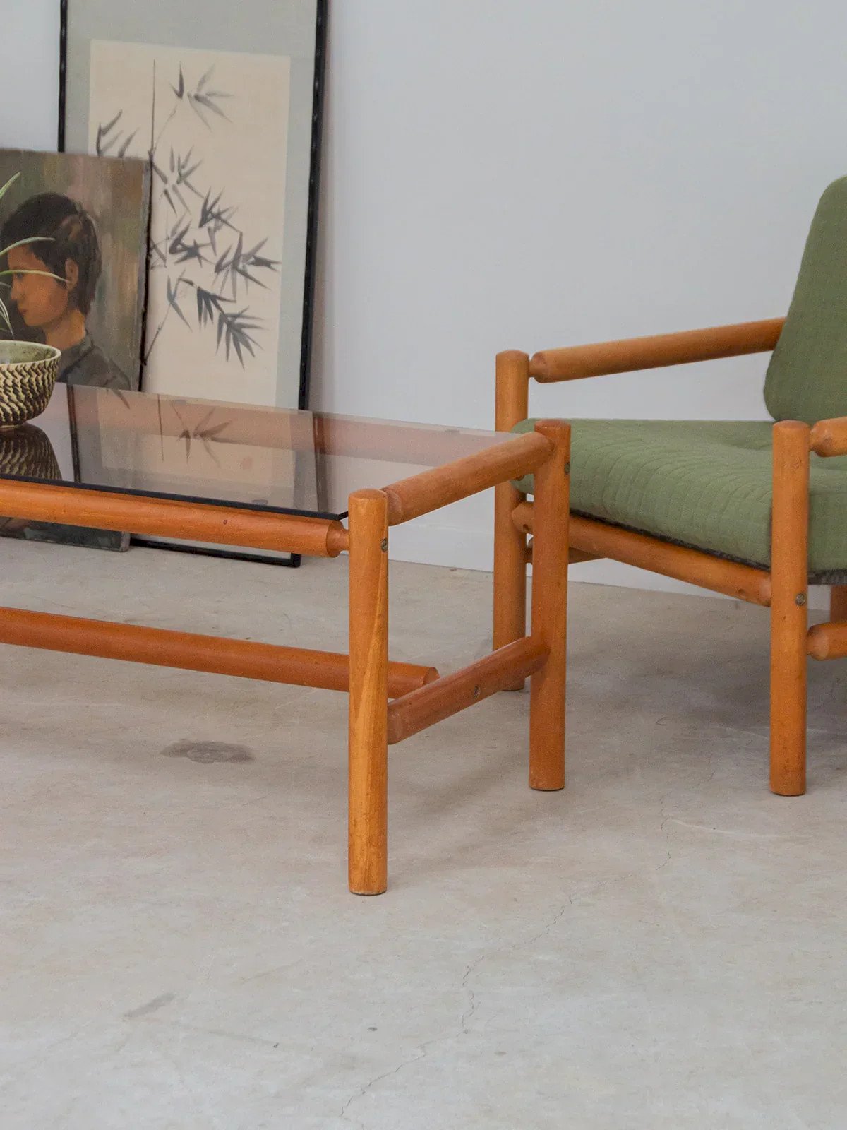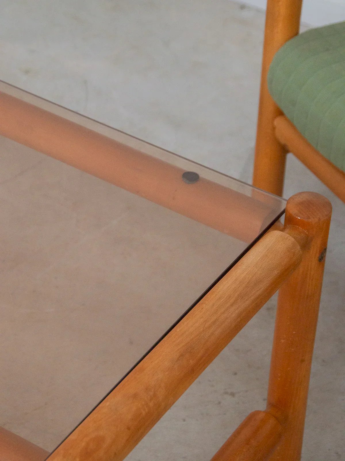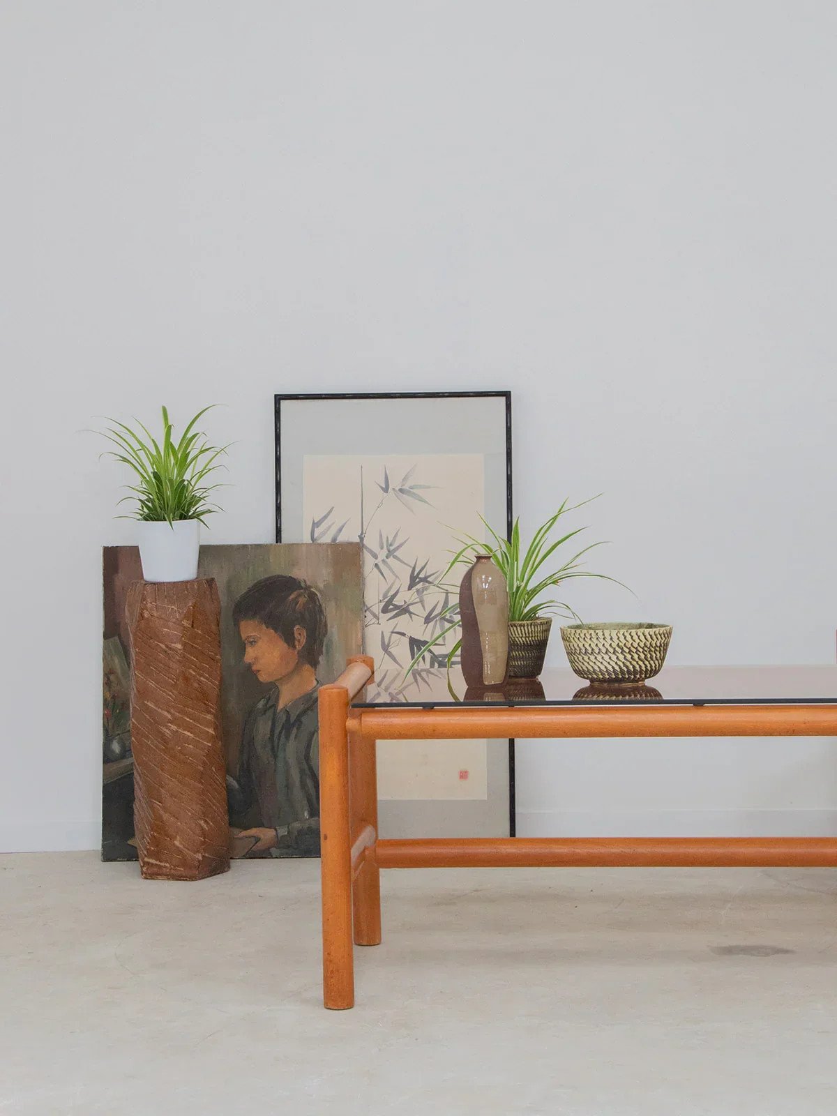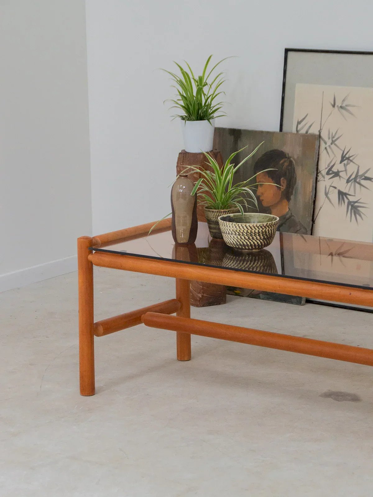 Discover this large light wood coffee table, elegant and functional, with its glass top that adds a touch of lightness to the whole. The wooden structure with rounded finishes adds softness and fluidity to its design, while highlighting the natural aspect of the material. Perfectly balanced between modernity and simplicity, this coffee table easily fits into all types of interiors, while bringing a warm and bright note to your living room. Length: 120 cm Width: 55 cm Height: 51 cm Condition: Used: Item has been used. Item shows some superficial signs of wear... Used: Item has been used. Item shows some superficial signs of wear, fully operational and functioning properly. It may be a display model or an item returned to the store after a short period of use. any potential imperfections. Brand: Debongout Type: Curated Product Material: Wood, Glass Style: Contemporary Custom: Coffee Tables