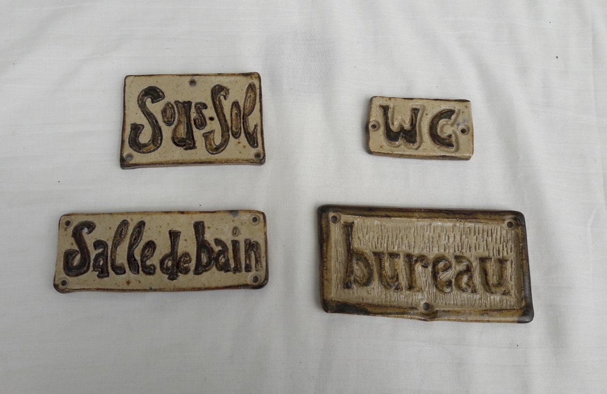 Set of 4 ceramic or stoneware door plates from St Tryphon (marked on the back) in Switzerland. "Basement," "W.C," "Office," and "Bathroom." Very good overall condition, never used. Dimensions of "office": 14 cm X 7.5 cm X 0.7 cm. Total weight: 0.5 kg. Please feel free to contact us for any further information and/or to make your offers. See my other items for sale.