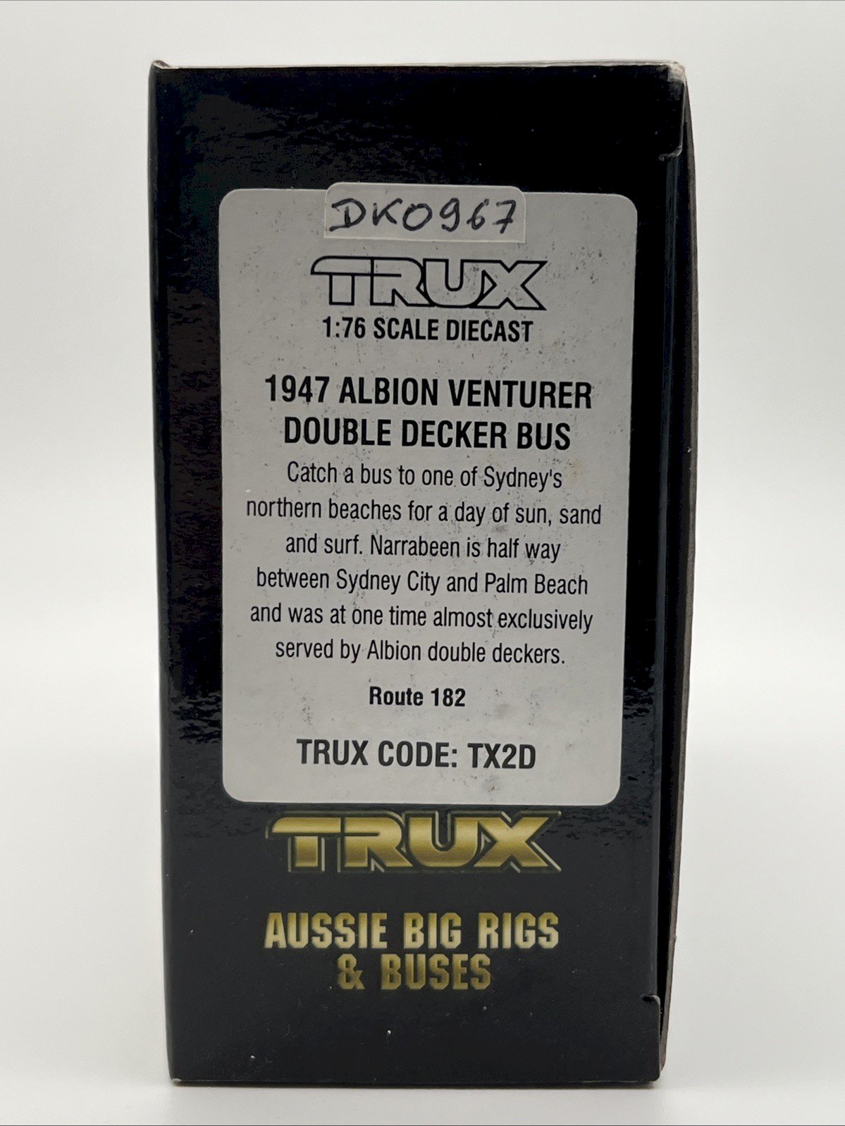 Double Decker Bus Albion Venturer Route 182 TX2D 1/76 Trux Condition: Used item. Please refer to the seller's description for more details... Used item. Any imperfections. Vehicle type: Albion Scale: 1:76 Country of origin: Metropolitan France Vehicle brand: Venturer Vehicle model: RT BUS