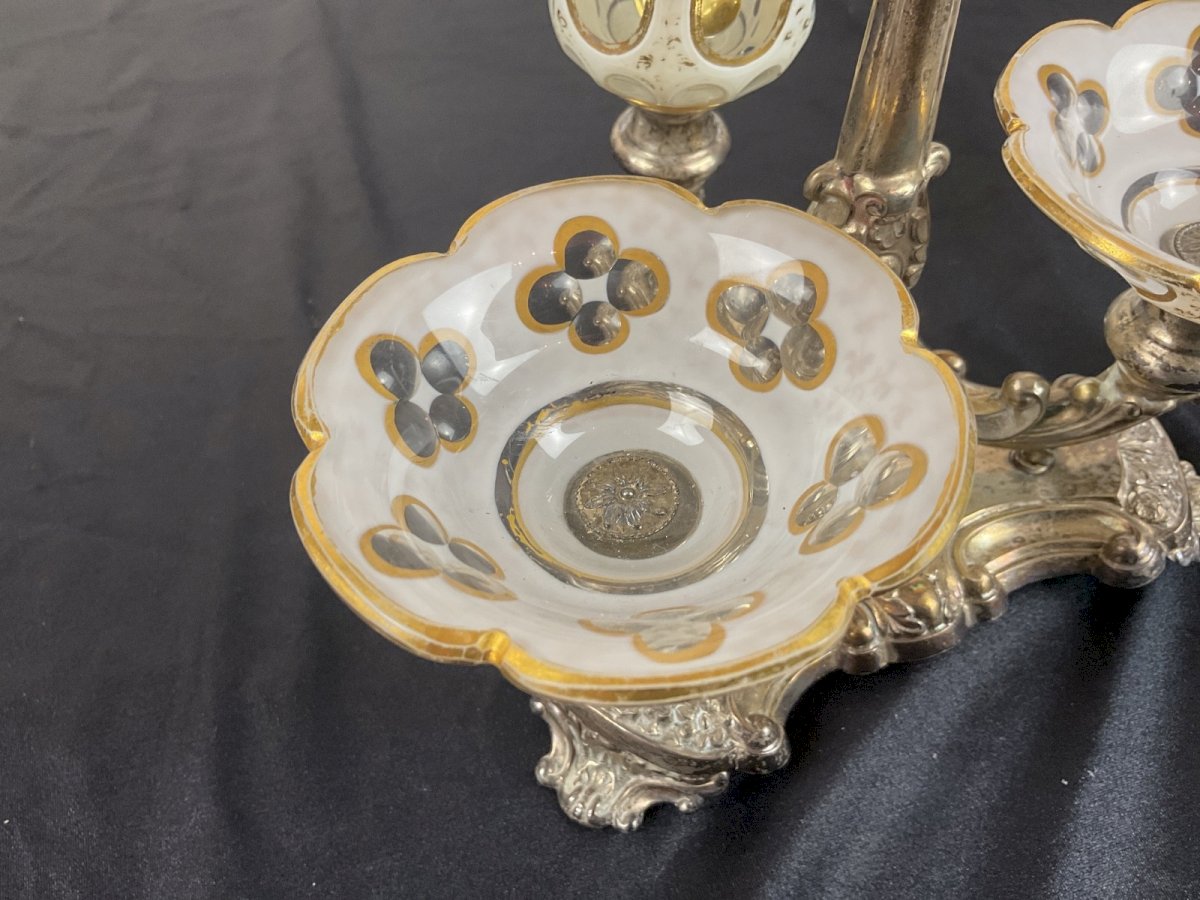 DOUBLE MUSTARD POT IN GLASS overlay on top gold, GERMAN SILVER HALLMARK Be careful, one of the feet is broken Height: 21.5 cm Width: 19 cm Authenticity: Original Type: Tableware, Kitchen Brand: Silver Origin: France Sub-type: Mustard pots Material: Solid silver