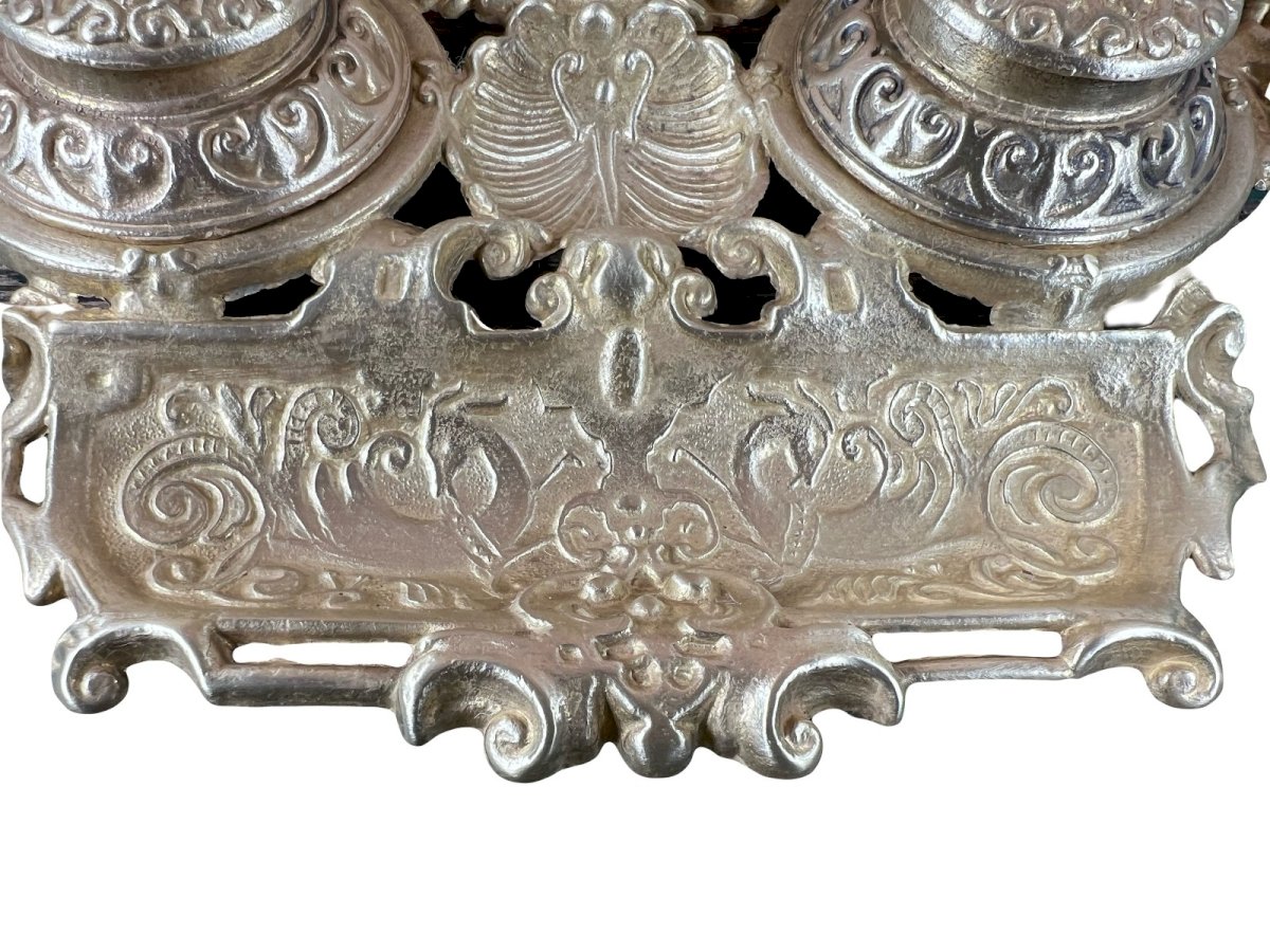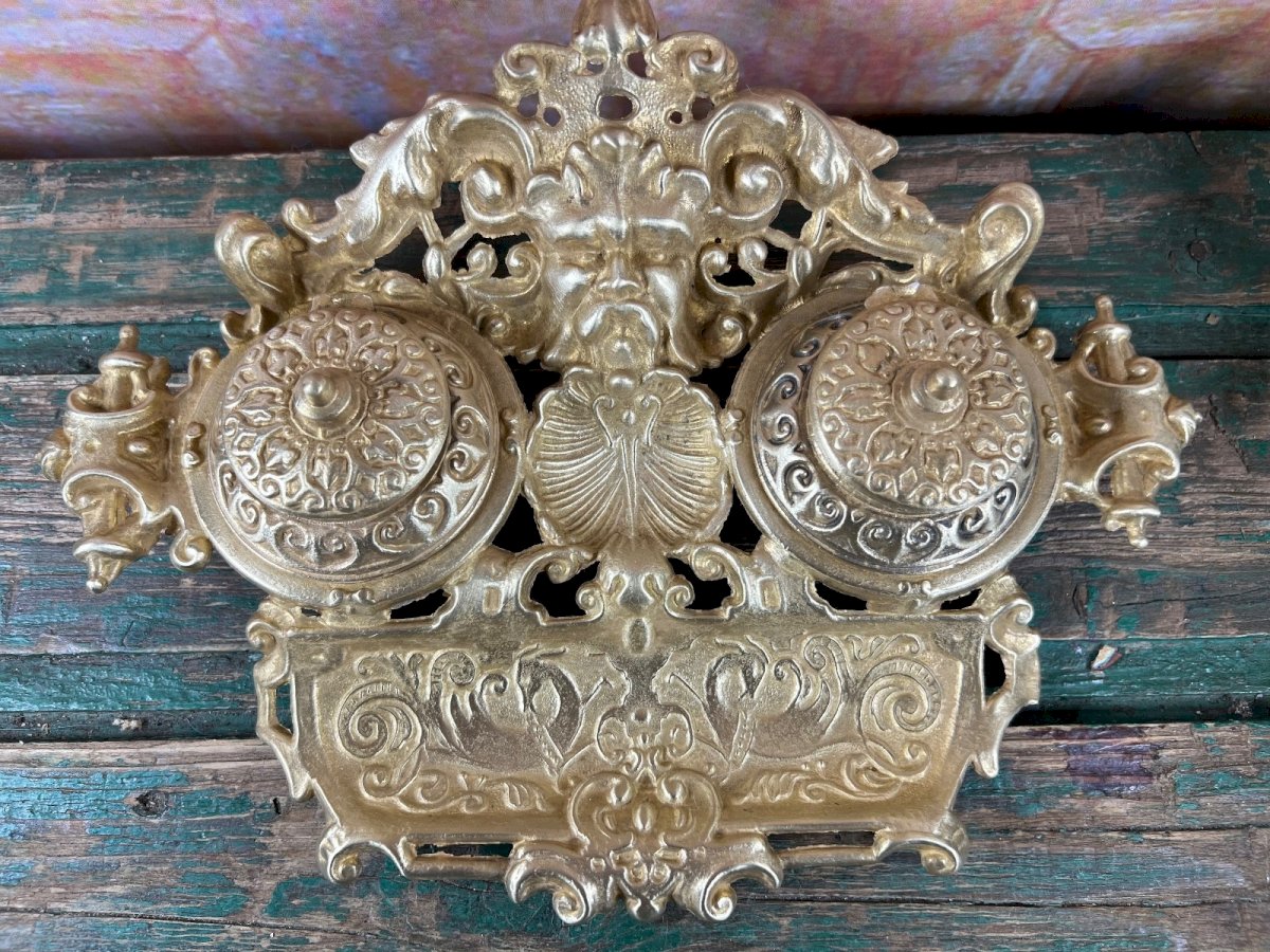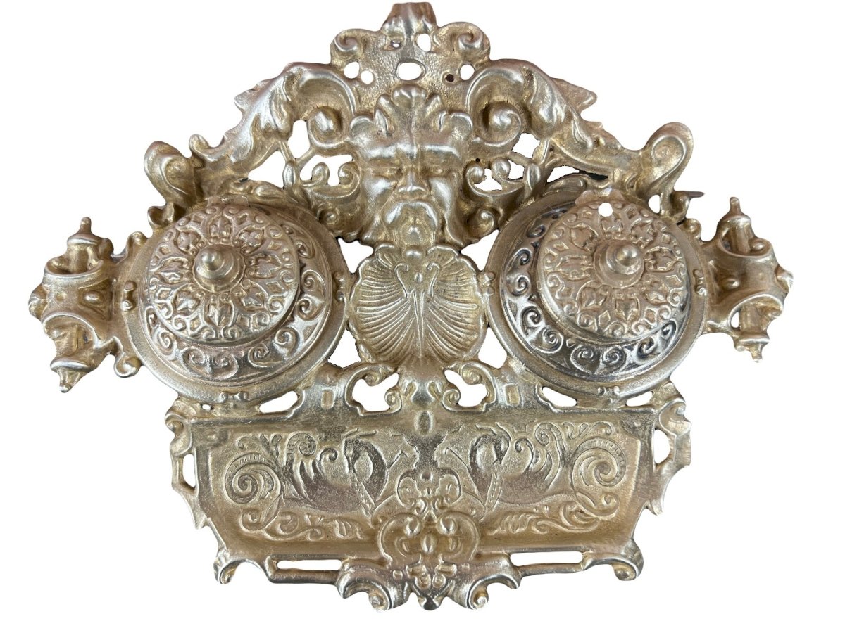 Antique double inkwell in gold-plated brass – Rococo style – France, late 19th century. Stunning double inkwell in richly decorated gold-plated brass, adorned with rocaille scrolls, a central shell, and a type of green man face. A characterful decorative object, typical of writing accessories from the late 19th century. The two hinged lids open effortlessly and retain their original reservoirs. The lower part forms a small tray for pens, cards, or office accessories. A strong, elegant, and highly expressive decorative piece. Dimensions Width: 28 cm (11 in) Depth: 21 cm (8.2 in) Height: 5.5 cm (2.1 in) Condition Good antique condition with normal signs of use for its age. Natural oxidation inside the inkwells. See all photos, they are an integral part of the description. Shipping Careful packaging and secure shipping with tracking. International shipping available. Condition: Used: Item that has been used. Please refer to the seller's description for more details... Used: Item that has been used. any imperfections. Number of pieces: 1 Type: Inkwell Period: 19th century Country of origin: France Material: Brass