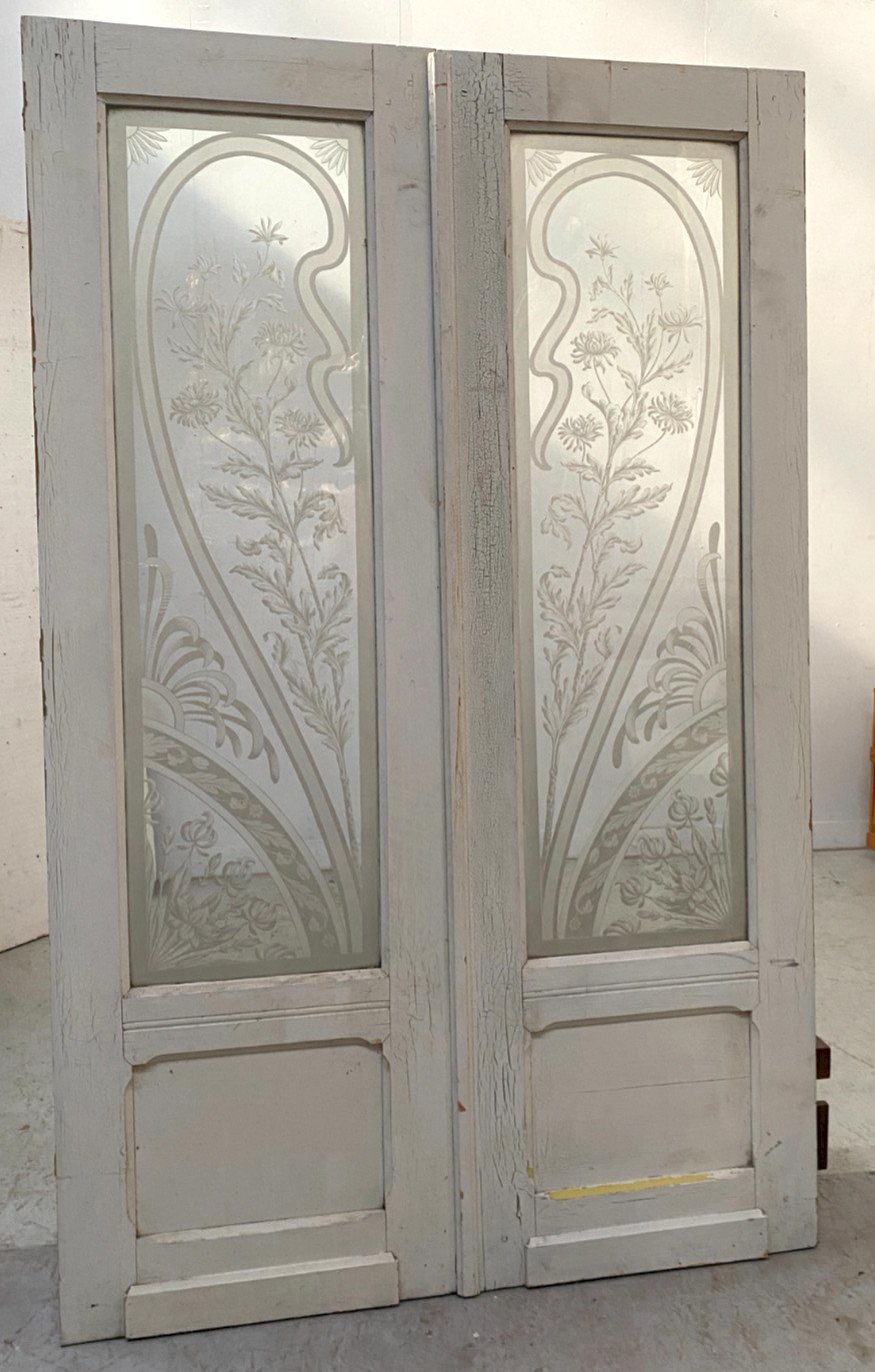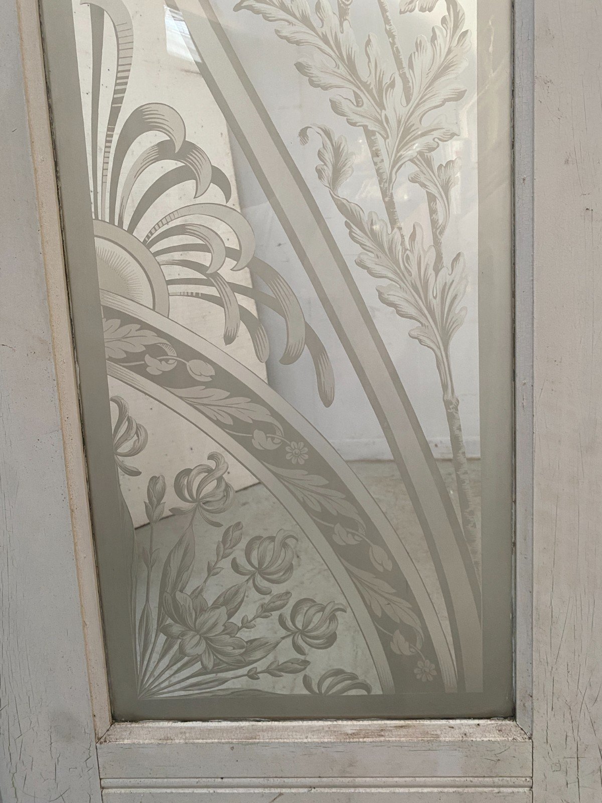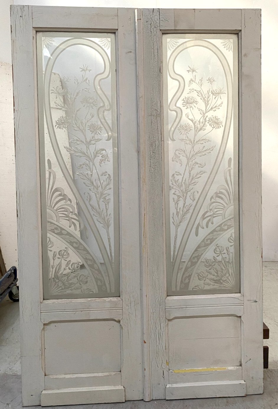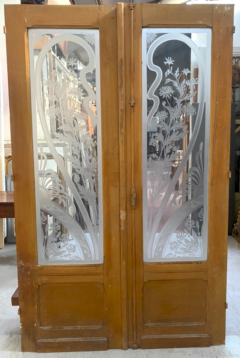 Double wooden and etched glass separation doors with a panel reserve at the bottom. Etched glass with a botanical motif. In good condition, sold without frame. Dimensions: H 224 x W 140 x D 3.5. Art Deco period. Type: Door. Country of origin: France. Height: 224. Material: Wood. Style: Art Nouveau. Length: 140. Width: 3.5.
