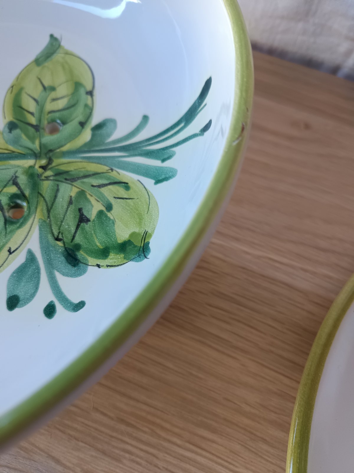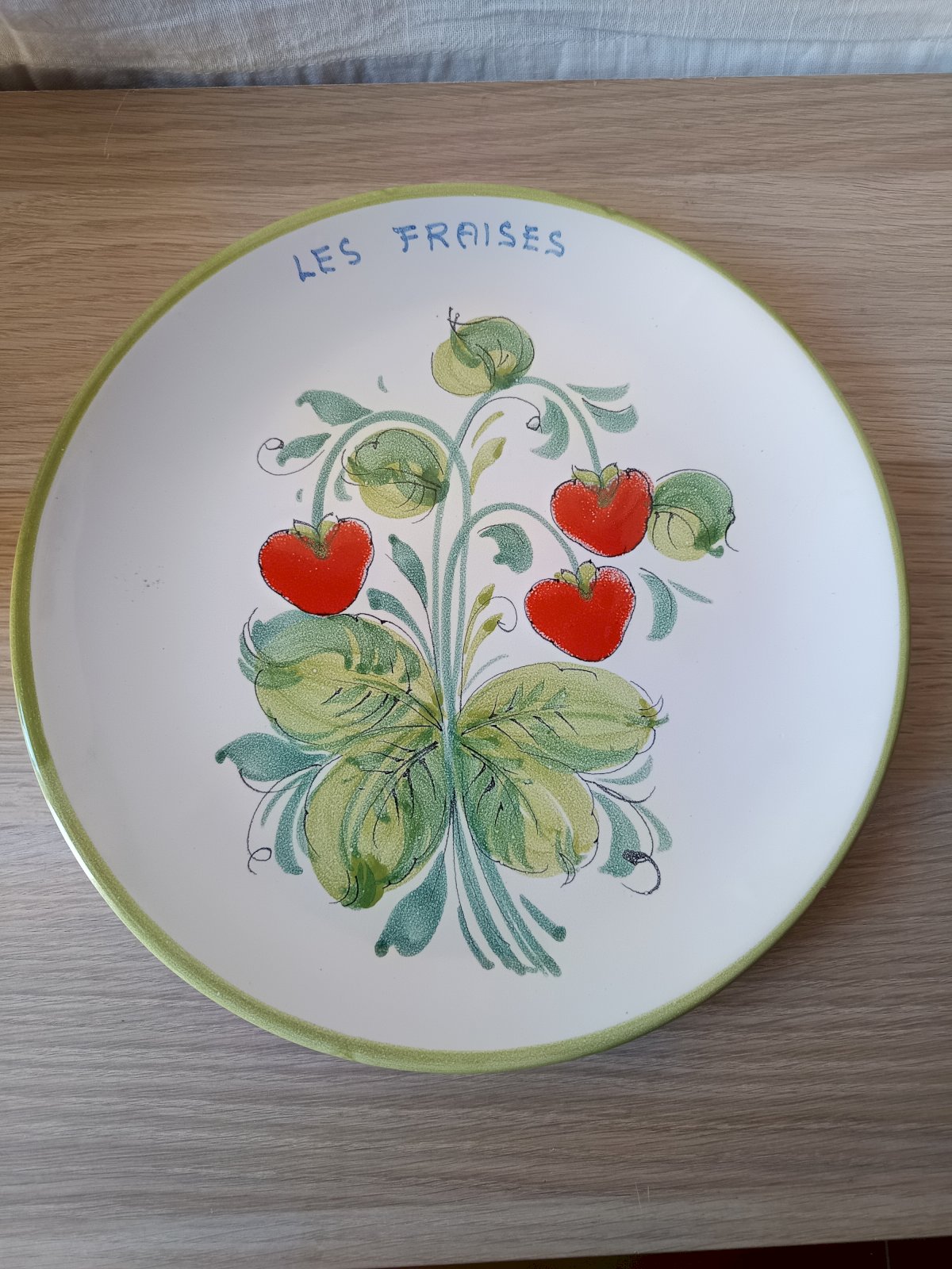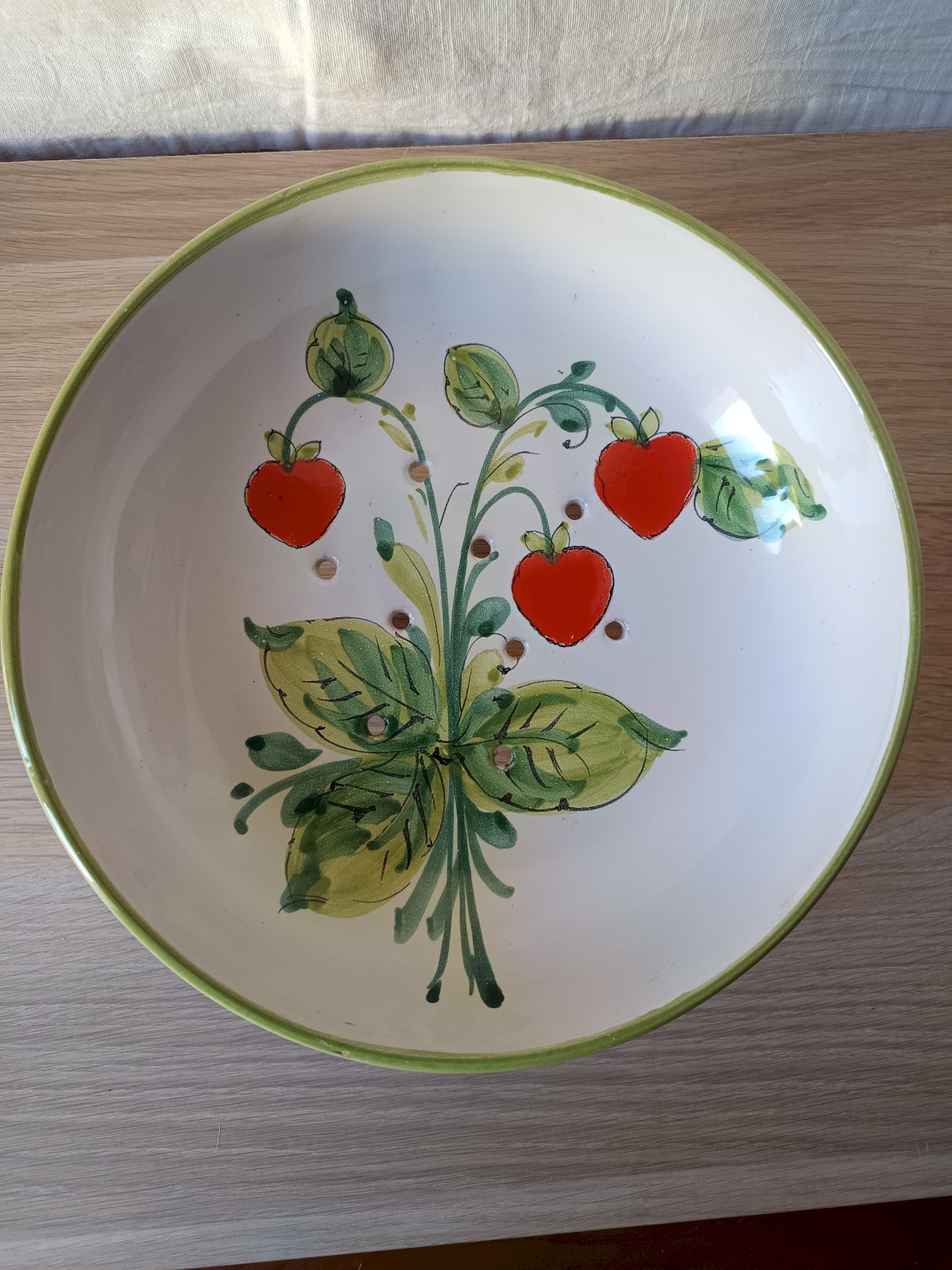 Beautiful French vintage set for serving strawberries (or other red fruits). Includes the drainer (pierced colander on three small feet) and its matching presentation dish, adorned with the mention "LES FRAISES" and a hand-painted country decoration.