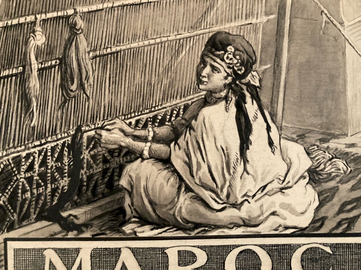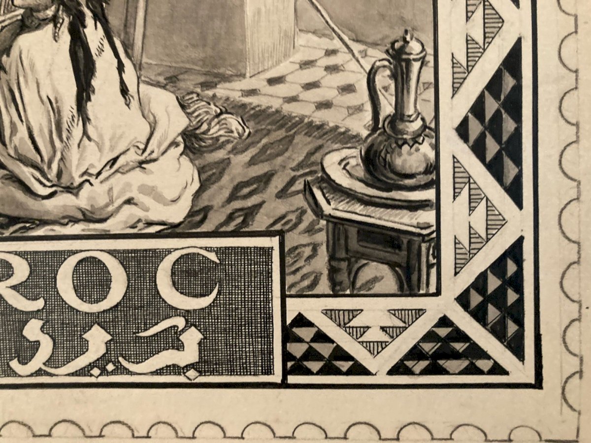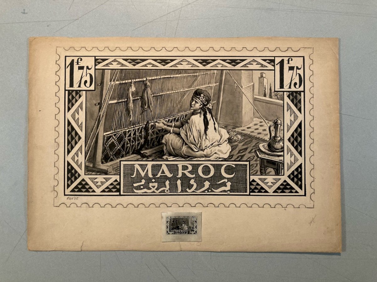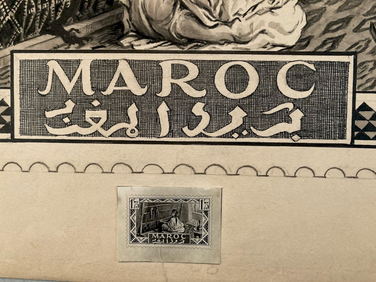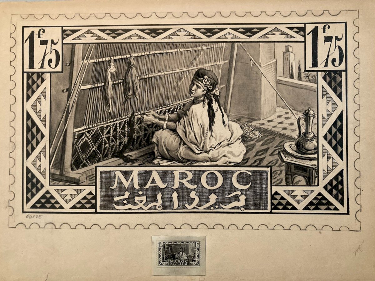 Achille OUVRÉ (1872–1951) Achille Ouvré is a French draftsman, illustrator, and engraver active in the first half of the 20th century, primarily known for his work in publishing and official imagery. Trained in the academic tradition of drawing and engraving, he collaborated with several administrations and publishing houses, notably in the philatelic field. He worked for the Post Administration, creating preparatory drawings and studies for stamps, particularly for the territories of the French Protectorate in Morocco. His work is part of the institutional orientalism movement, characterized by an idealized and architectural vision of North Africa, aimed at illustrating French cultural and administrative power. Ouvré excels in the representation of kasbahs, fortified towns, arid landscapes, and local life scenes, with a keen sense of composition, contrast, and graphic readability—essential qualities for stamp engraving. His preparatory drawings, rarely preserved, demonstrate a high level of technical mastery and are today sought-after documents at the intersection of art, colonial history, and philately. ⸻ Description of the work Stamp study – Morocco, Kelaa des Mgouna This is an original preparatory drawing created by Achille Ouvré for a Moroccan postage stamp project, depicting Kelaa des Mgouna, a famous fortified city in southern Morocco. Artistic description The composition shows a city of stacked kasbahs built of earth, overlooking a hilly landscape crossed by a river. In the foreground, figures in traditional clothing animate the scene, enhancing the orientalist and narrative character of the image. The architecture is treated with great geometric rigor, while washes and gradients add depth and atmosphere. The drawing is framed by a decorative cartouche incorporating typographic elements (face value, mention "MAROC," Arabic inscriptions), typical of projects intended for stamp engraving. The whole very faithfully foreshadows the stamp that was actually issued, of which a copy is visible for comparison. Technique and dimensions • Technique: ink drawing and wash (preparatory study for engraving) • Height: 36 cm • Support: paper • Period: around 1920–1930 • Artist: Achille Ouvré (1872–1951) ⸻ Interest and rarity Preparatory drawings for stamps are significantly rarer than the stamps themselves. They represent choice pieces for: • collectors of colonial philately, • enthusiasts of orientalism, • collectors of original 20th-century drawings, • historians of French colonial iconography. This work, due to its unusual size for a stamp study and its excellent level of finish, can be considered a reference piece of Achille Ouvré's work. Recommended products Provided by Recommended products Provided by Drawing Ink 1920 Stamp study orientalism Achille OUVRÉ Morocco Original See the product Drawing Ink 1920 Stamp study Morocco orientalism Achille OUVRÉ Original See the product Authenticity: Original Type: Drawing Country of origin: France Material: Ink Genre: Orientalism