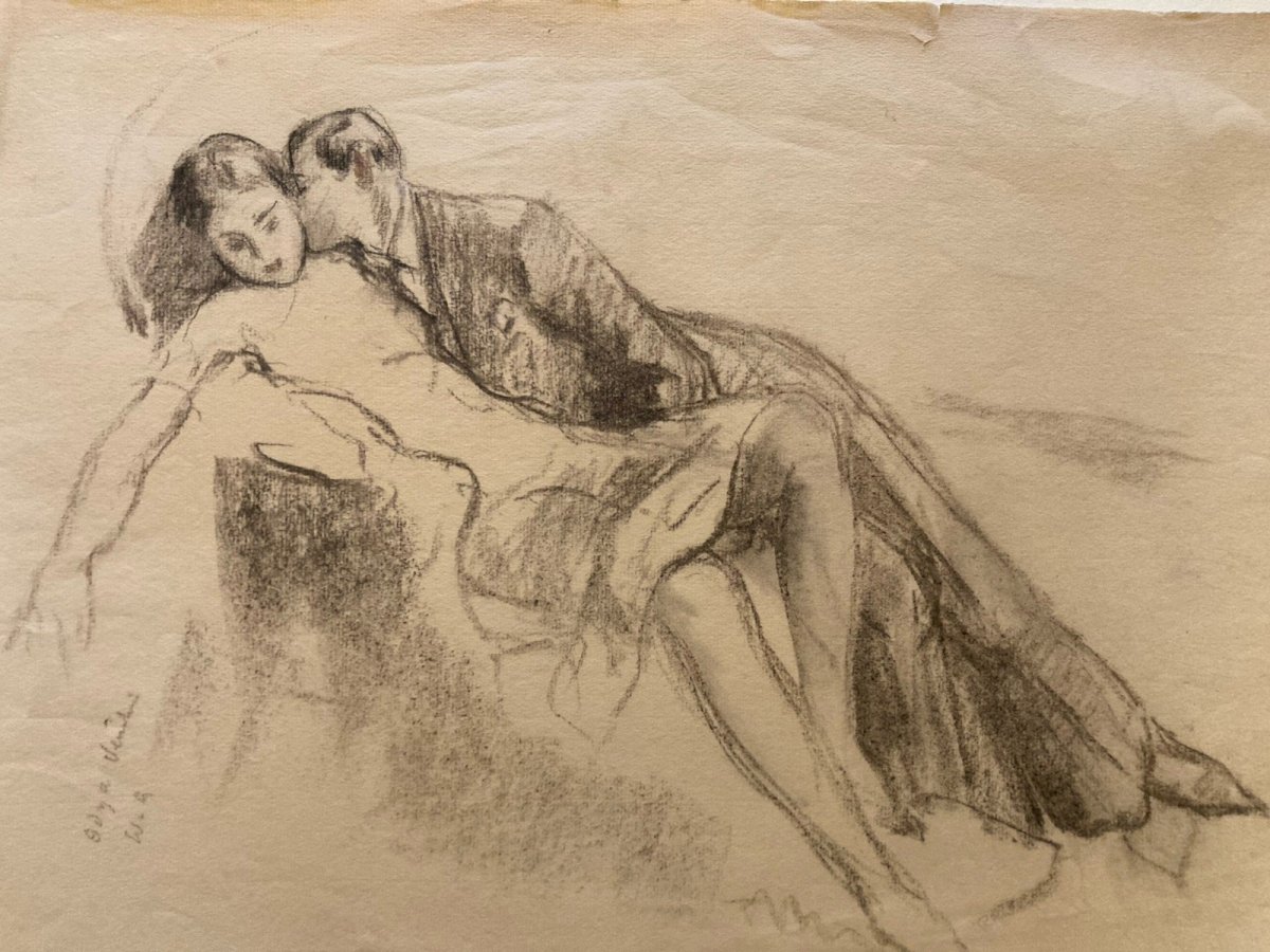 William Ablett (1877-1936) Painter, draftsman, and engraver of French origin with English roots, William Ablett is best known for his elegant portraits and intimate scenes. Trained at the École des Beaux-Arts in Paris, he exhibited as early as 1900 at the Salon des artistes français and at the Royal Academy in London. His work, marked by precise lines and great sensitivity, fits within the tradition of the great portraitists of the early 20th century. Description of the Artwork Pencil drawing representing a couple embraced in a tender and refined posture, typical of Ablett's style. The monogram "W. A" in the lower left corner attests to its authenticity. The treatment of the folds of the dress and the expressions on the faces highlight the artist's talent for capturing intimacy and elegance. Technical Characteristics Technique: Pencil drawing on paper Signature: Monogrammed W. A in the lower left corner Dimensions: see the last of the photos Delivery service: Colissimo Recommended Products Provided by Very Beautiful Old Drawing Study Pencil Paper Woman Erotic 1950 to identify See the product Very Beautiful Old Drawing Pencil Woman Classical Study 1980 To Identify Eroticism See the product Very Beautiful Old Drawing Pencil Ink Woman Classical Study 1950 Yvonne DEGUÉRET See the product Recommended Products Provided by Drawing Old Pencil Woman 1920 Old Original Classic Antique Art Deco See the product Old Drawing Art 19th Pencil Woman Classical Study To Identify Drawing 1850 See the product Genre: Art Deco Authenticity: Original Type: Drawing Period: 20th Century and Contemporary Country of Origin: France Material: Pencil Style: 1930 Theme: Character