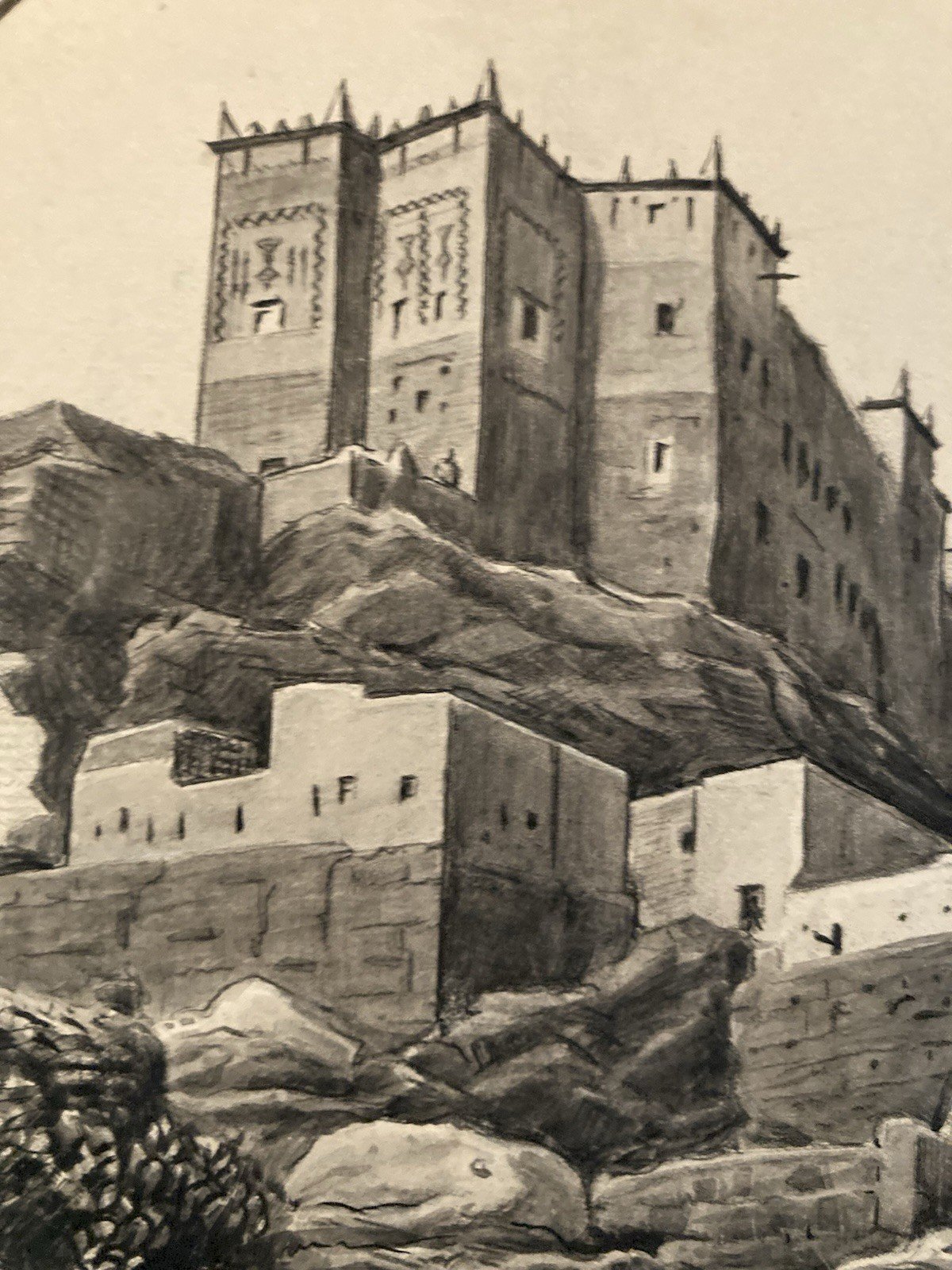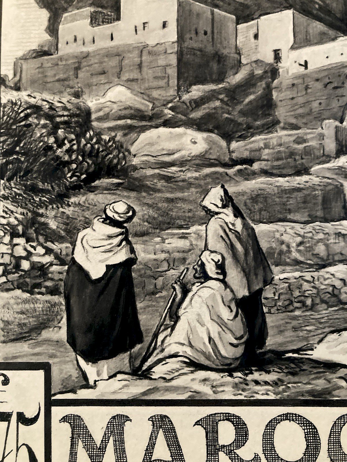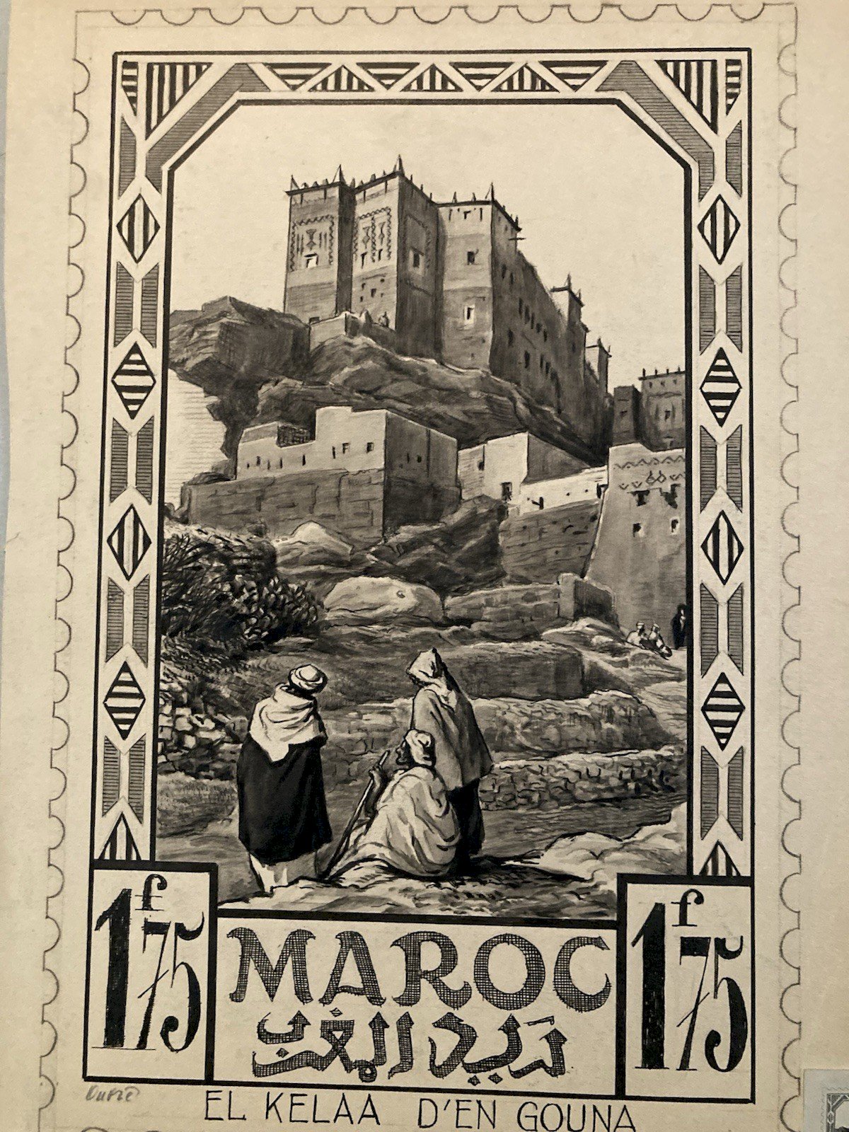 Achille OUVRÉ (1872–1951) Achille Ouvré was a French draftsman, illustrator, and engraver active in the first half of the 20th century, mainly known for his work in publishing and official imagery. Trained in the academic tradition of drawing and engraving, he collaborated with several administrations and publishing houses, particularly in the philatelic field. He worked for the Post Administration, producing preparatory drawings and studies for stamps, especially for the territories of the French Protectorate in Morocco. His work falls within the institutional Orientalist movement, characterized by an idealized and architectural vision of North Africa, intended to illustrate French cultural and administrative power. Ouvré excelled in representing kasbahs, fortified cities, arid landscapes, and scenes of local life, with a keen sense of composition, contrast, and graphic readability—essential qualities for stamp engraving. His preparatory drawings, rarely preserved, testify to a high level of technical mastery and are today sought-after documents at the intersection of art, colonial history, and philately. ⸻ Description of the work Study of Stamp – Morocco, Kelaa des Mgouna This is an original preparatory drawing created by Achille Ouvré for a Moroccan postage stamp project, depicting the Kelaa des Mgouna, a famous fortified town in southern Morocco. Artistic description The composition shows a city of stacked kasbahs, built of earth, dominating a hilly landscape crossed by a river. In the foreground, figures in traditional clothing animate the scene, reinforcing the Orientalist and narrative character of the image. The architecture is treated with great geometric rigor, while the washes and gradations add depth and atmosphere. The drawing is framed by a decorative cartouche incorporating typographic elements (face value, mention "MAROC," Arabic inscriptions), typical of projects intended for stamp engraving. The overall composition closely resembles the stamp actually issued, of which a comparison copy is visible. Technique and dimensions • Technique: ink drawing and wash (preparatory study for engraving) • Height: 36 cm • Support: paper • Period: around 1920–1930 • Artist: Achille Ouvré (1872–1951) ⸻ Interest and rarity Preparatory drawings for stamps are significantly rarer than the stamps themselves. They constitute choice pieces for: • collectors of colonial philately, • fans of Orientalism, • collectors of original drawings from the 20th century, • historians of French colonial iconography. This work, due to its unusual size for a stamp study and its excellent level of finish, can be considered a reference piece of Achille Ouvré's work. Recommended products Provided by Recommended products Provided by Drawing Ink 1920 Study Orientalism Achille OUVRÉ Morocco Original See product Drawing Ink 1920 Study Orientalism Achille OUVRÉ Morocco Portrait Art See product Authenticity: Original Type: Drawing Country of origin: France Material: Ink Genre: Orientalism