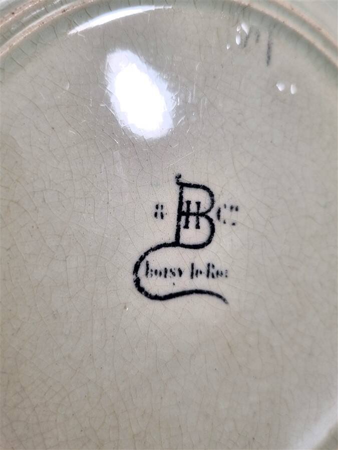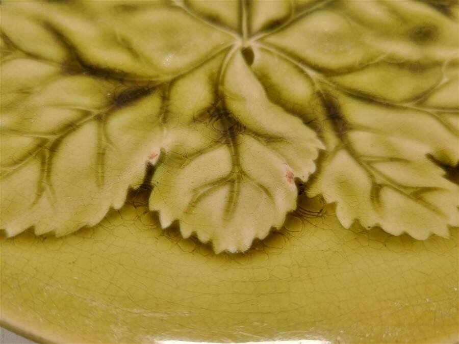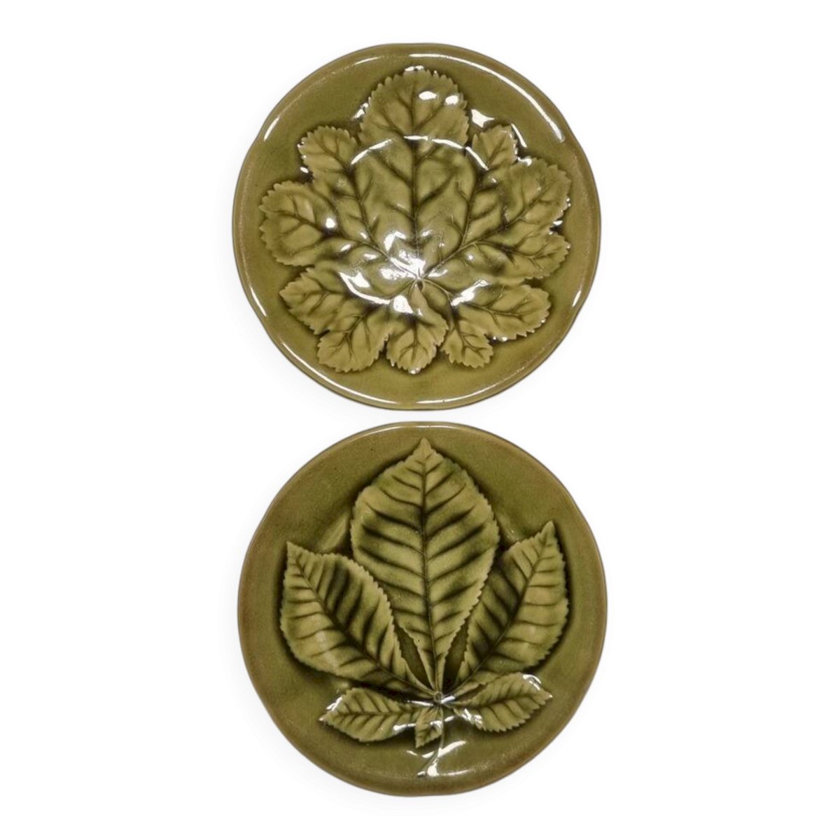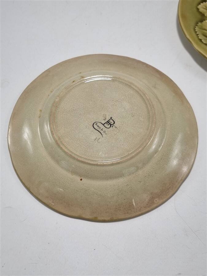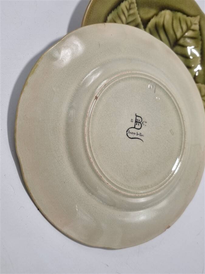 Pair of dessert plates in faience, stamped H.B. & Cie, Choisy-Le-Roi. Relief leaf decoration. One of the two shows signs of use on the inside of the plate and has a chip on the lower edge.