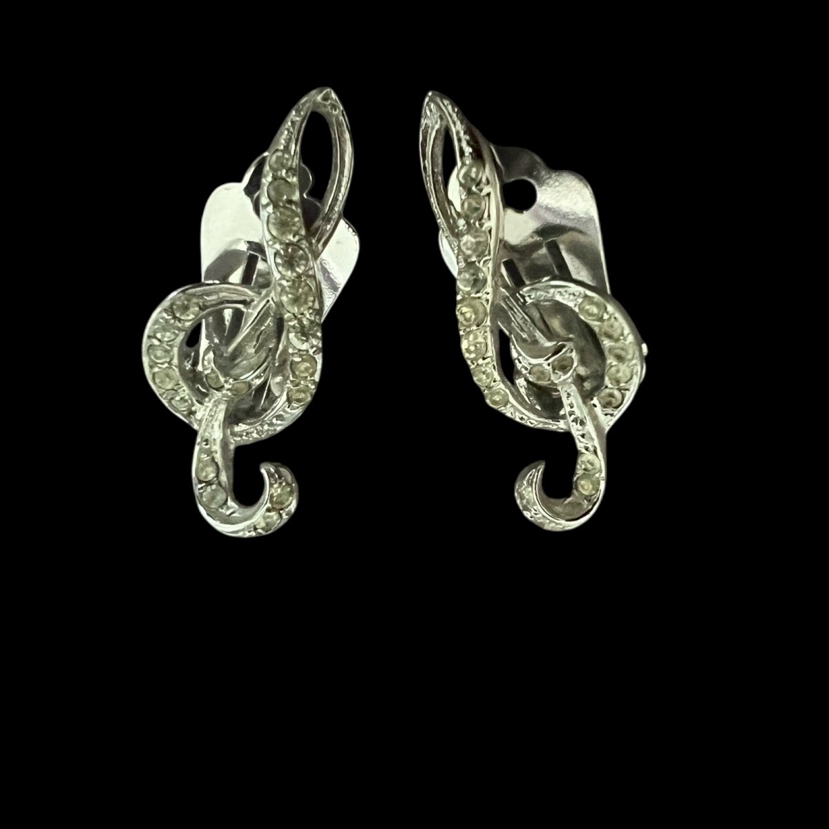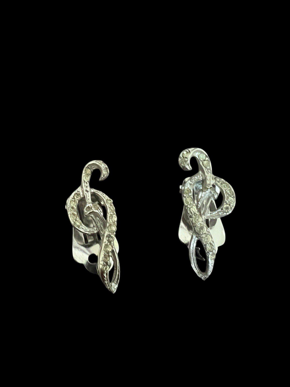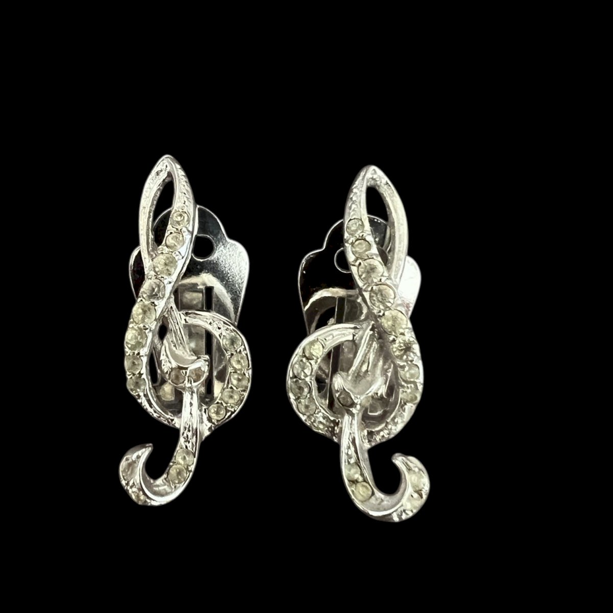 Pair of earrings circa 1950/1960 in solid silver representing a vintage treble clef set with rhinestones. Dimensions approximately 2.5 cm by 1 cm. Weight approximately 4.9 g for the 2 earrings. The fastening system is fully functional. These earrings have been tested with an appropriate acid for silver and are made entirely of silver. If they appear chrome-plated, it is because they have undergone an additional treatment. This is a specific bath called silver, rhodium-plated, which gives a permanent shine to the silver and prevents silver jewelry from oxidizing. Condition: Used: Item has been worn...Used: Item has been worn. any potential imperfections. Dominant stone: Rhinestones. Brand: Vintage. Type: Clips. Dominant color: Silver. Clasp: Clips. Material: N Metal: Sterling silver.