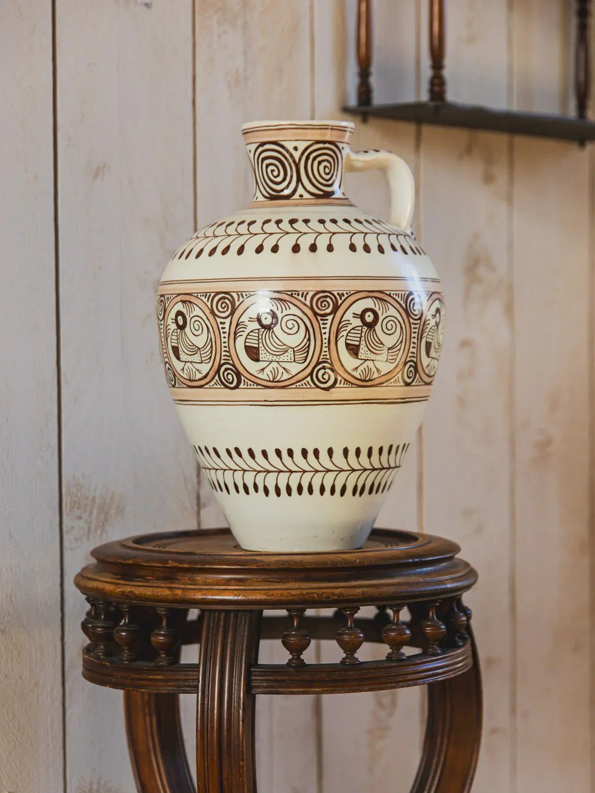 Invite this ceramic vase with a single handle, dating from the 70s in Spain, adorned with a delicate hand-painted bird motif. Its balanced silhouette and sculpted handle provide an elegant grip, making it an ideal vessel for short bouquets or a decorative object on a console. The subtle palette and craftsmanship instill a warm and poetic ambiance that dresses the space without weighing it down. Slight discreet signs of time. Height: 40 cm Diameter: 22 cm Condition: Used item. Item shows some superficial wear marks, fully operational and functioning properly. It may be a display model or an item returned to the store after a short period of use. Possible imperfections. Brand: Debongout Type: Vintage product Material: Ceramic Style: Contemporary
